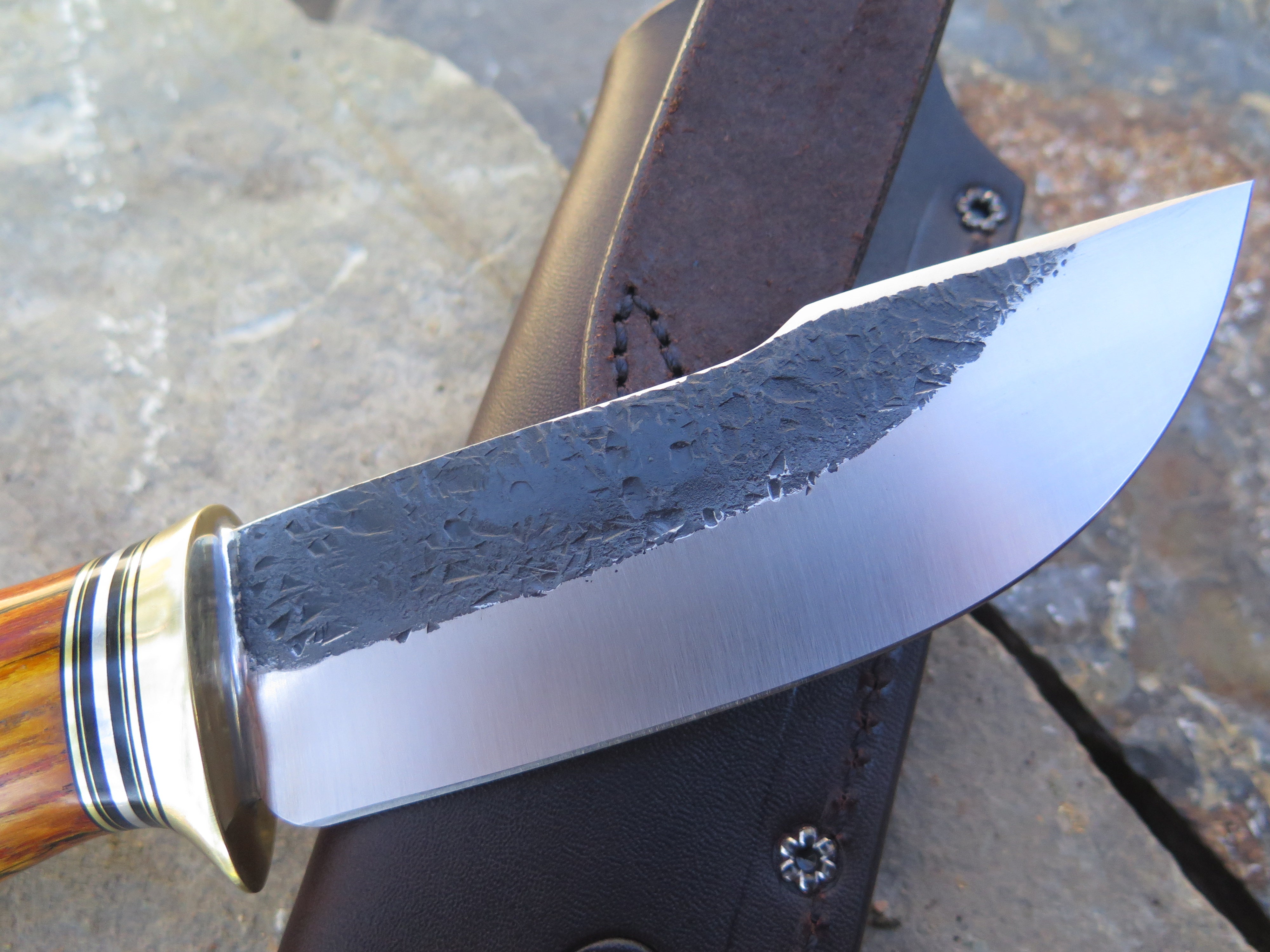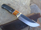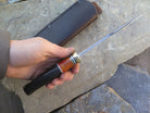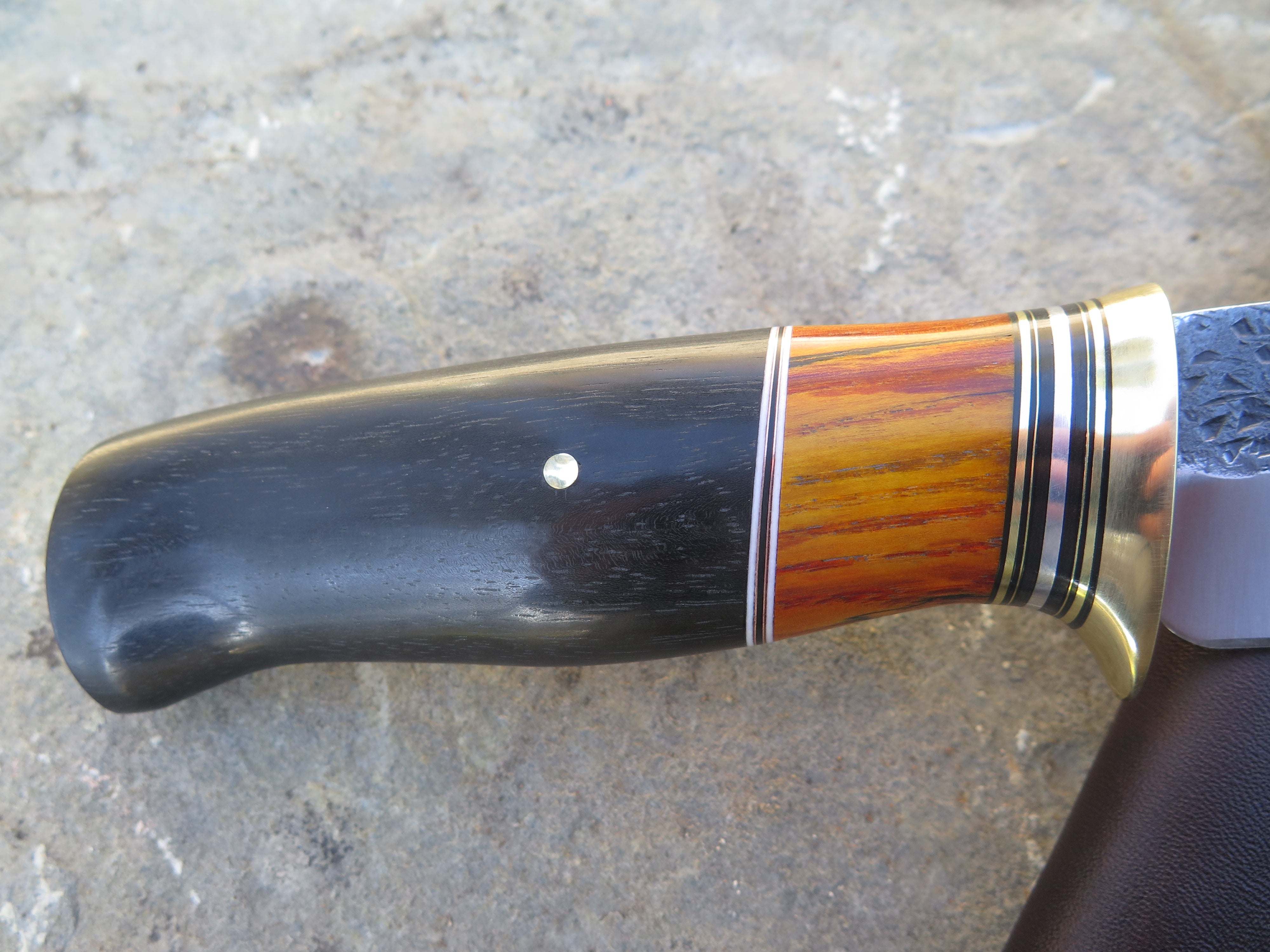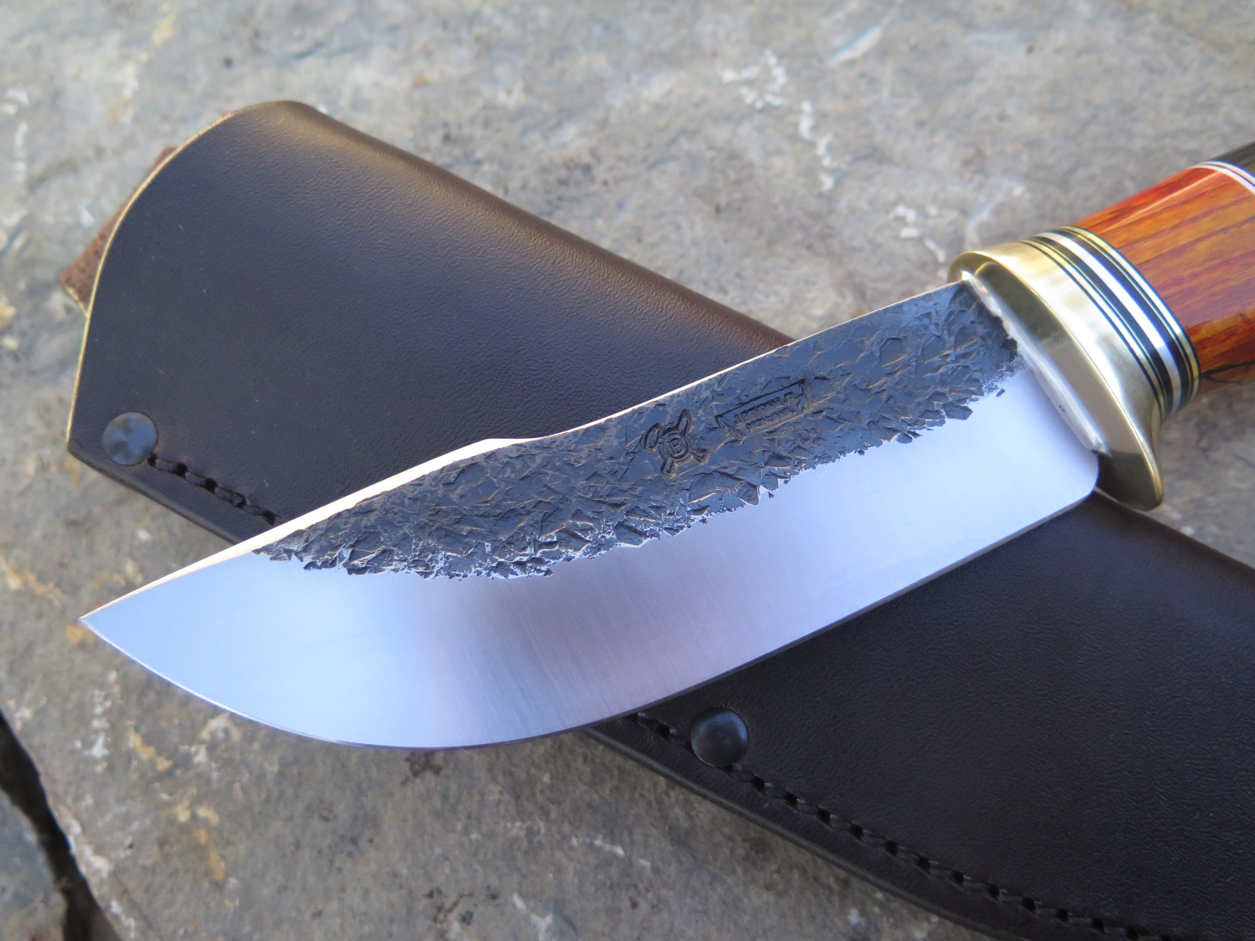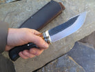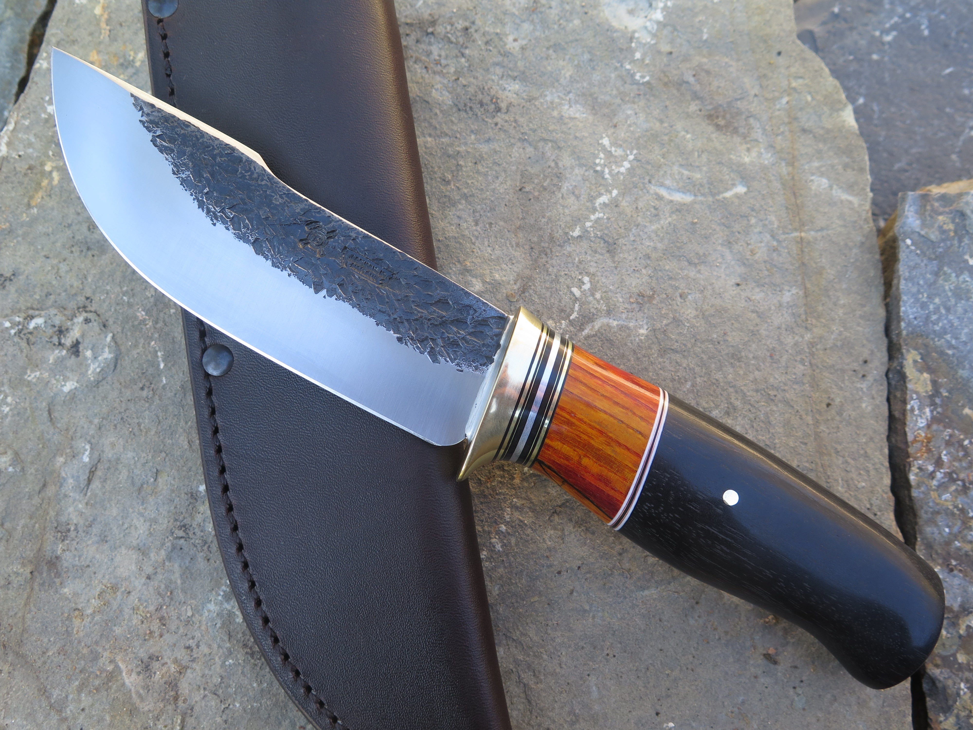 This beastly new Behring Made© Woodcraft is hand forged from 3/16" thick high carbon 01 tool steel and it measures 5 1/4" from tip to guard with a razor sharp hollow grind and our hammermark finish. The brass guard is soldered in place above an array of stabilized beech wood, black and white fiber, brass, aluminum and copper spacers as well as a premium African ebony wood handle that's pinned through the tang with brass. The overall length measures 10" and this one comes in a classic leather belt pouch sheath.