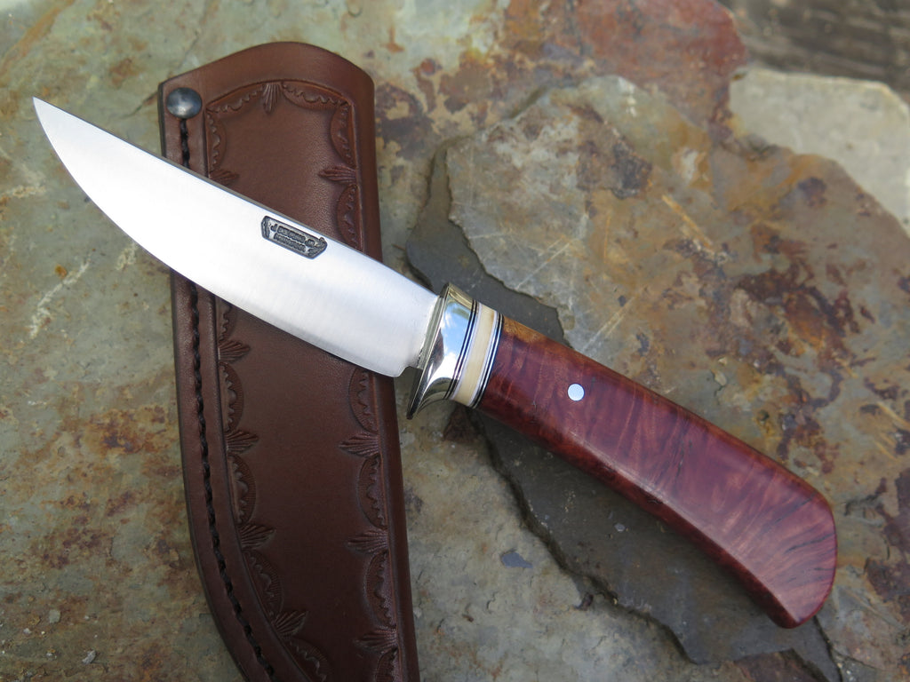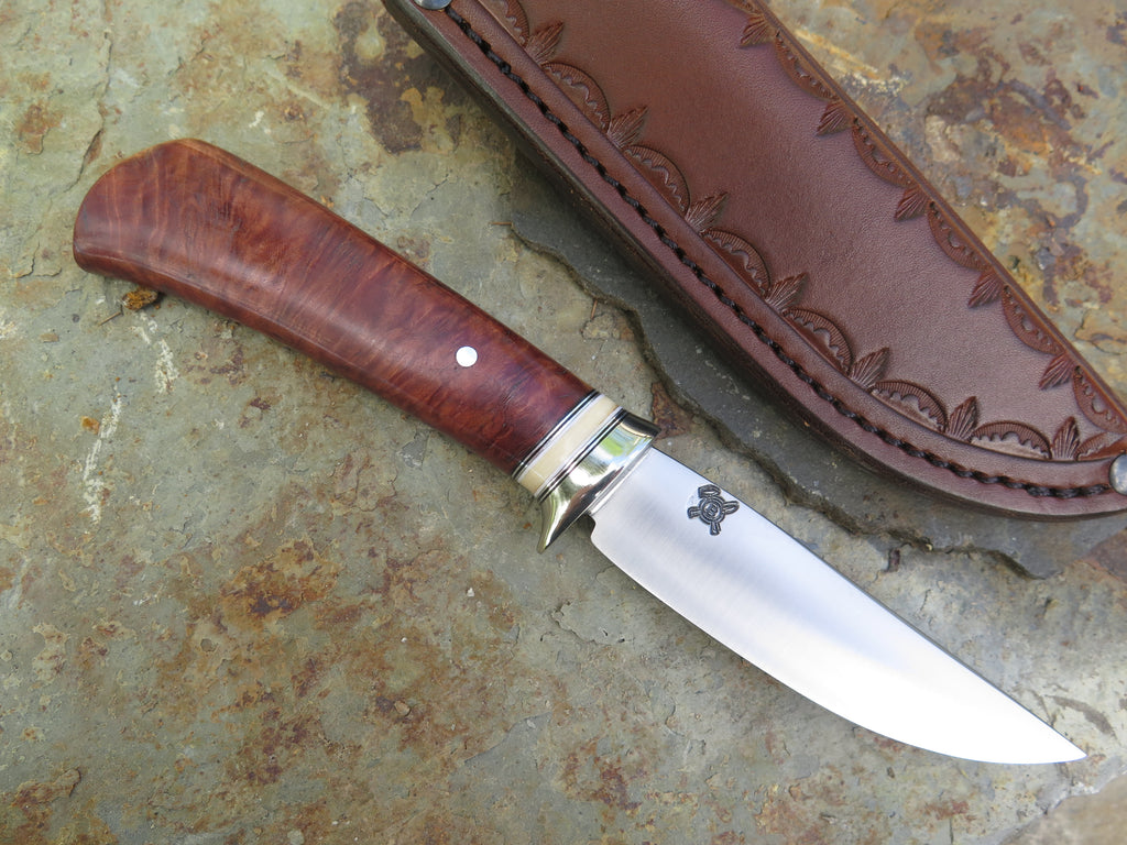This incredible Behring Made© Pintail is hand forged from 1/8" thick high carbon 01 tool steel and it measures 3 3/4" from tip to guard with a razor sharp convex grind. The nickel silver guard is soldered in place above black and white fiber, aluminum and ancient mammoth ivory spacers as well as a gorgeous amboyna burl wood handle. The aluminum pin runs through the tang and the overall length measures 8", plus it comes in a tooled leather belt pouch sheath- field ready!