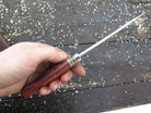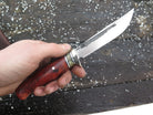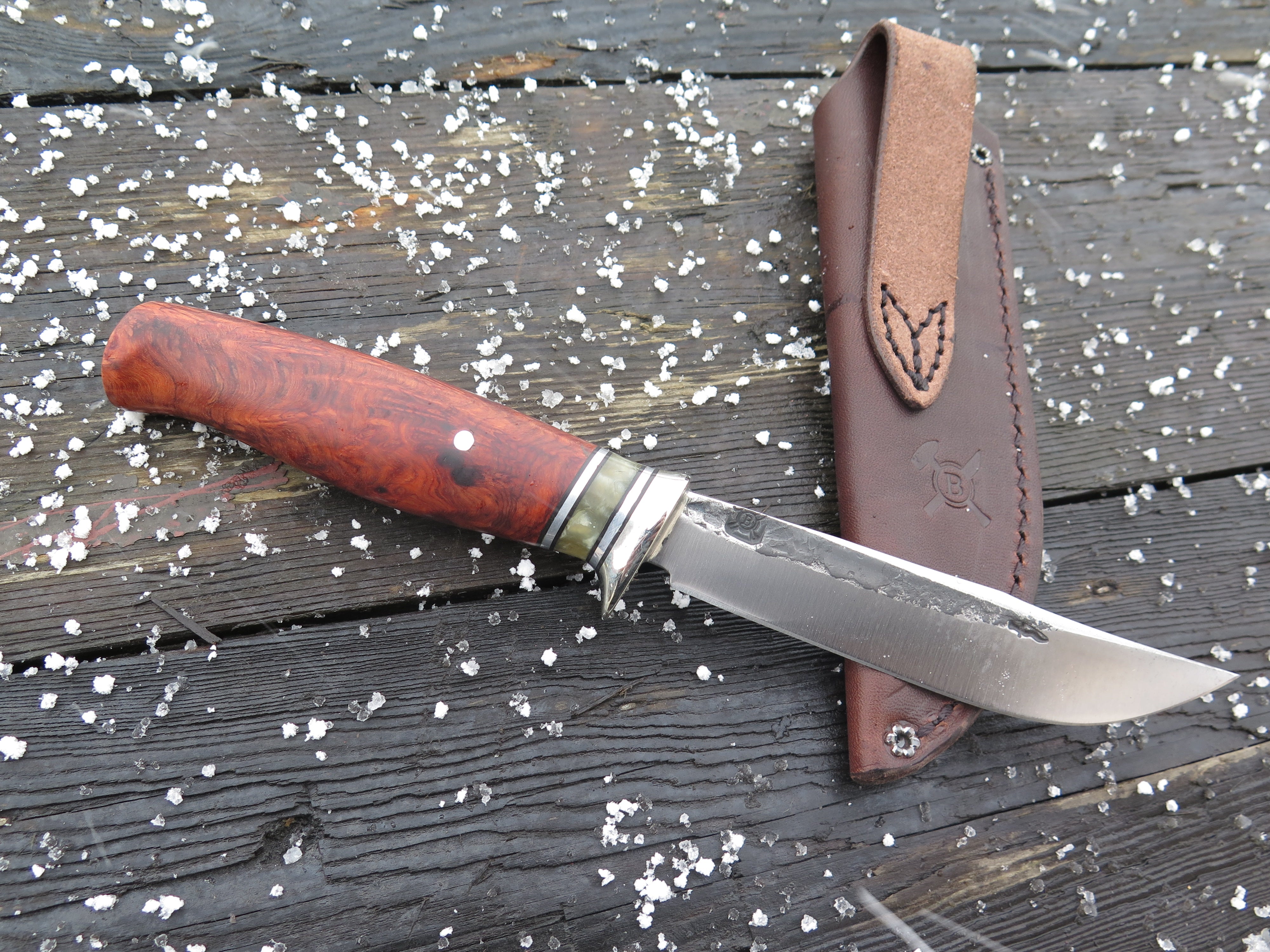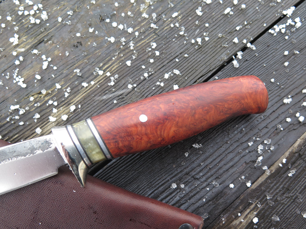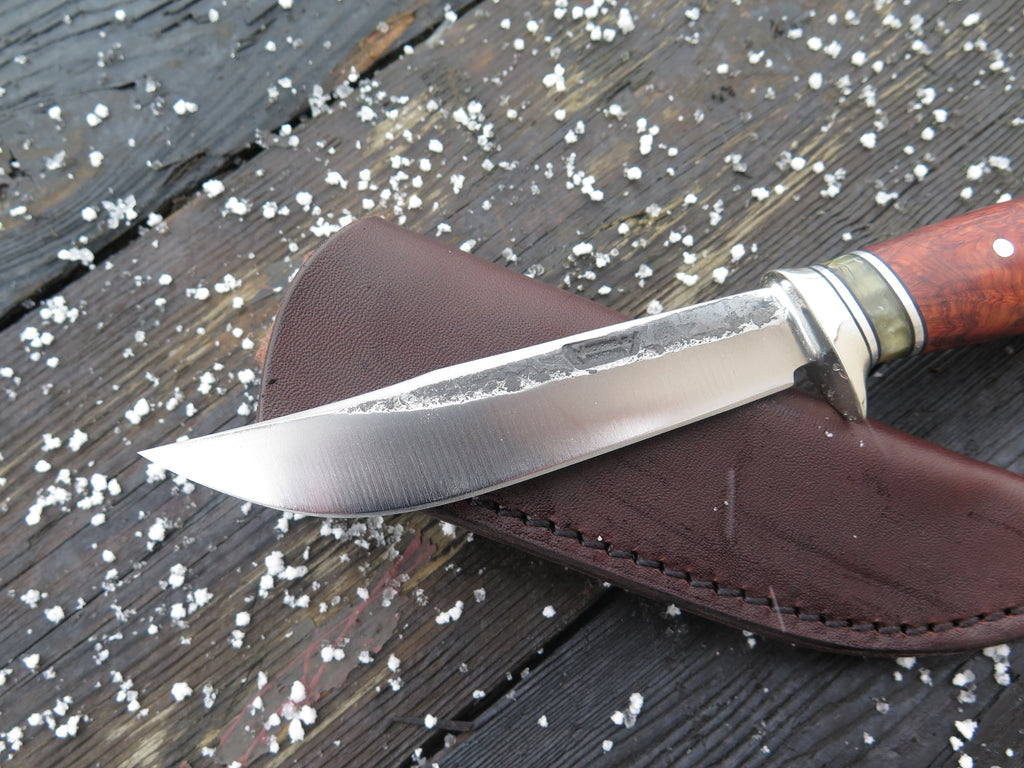 This incredible recurve Trout & Bird from Behring Made© is hand forged from 3/16" thick high carbon 01 tool steel and it measures 4 1/2" from tip to guard with a razor sharp hollow grind and our hammermark finish. The nickel silver guard is soldered in place above black fiber, aluminum and musk ox boss spacers above a wonderful handle of amboyna burl that's pinned through the tang with aluminum. The overall length measures 8 7/8" and it comes in a classic pouch style sheath.