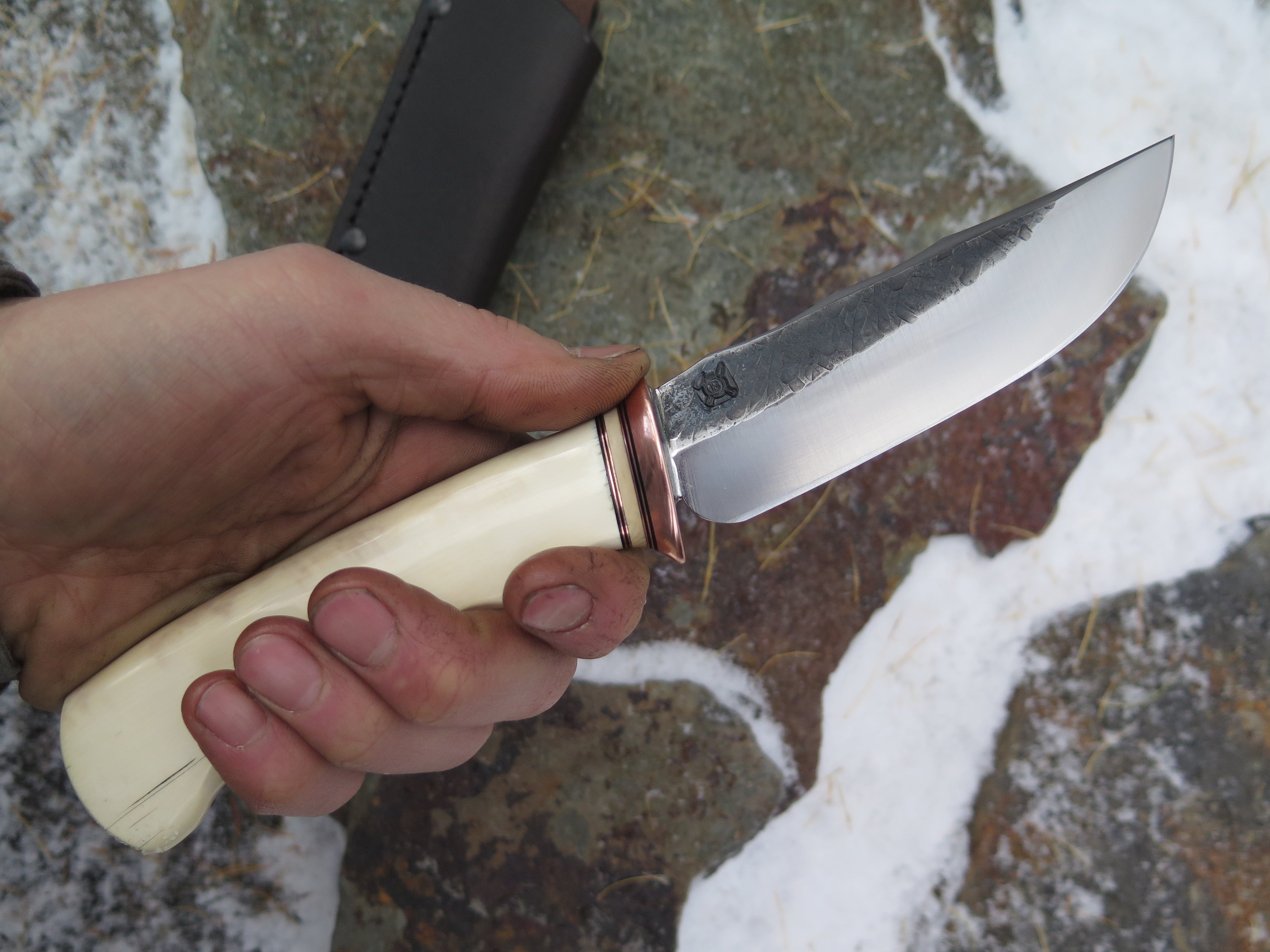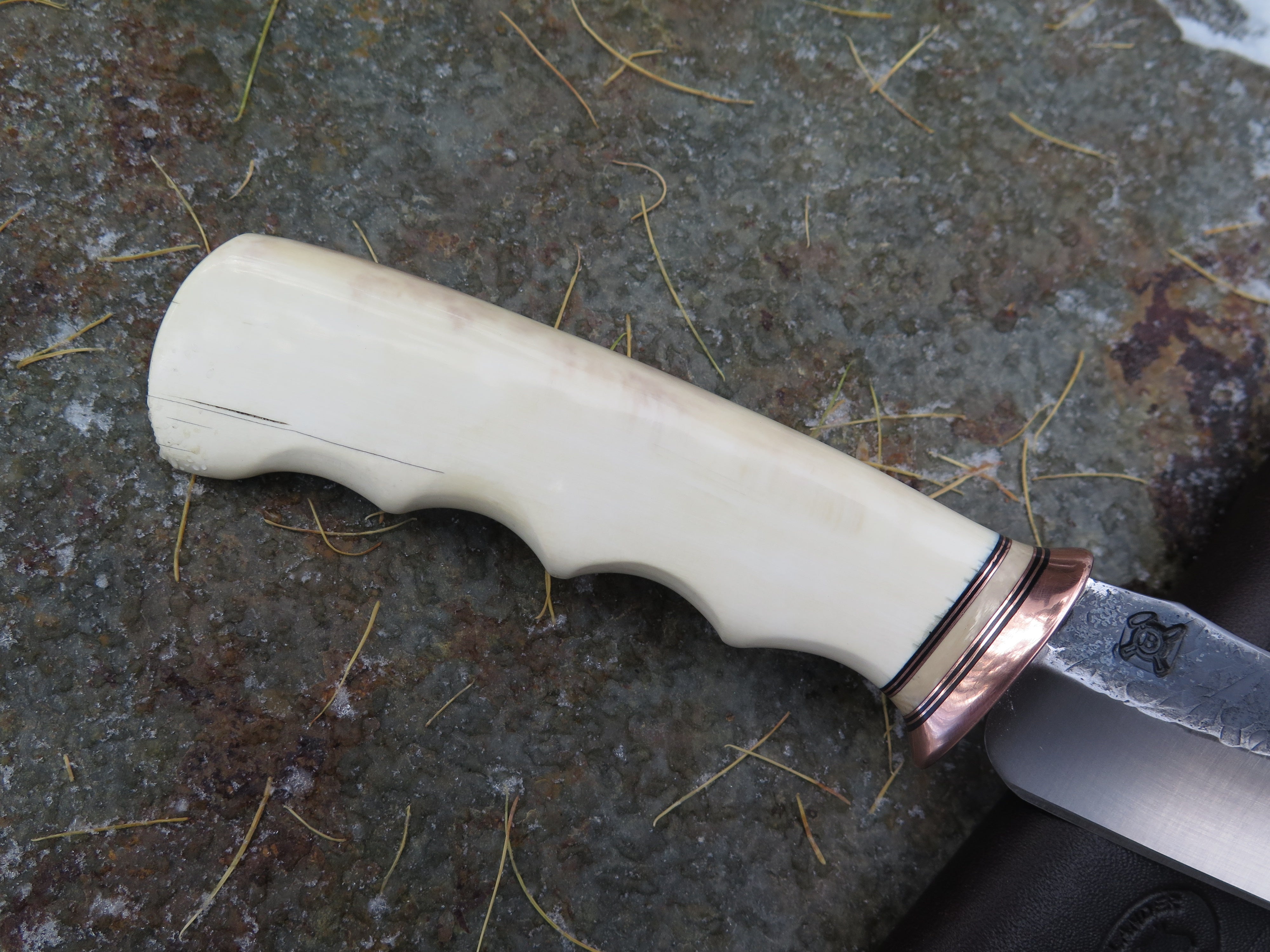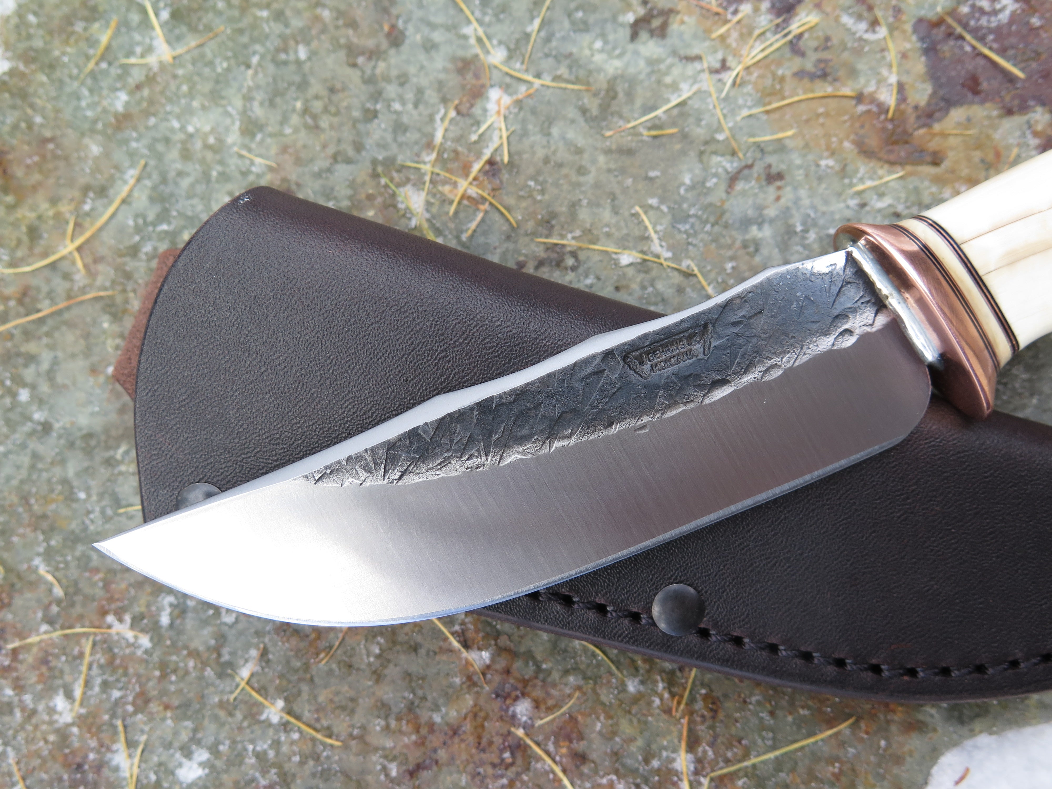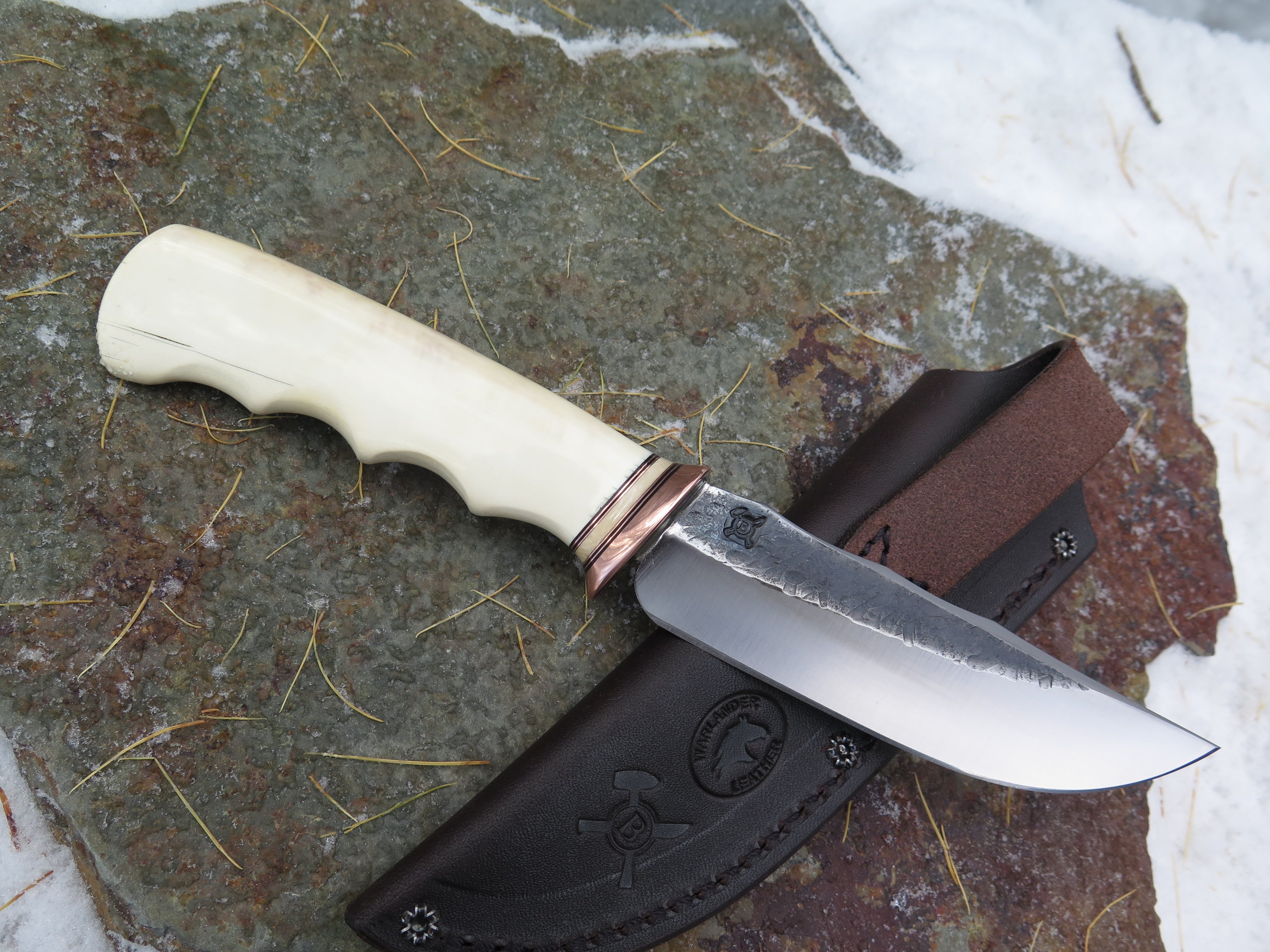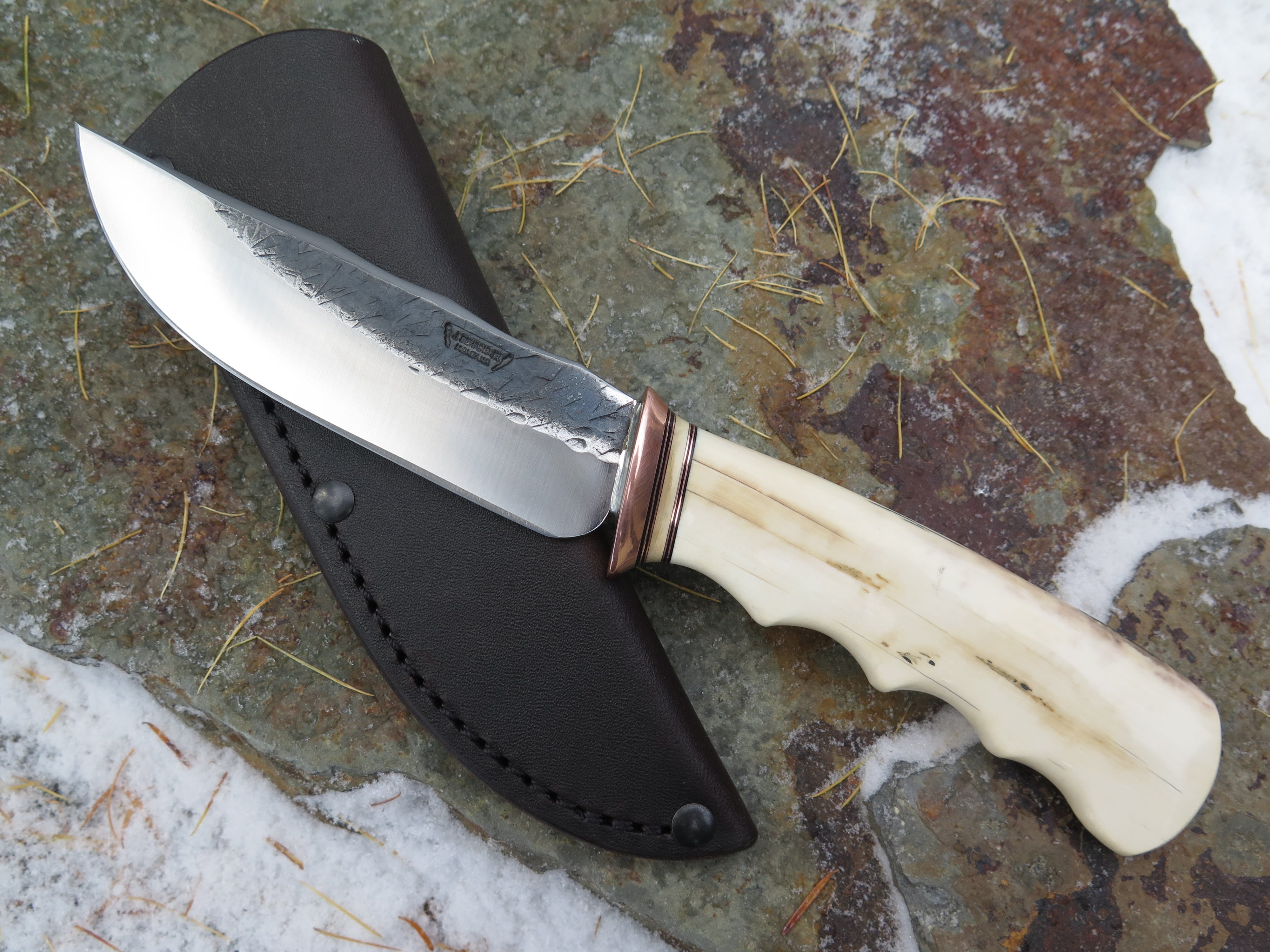 This remarkable new triple clip Tribute from Behring Made© is hand forged from 3/16" thick high carbon 01 tool steel and measures 4 3/4" from tip to guard with a razor sharp hollow grind and our hammermark finish. The copper guard is soldered in place above black fiber, copper and mammoth spacers as well as an ancient mammoth ivory handle with a finger grip grind and a copper pin through the tang. The overall length measures 9 1/4" and it comes in the shown leather belt pouch sheath, though substitutions are available upon request.
