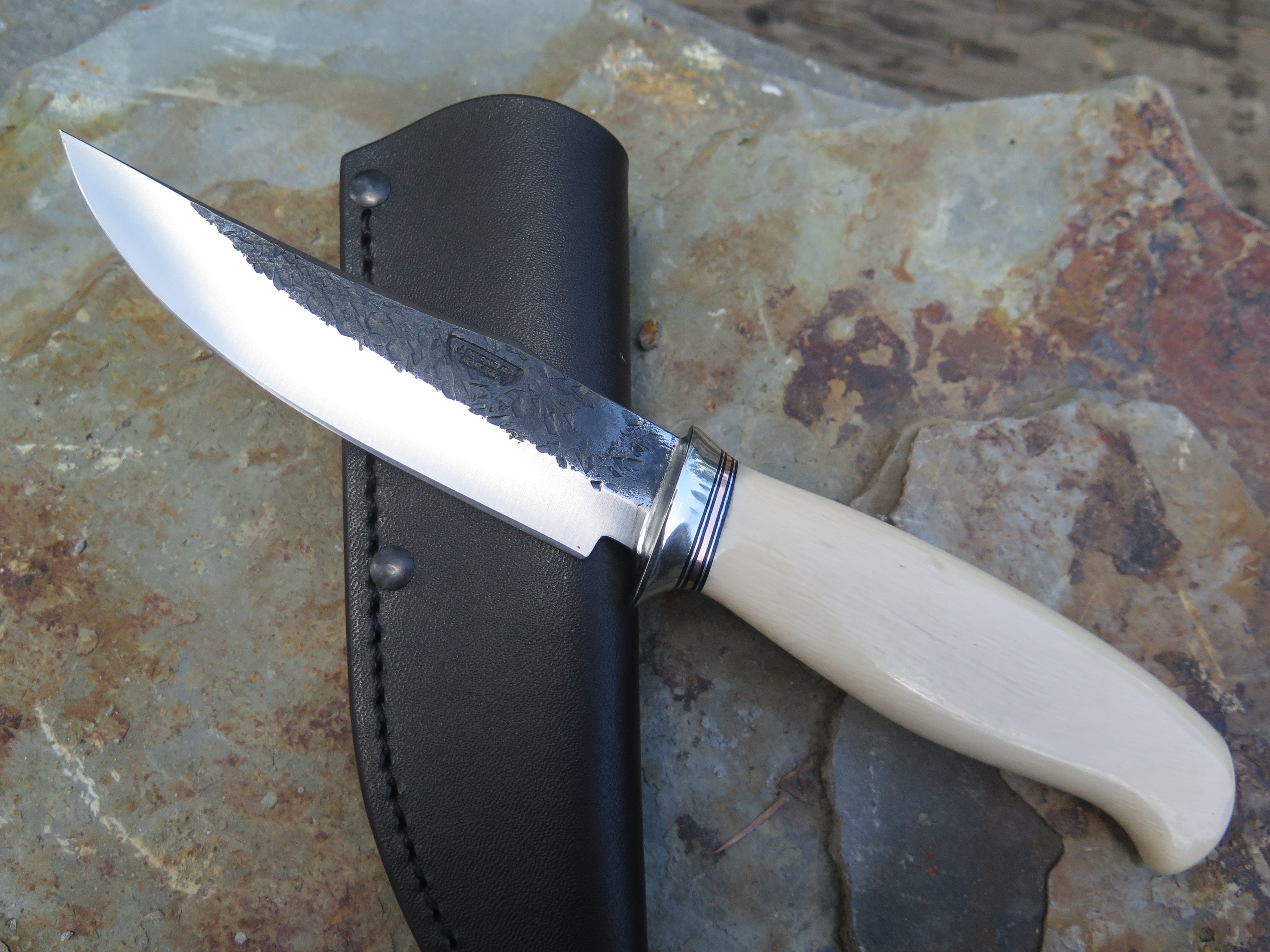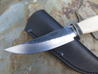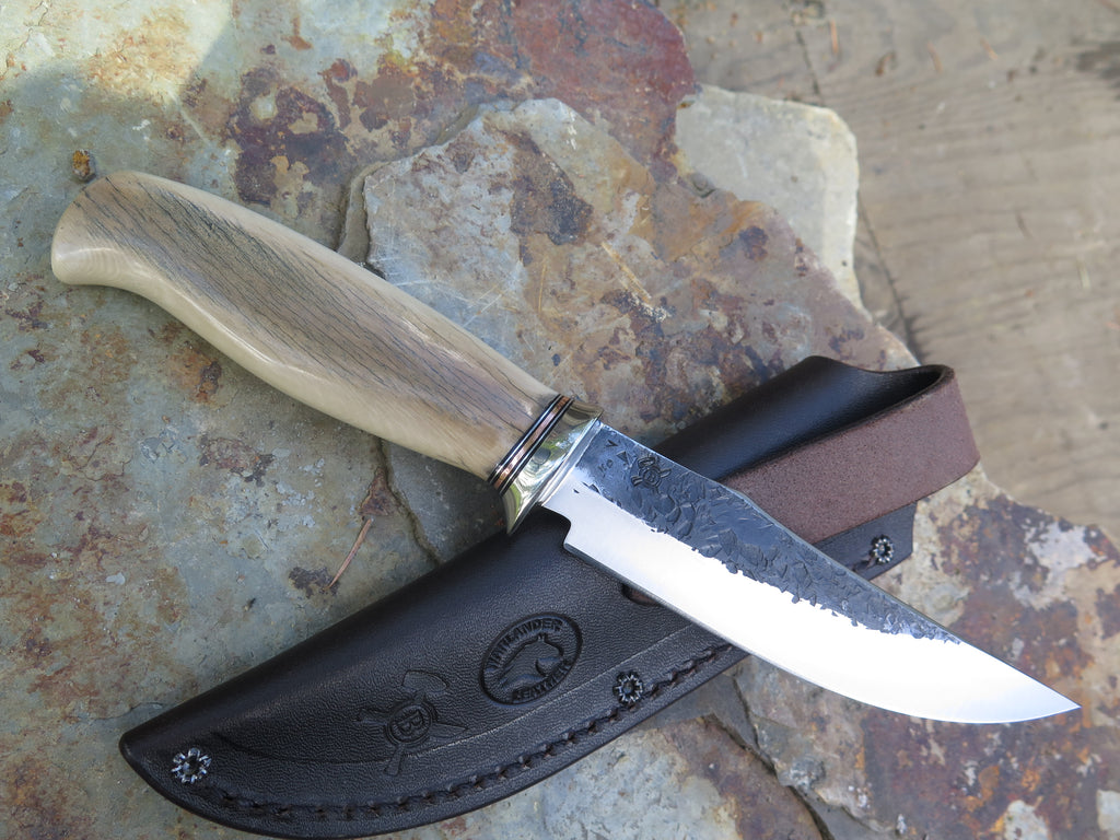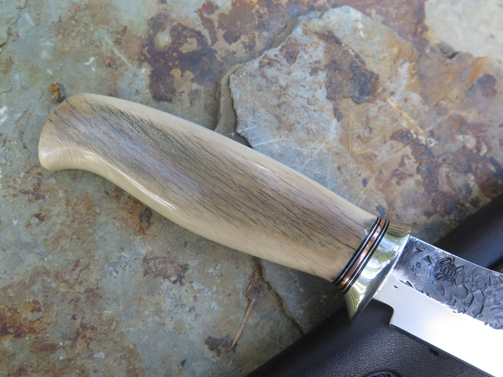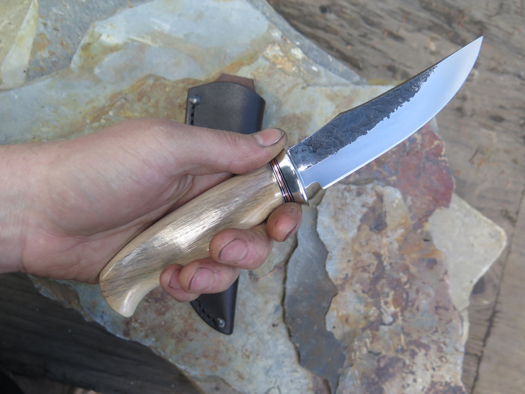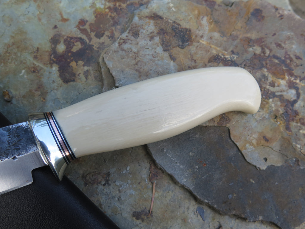 This incredible Behring Made© Clip Point is hand forged from 1/8" thick high carbon 01 tool steel and it measures 5" from tip to guard with a razor sharp hollow grind and our hammermark finish. The nickel silver guard is soldered in place above black fiber, aluminum and copper spacers which meet an ancient mammoth ivory handle with a beautiful range of light cream tones to earth browns. The overall length measures 9 3/8" and it comes in a classic leather belt pouch sheath.