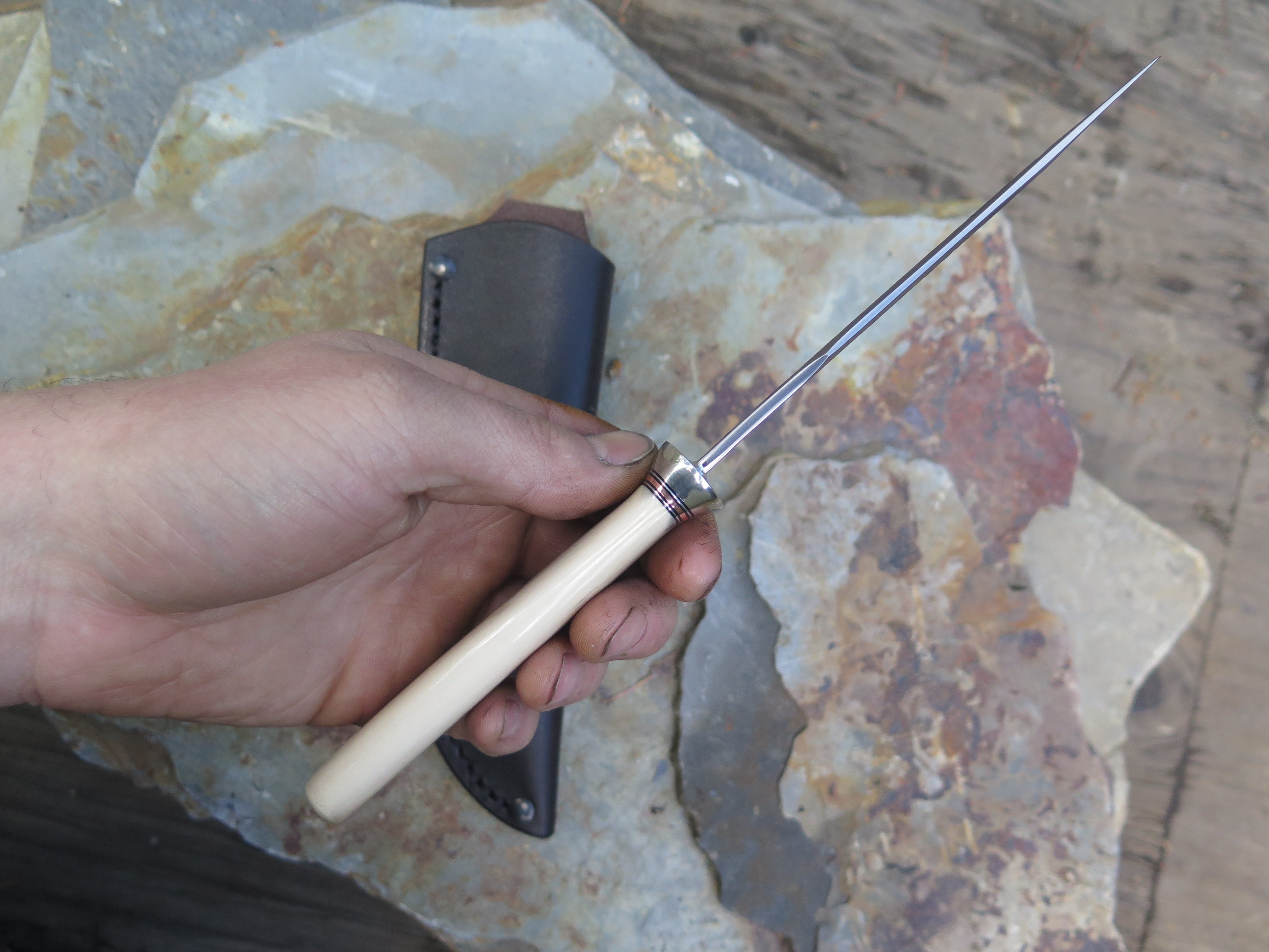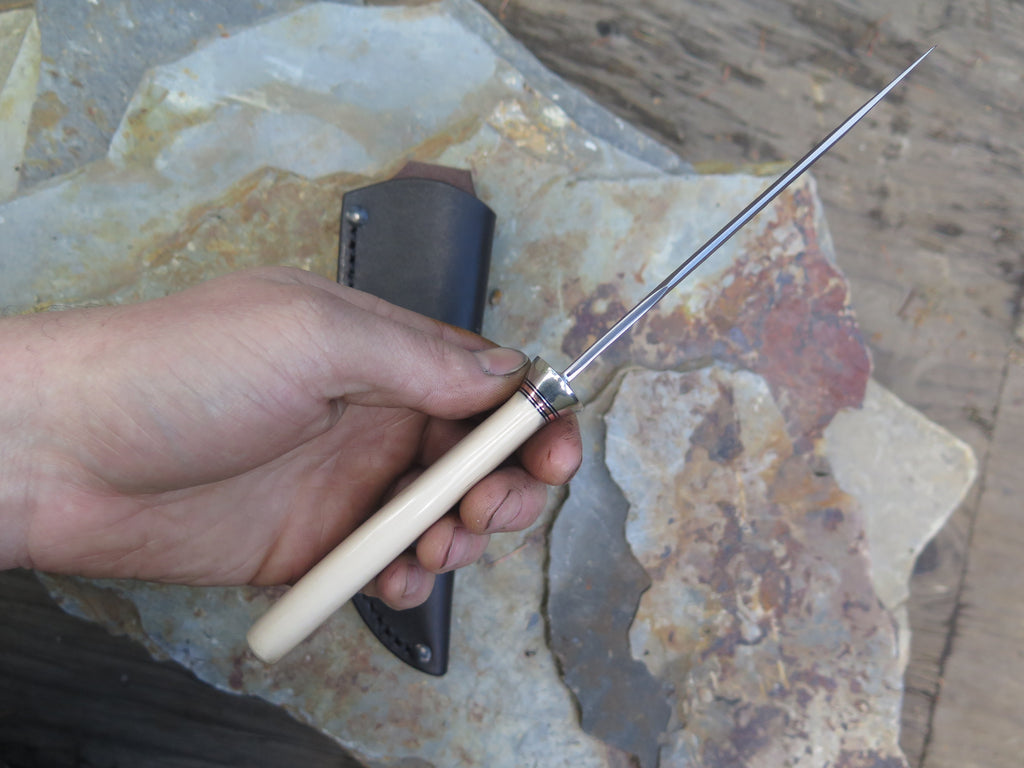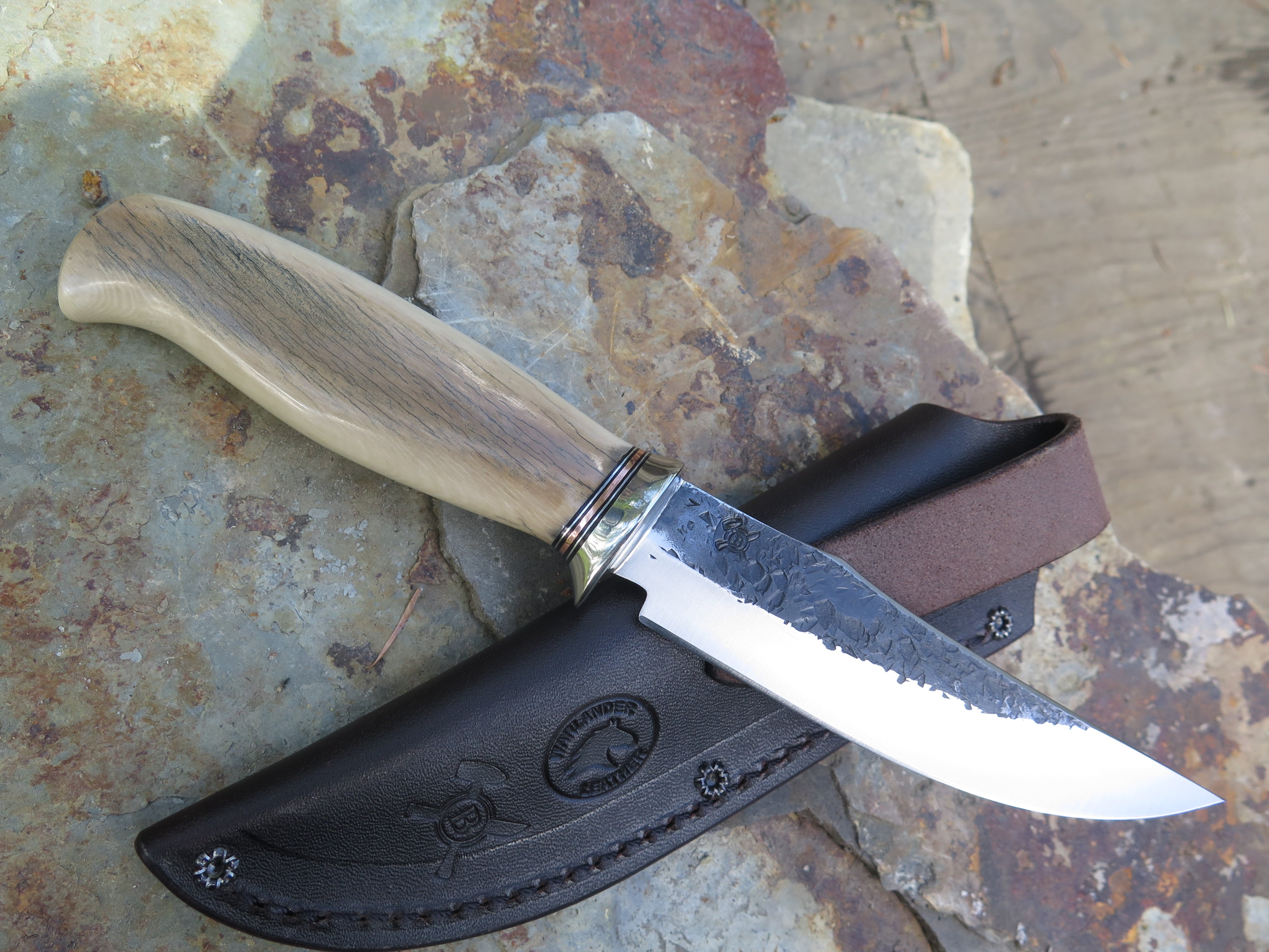 This incredible Behring Made© Clip Point is hand forged from 1/8" thick high carbon 01 tool steel and it measures 5" from tip to guard with a razor sharp hollow grind and our hammermark finish. The nickel silver guard is soldered in place above black fiber, aluminum and copper spacers which meet an ancient mammoth ivory handle with a beautiful range of light cream tones to earth browns. The overall length measures 9 3/8" and it comes in a classic leather belt pouch sheath.