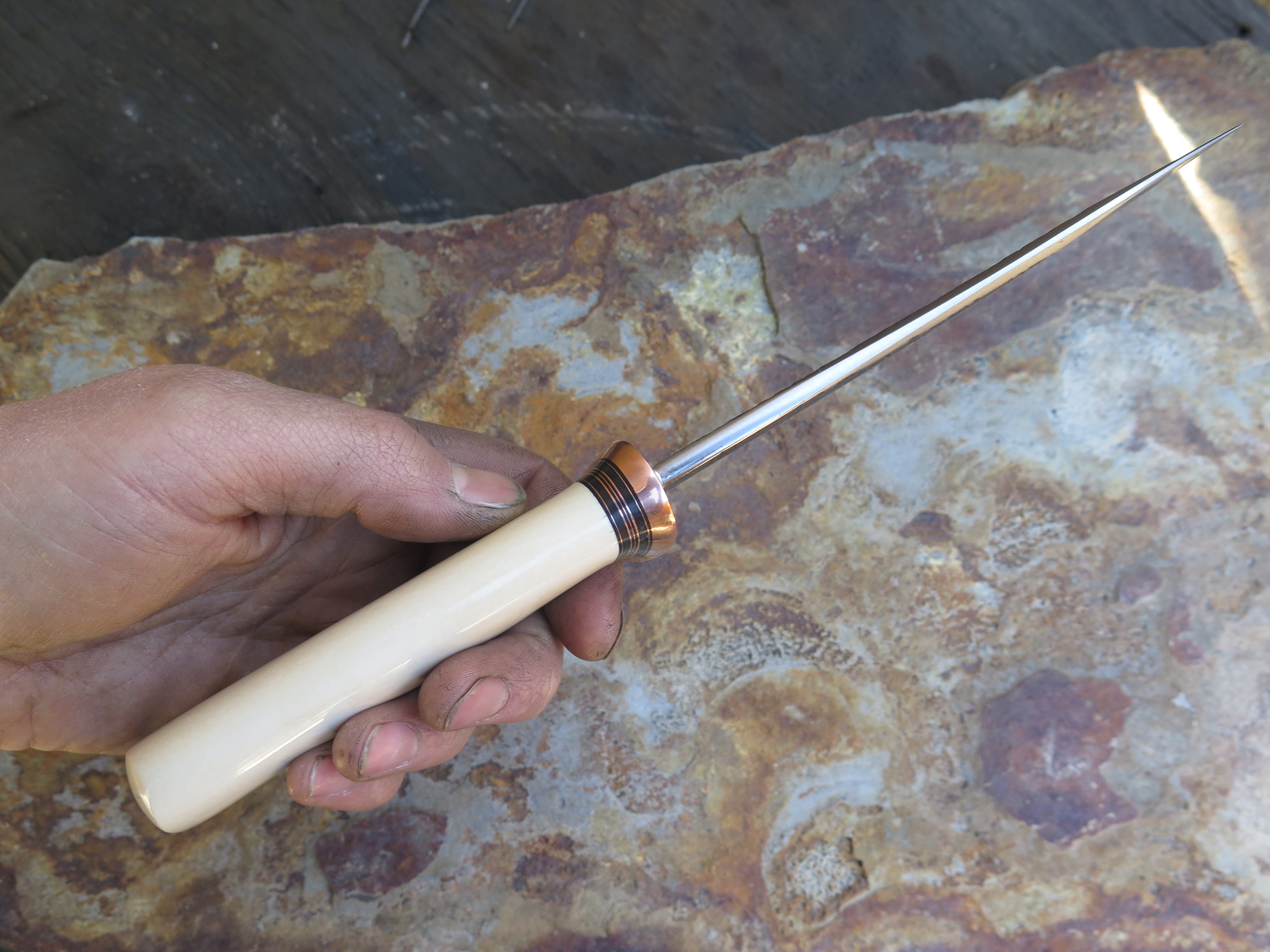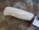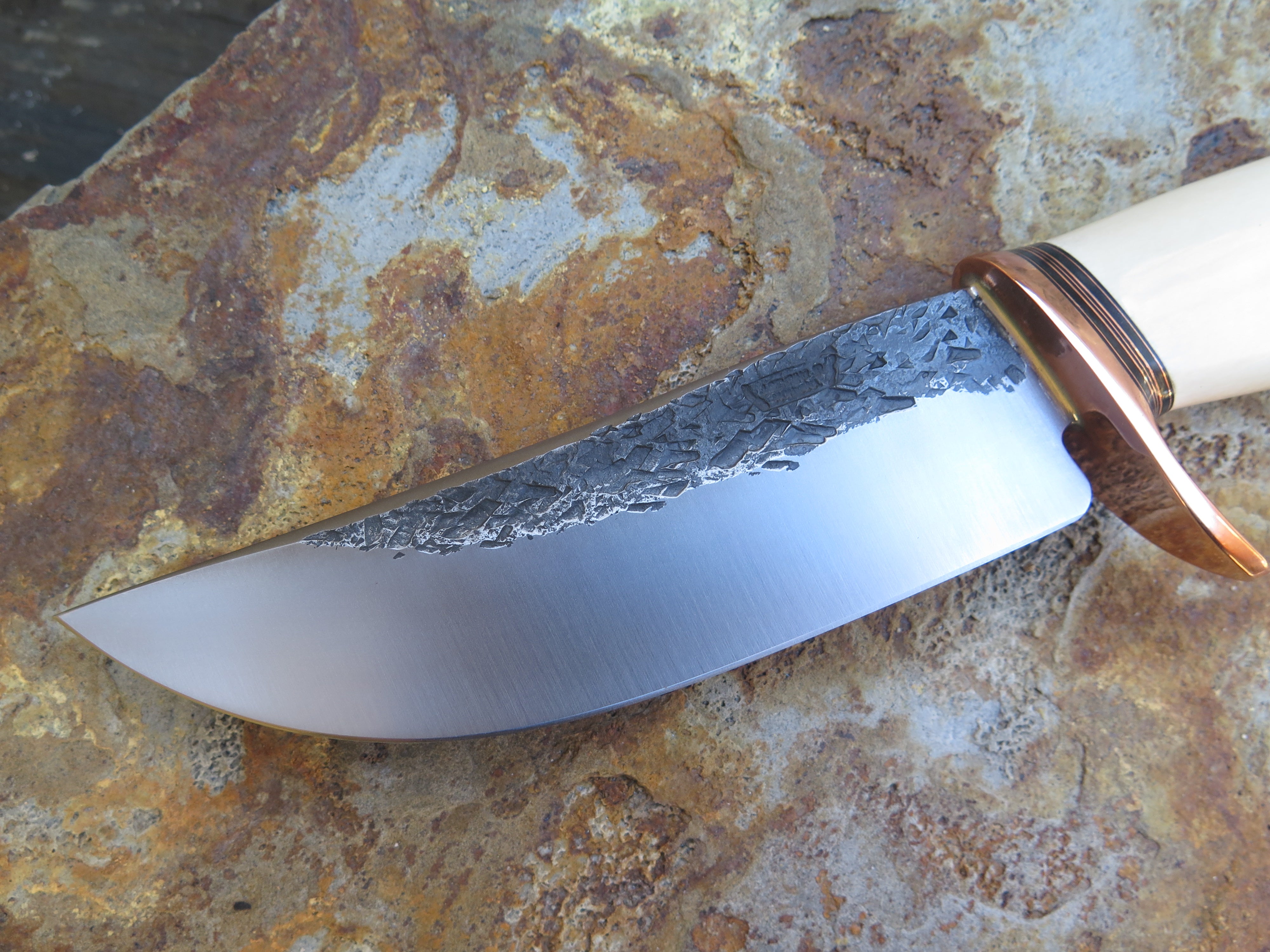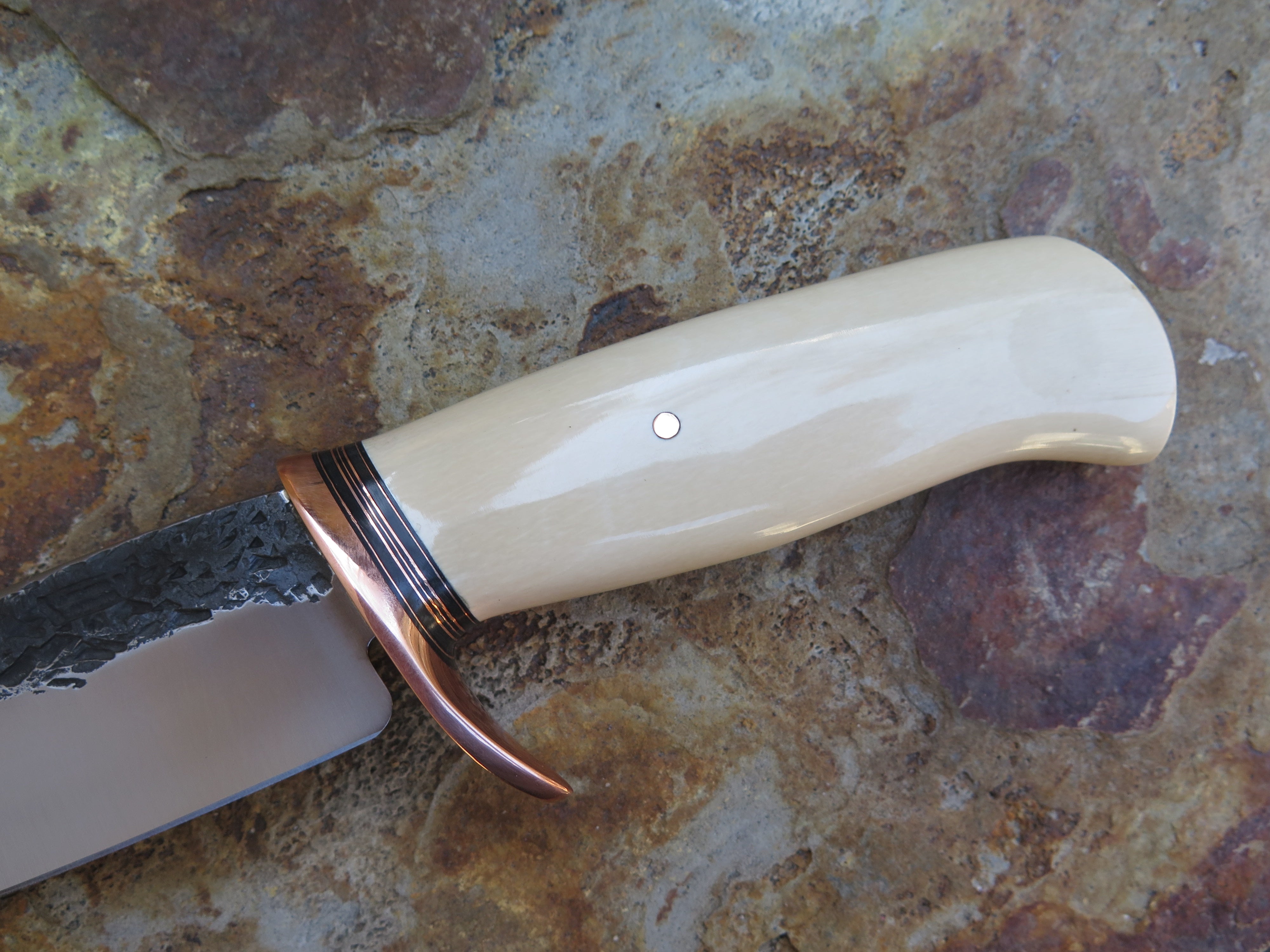 This beautiful new Hunter from Behring Made© is hand forged from 3/16" thick high carbon 01 tool steel and it measures 5 1/2" from tip to guard with a razor sharp hollow grind and our hammermark finish. The forged copper half-s guard is soldered in place above black fiber and copper spacers as well as a remarkable handle made from the tusk of an ancient mammoth- plus it's pinned through the tang with copper. The overall length measures just a hair over 10 1/8" and it will come in a custom sheath from Warlander Leather.