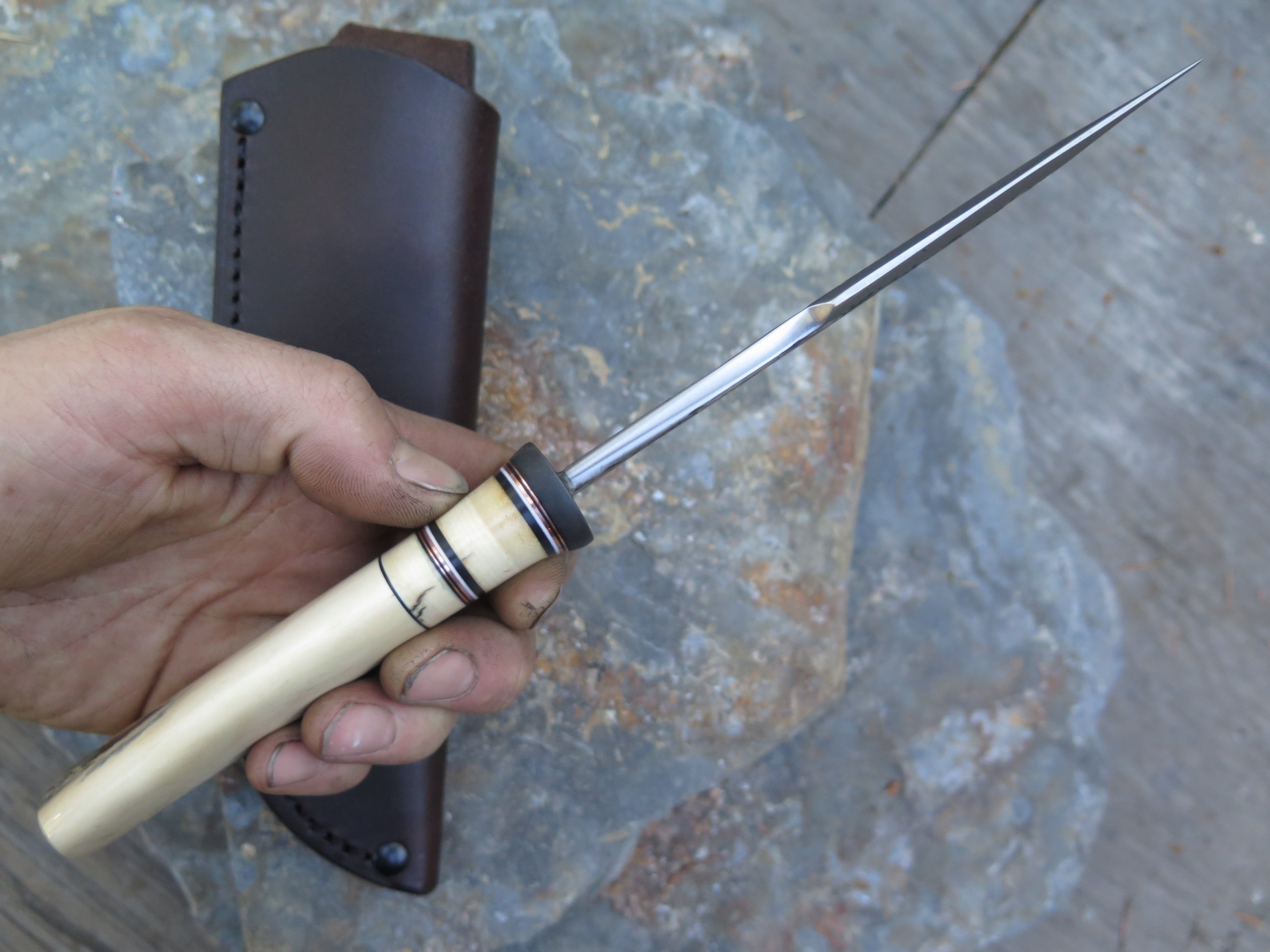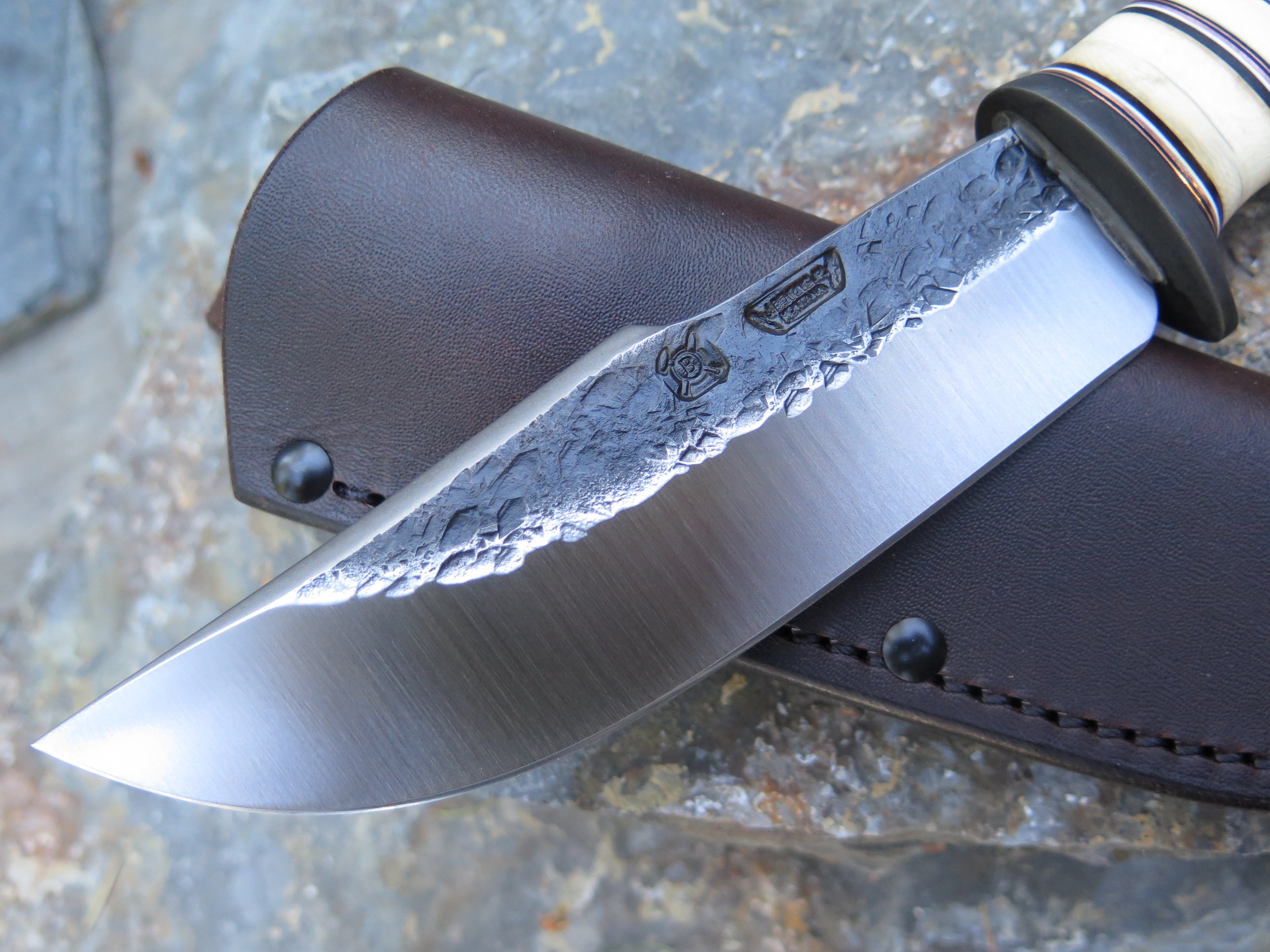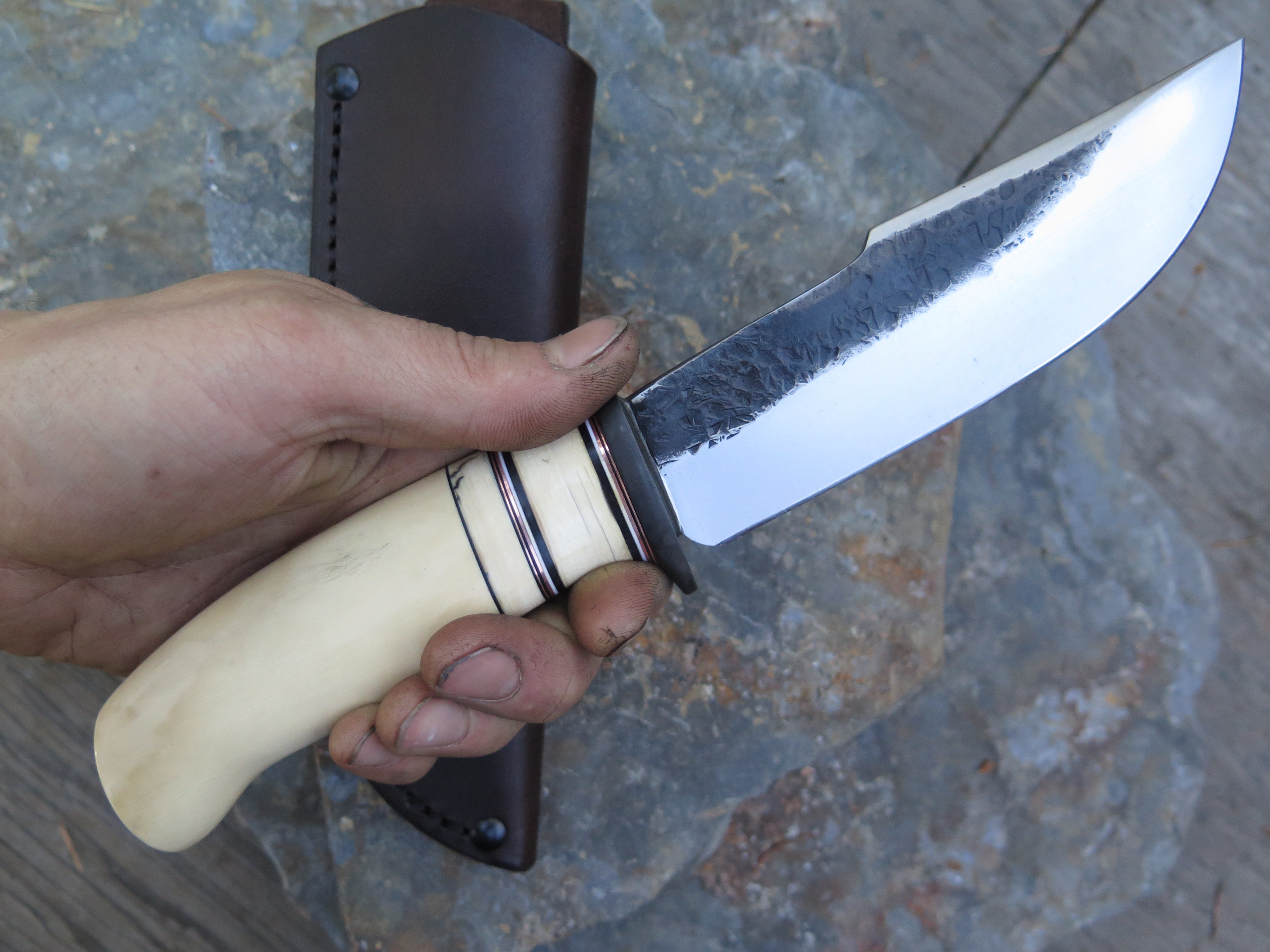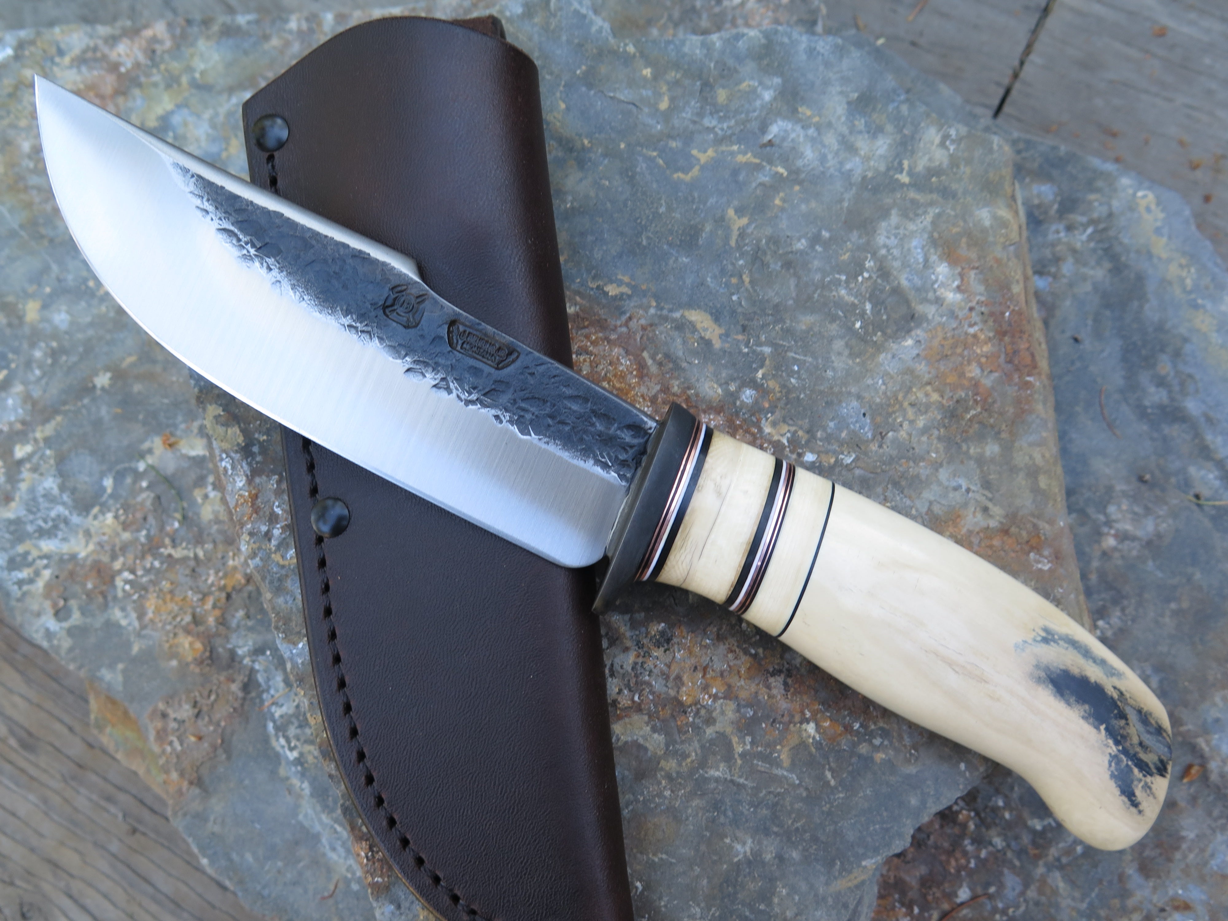 This beautiful new Woodcraft from Behring Made© is hand forged from 3/16" thick high carbon 01 tool steel and it measures 5 1/2" from tip to guard with a razor sharp hollow grind and our hammermark finish. The blued steel guard is soldered in place above black and white fiber, copper, and ancient mammoth ivory spacers in addition to the premium ancient mammoth ivory handle with deep blue to light cream figure. The overall length measures 10 1/4" and it comes in a classic leather belt pouch sheath.