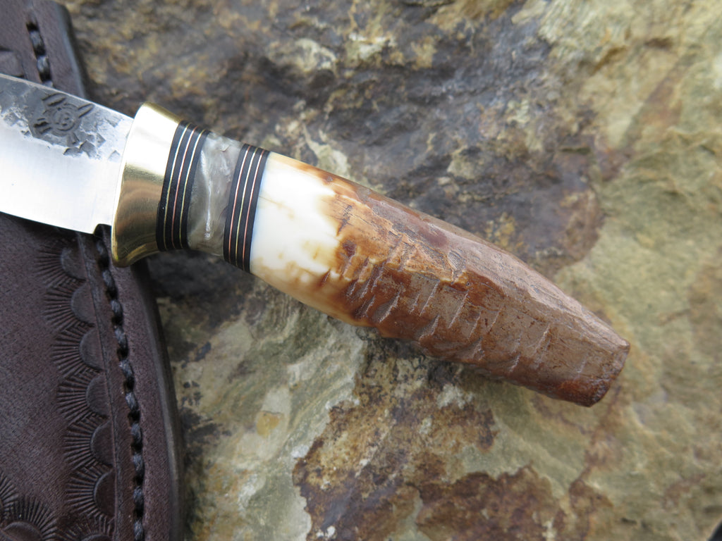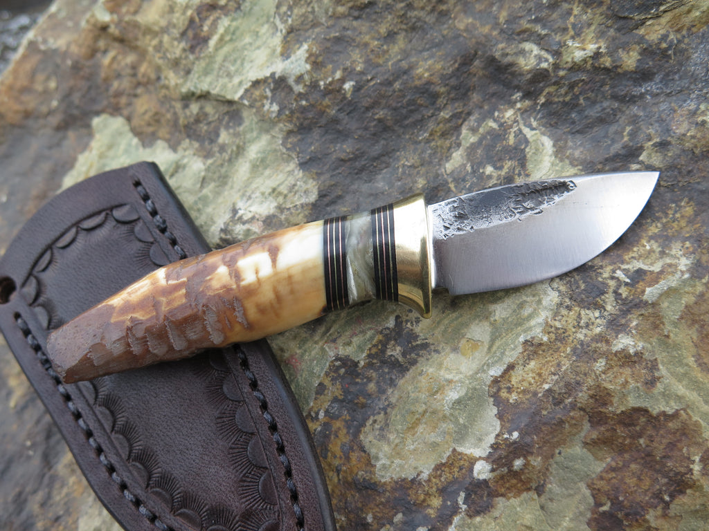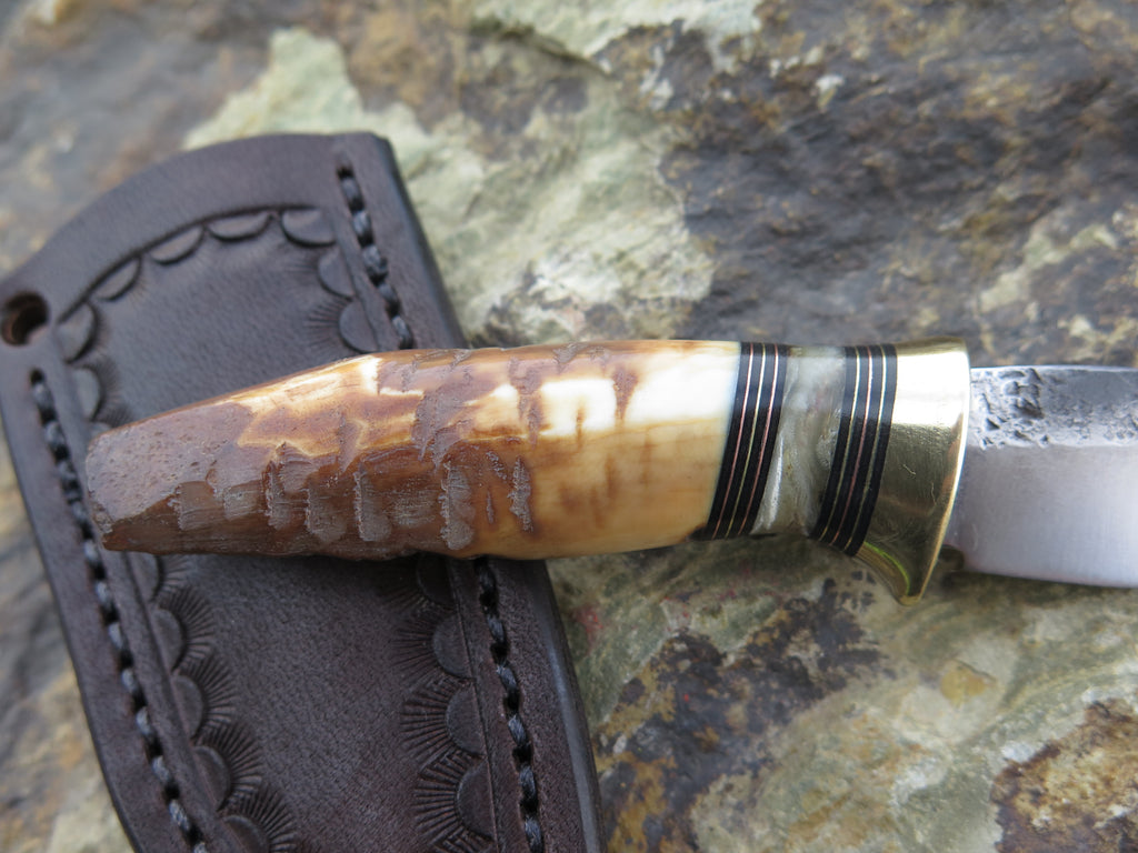 Taking the Behring Made™ Pocket Knife a step smaller, this new Drop Point is made to fit in the fifth pocket of your jeans and you can hardly feel it there! The blade is hand forged from high carbon 01 tool steel and it measures 1 3/4" from tip to guard with a razor sharp hollow grind and a hammermark finish. The brass guard is soldered in place above black fiber, brass, musk ox boss and copper spacers that are a wonderful compliment to the premium artifact walrus ivory handle. The overall length measures 4 1/2" and it comes in a custom pouch from Warlander Leather.