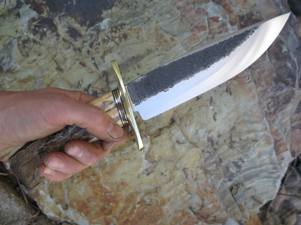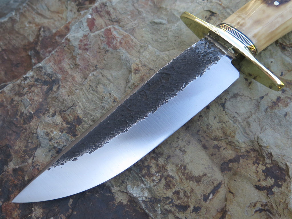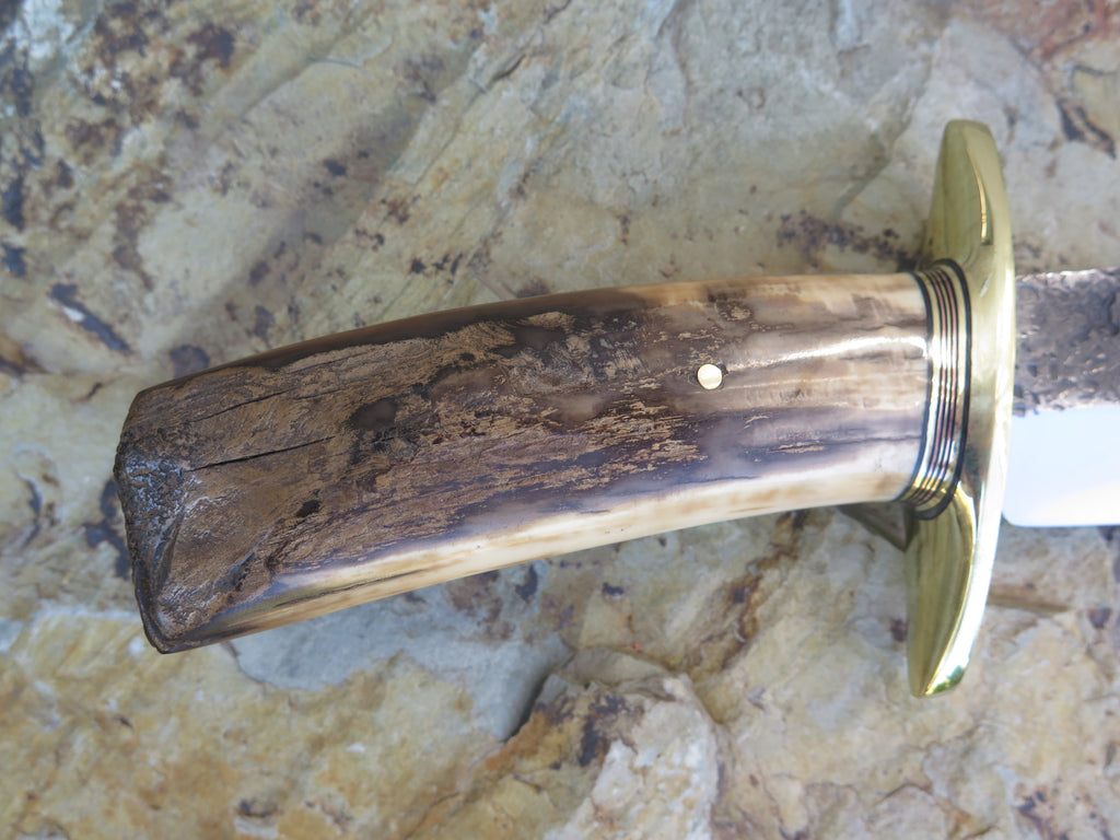 This outstanding new Camp Knife from Behring Made© is a stepped up drop point that'll tackle your camp jobs like a linebacker on a kicker. The blade is forged from 5160 spring steel and it measures 7 1/2" from tip to guard with a razor sharp hollow grind and our hammermark finish. The tall brass guard is soldered in place above black fiber, brass and copper spacers as well as a gorgeous artifact walrus ivory handle that we've pinned through the tang with brass. The overall length of this beast measures 12 1/4" and it comes in a custom sheath from Warlander Leather. *CONTACT TO ORDER