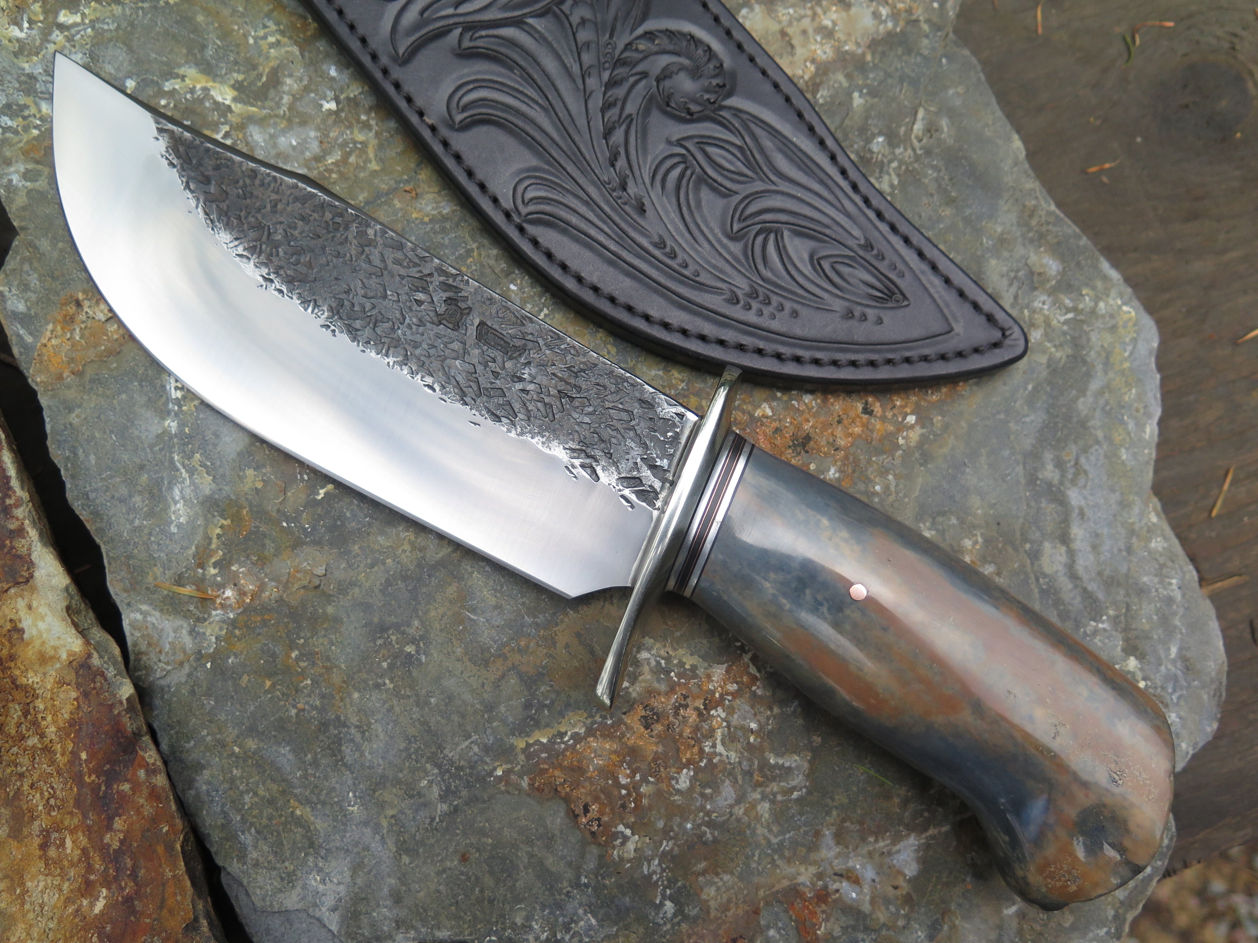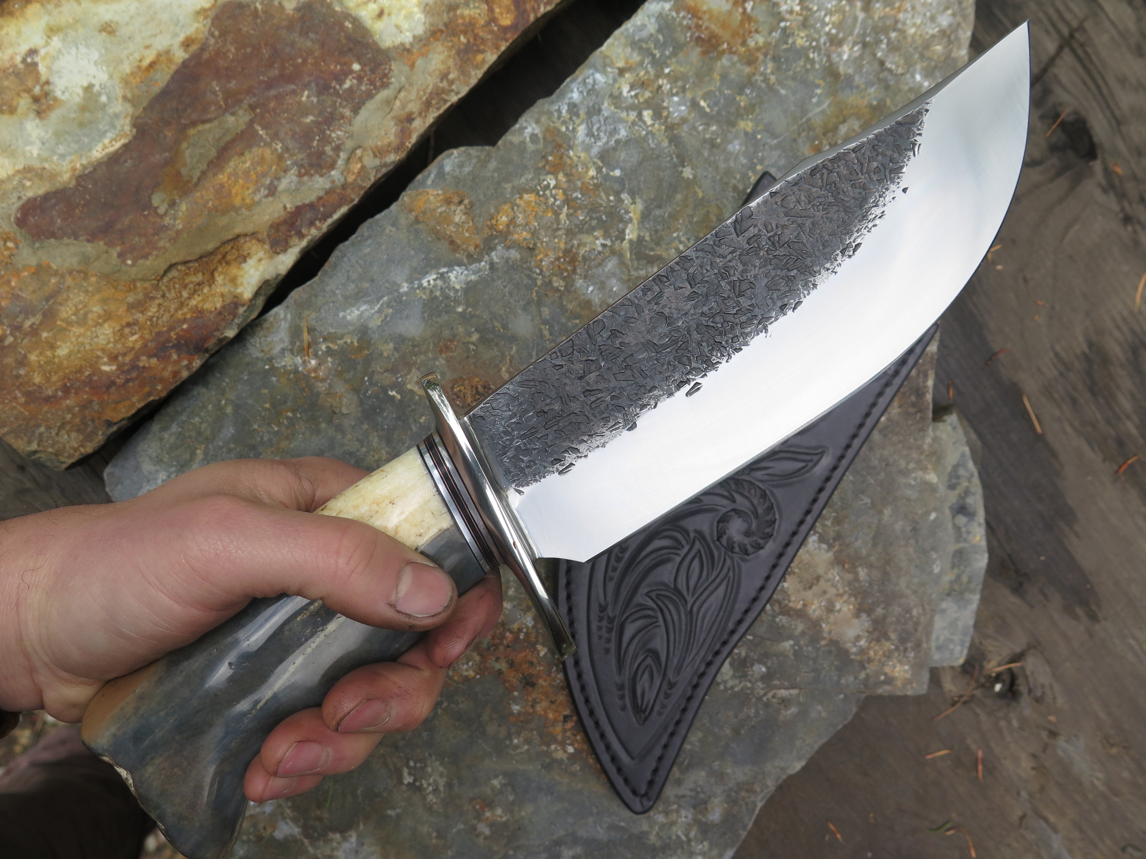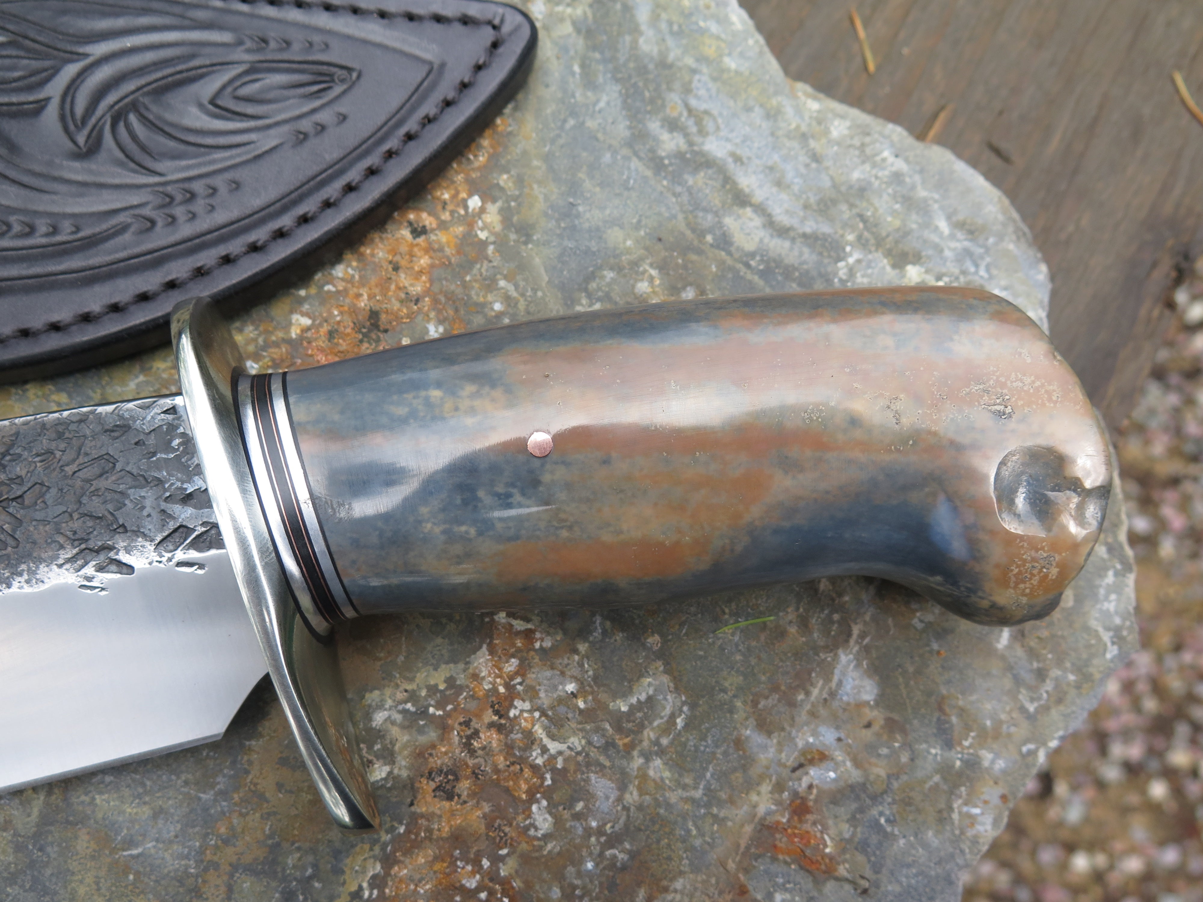 This beastly new Southwest Bowie from Behring Made© is hand forged from 1/4" thick high carbon 01 tool steel and it measures 8 1/2" from tip to guard with a razor sharp hollow grind and our hammermark finish. The tall nickel silver guard is soldered in place above black fiber, copper and aluminum spacers which transition to an astounding artifact walrus ivory handle with blues and browns for truly top shelf figure. It's pinned through the tang with copper and overall the length measures 13 3/4" and it comes in a floral tooled custom sheath from Warlander Leather designed for a right handed cross-draw carry.
