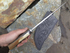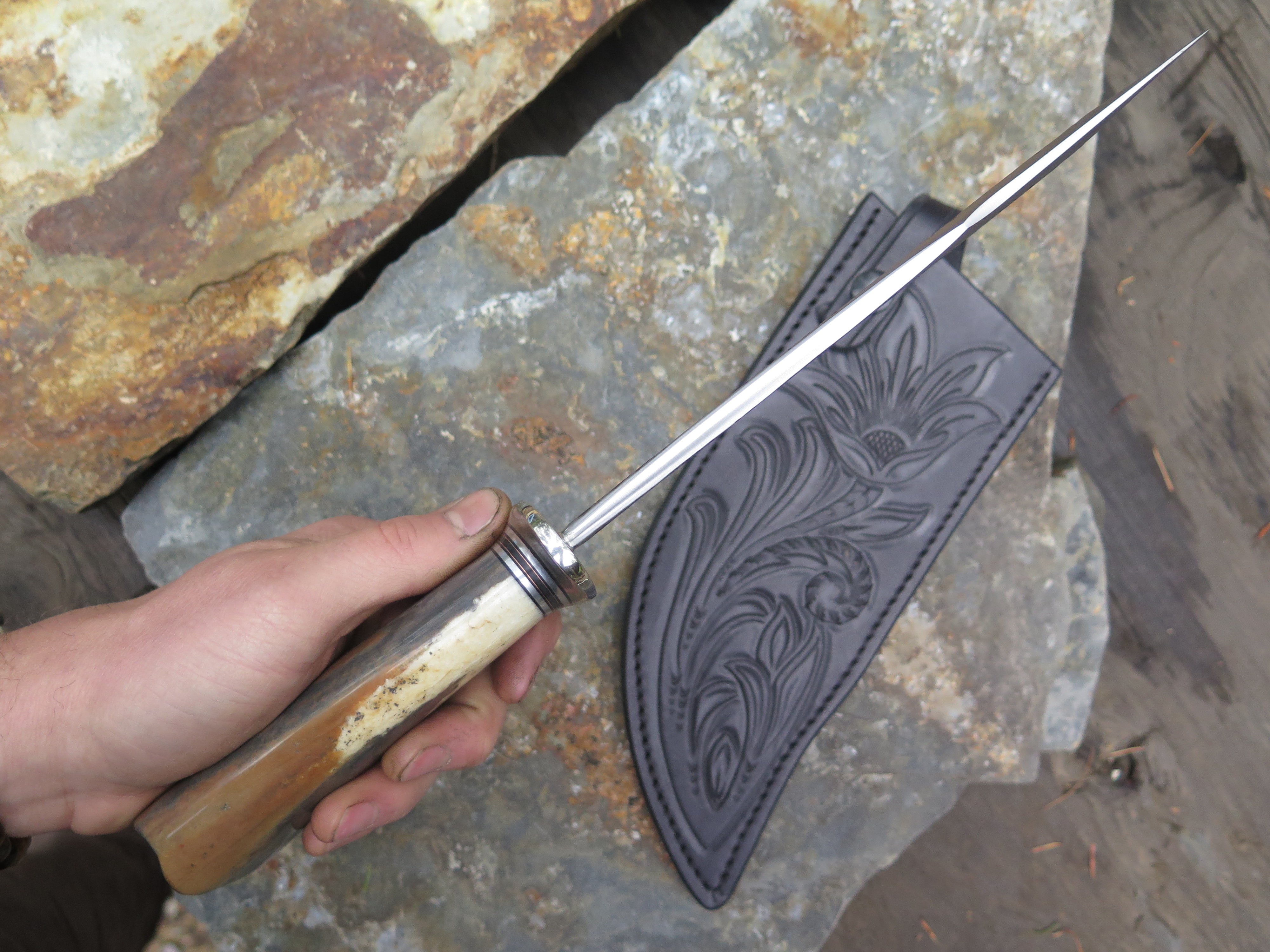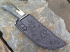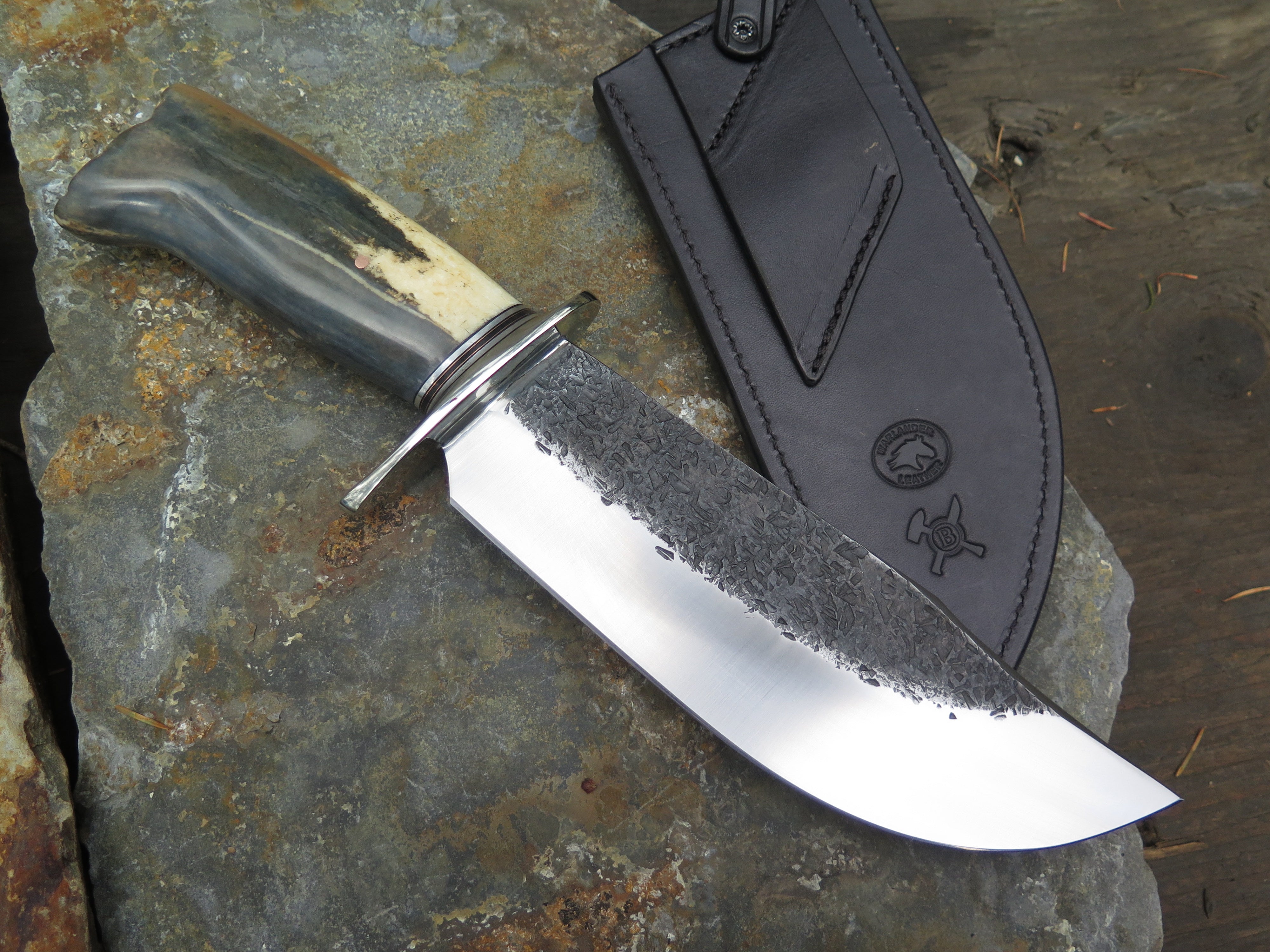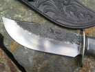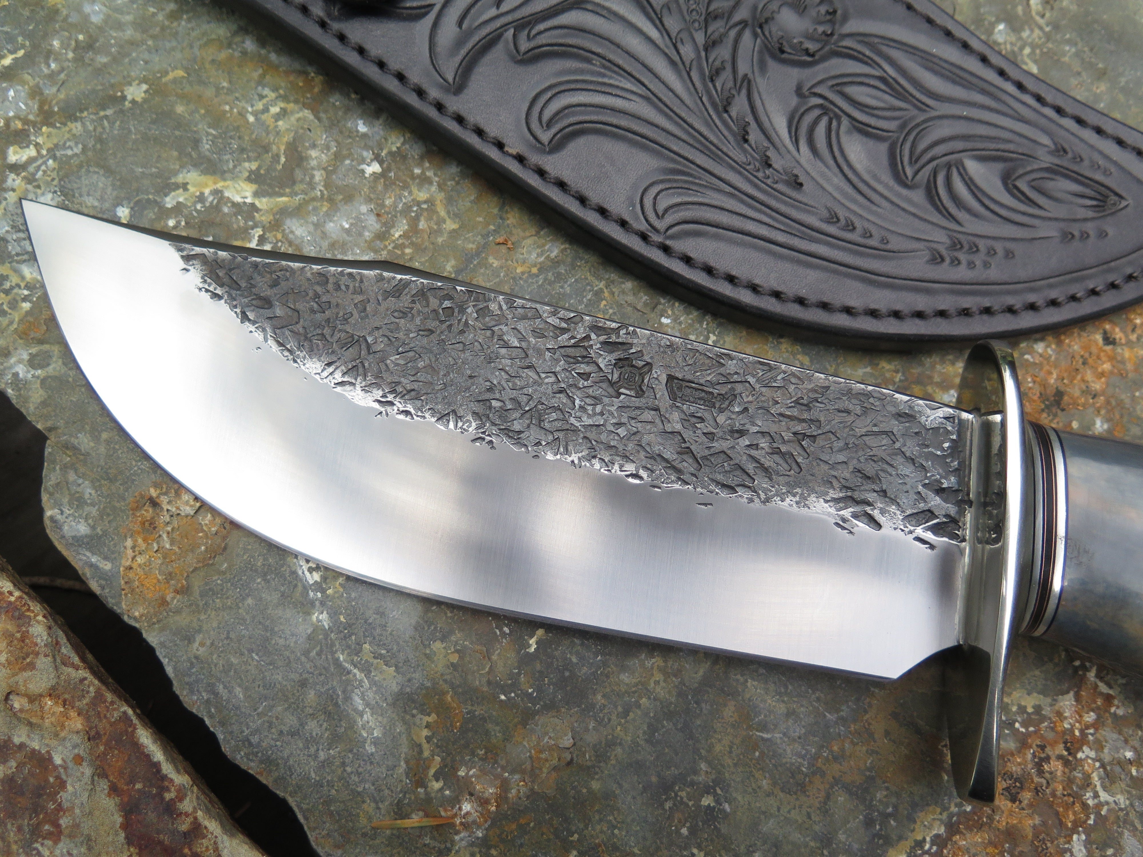 This beastly new Southwest Bowie from Behring Made© is hand forged from 1/4" thick high carbon 01 tool steel and it measures 8 1/2" from tip to guard with a razor sharp hollow grind and our hammermark finish. The tall nickel silver guard is soldered in place above black fiber, copper and aluminum spacers which transition to an astounding artifact walrus ivory handle with blues and browns for truly top shelf figure. It's pinned through the tang with copper and overall the length measures 13 3/4" and it comes in a floral tooled custom sheath from Warlander Leather designed for a right handed cross-draw carry.