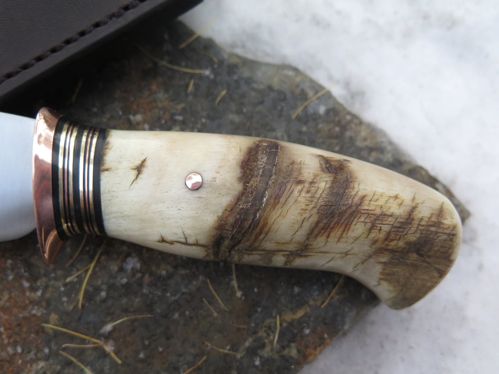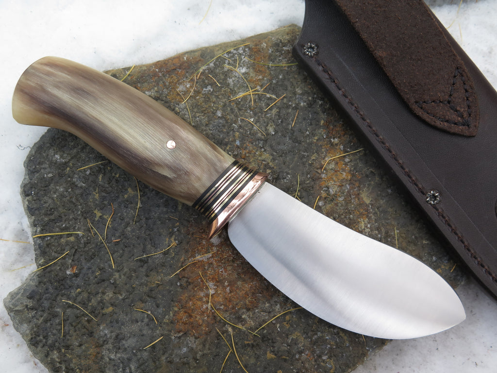This remarkable Nessmuk from Behring Made© is hand forged from 3/16" thick high carbon 01 tool steel and it measures 4 3/4" from tip to guard with a razor sharp convex grind. The copper guard is soldered in place above black, brass and copper spacers in addition to the top shelf big sheep horn handle with a wonderful texture and color range. The overall length measures 9 3/8" and it comes in a full cover classic belt pouch sheath.