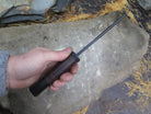 This bad ass new Tanto from Behring Made© is hand forged from 3/16" thick high carbon 01 tool steel and it measures 5 1/2" from tip to guard with a razor sharp hollow grind, hammermarks and our forced patina blued finish. The blued steel guard is soldered in place above black fiber, horsehide, and black + coyote micarta spacers with a black micarta butt that is pinned with copper. The overall length measures 10" and this one comes in a custom sheath from Warlander Leather.