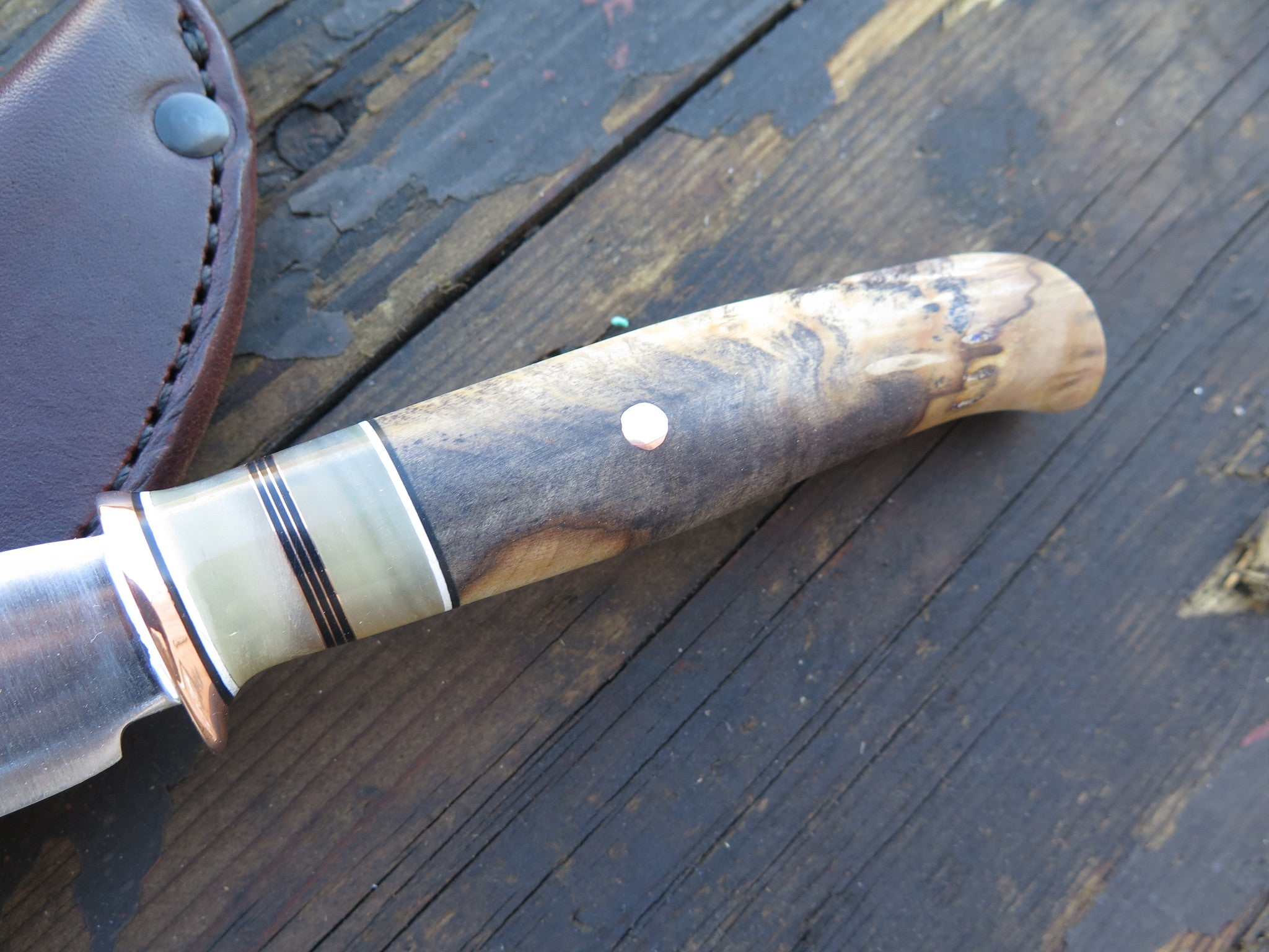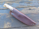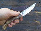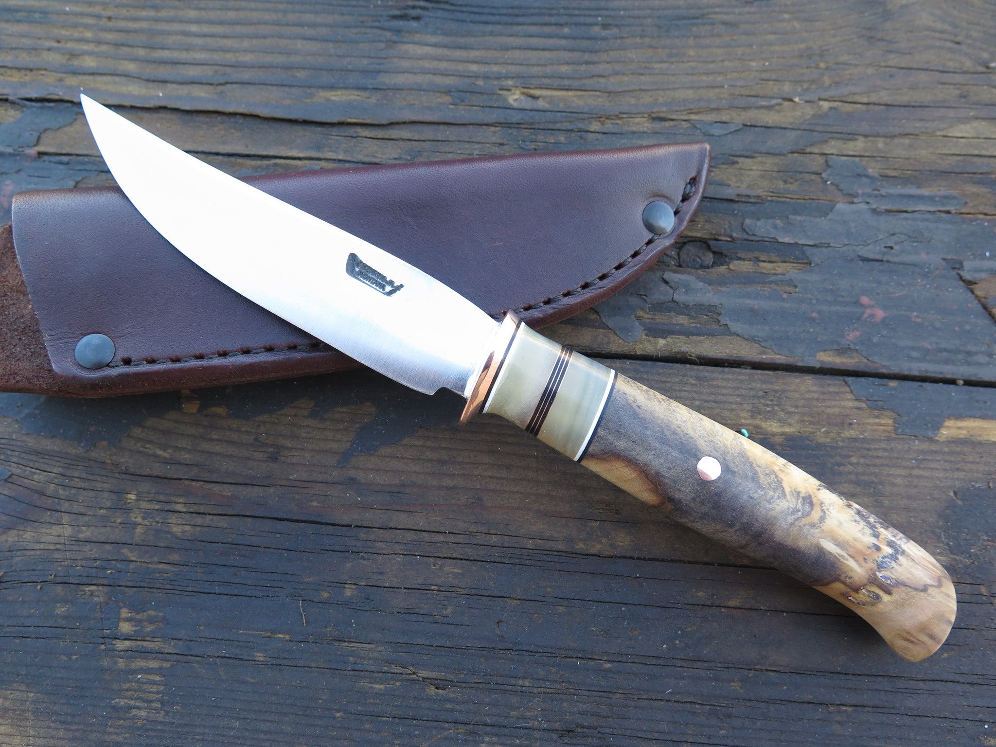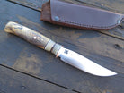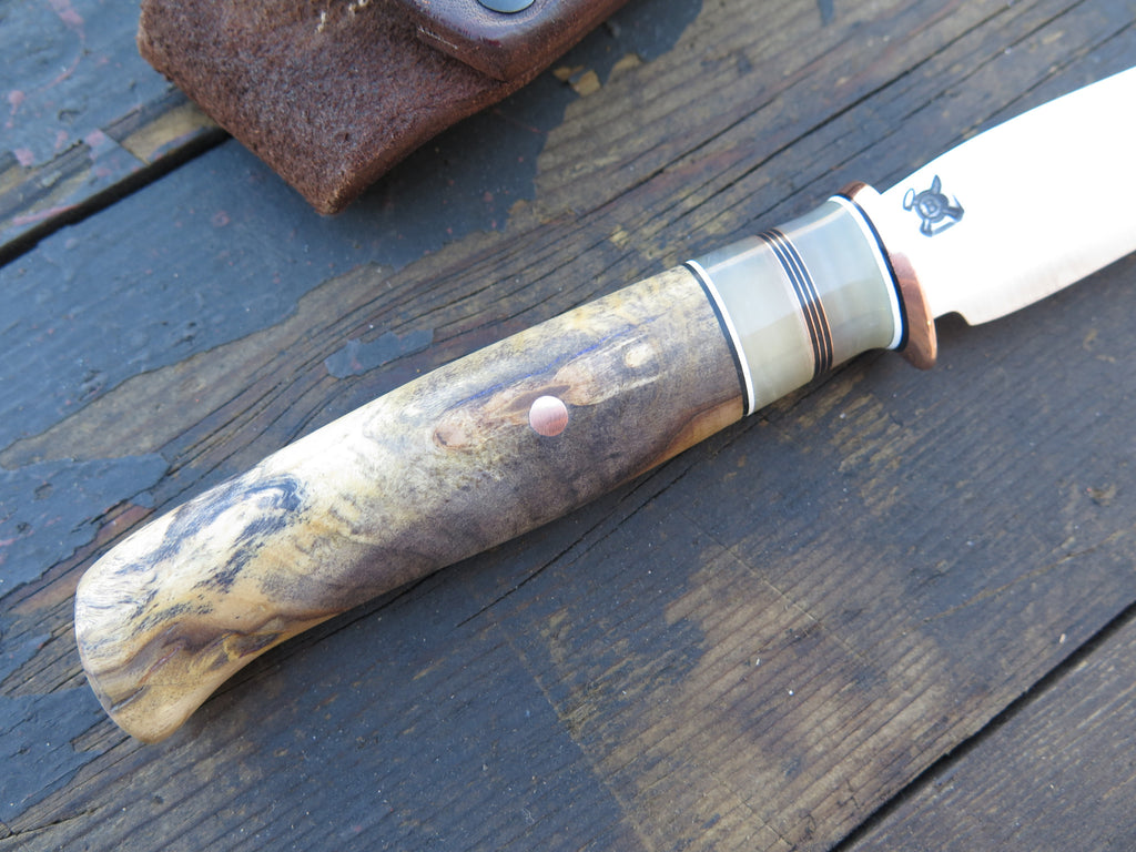 This beautiful Behring Made trout & bird is handmade starting with 440c stainless steel and measures 4 1/4" from tip to guard with a razor sharp convex grind. The copper guard is soldered in place above black, white, copper and two musk horn spacers not to mention the gorgeous buckeye burl handle. The overall length measures 8 3/4" and it will ship in our Behring Made pouch style sheath.