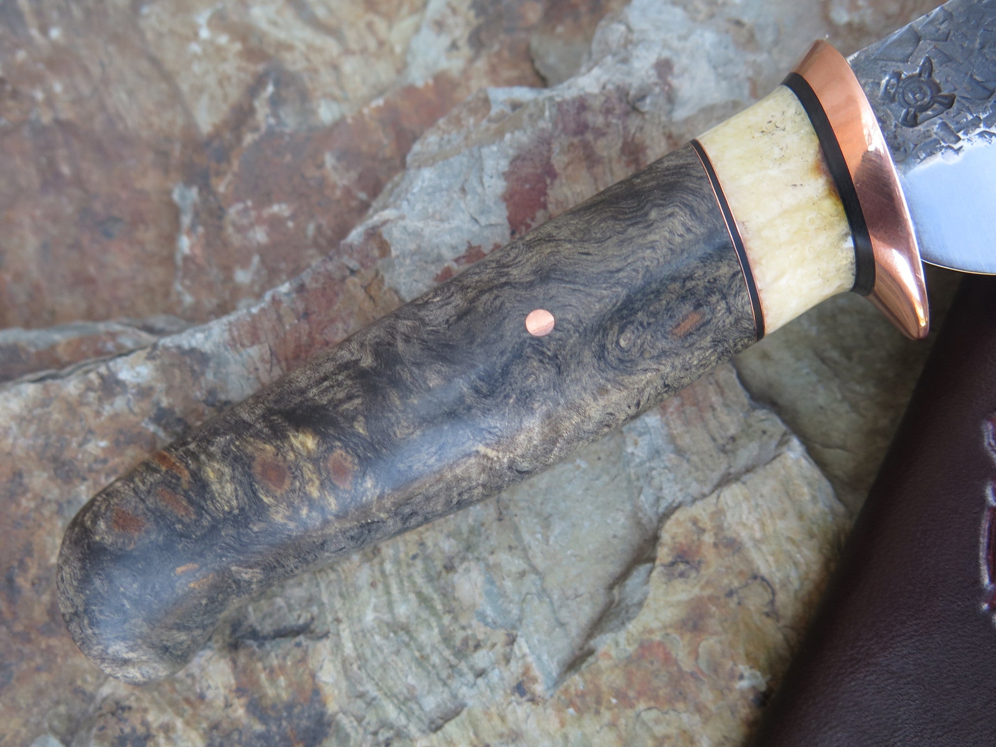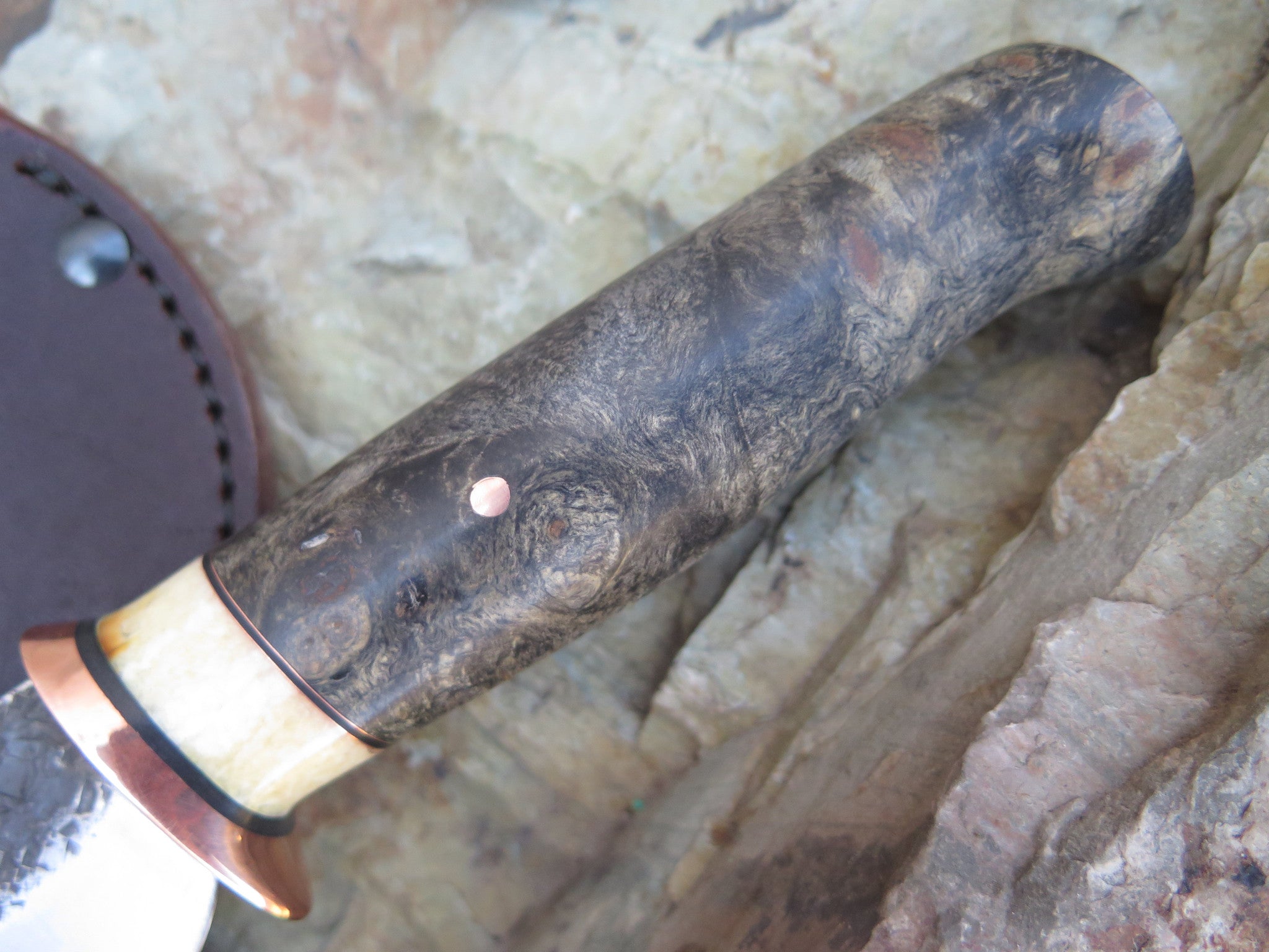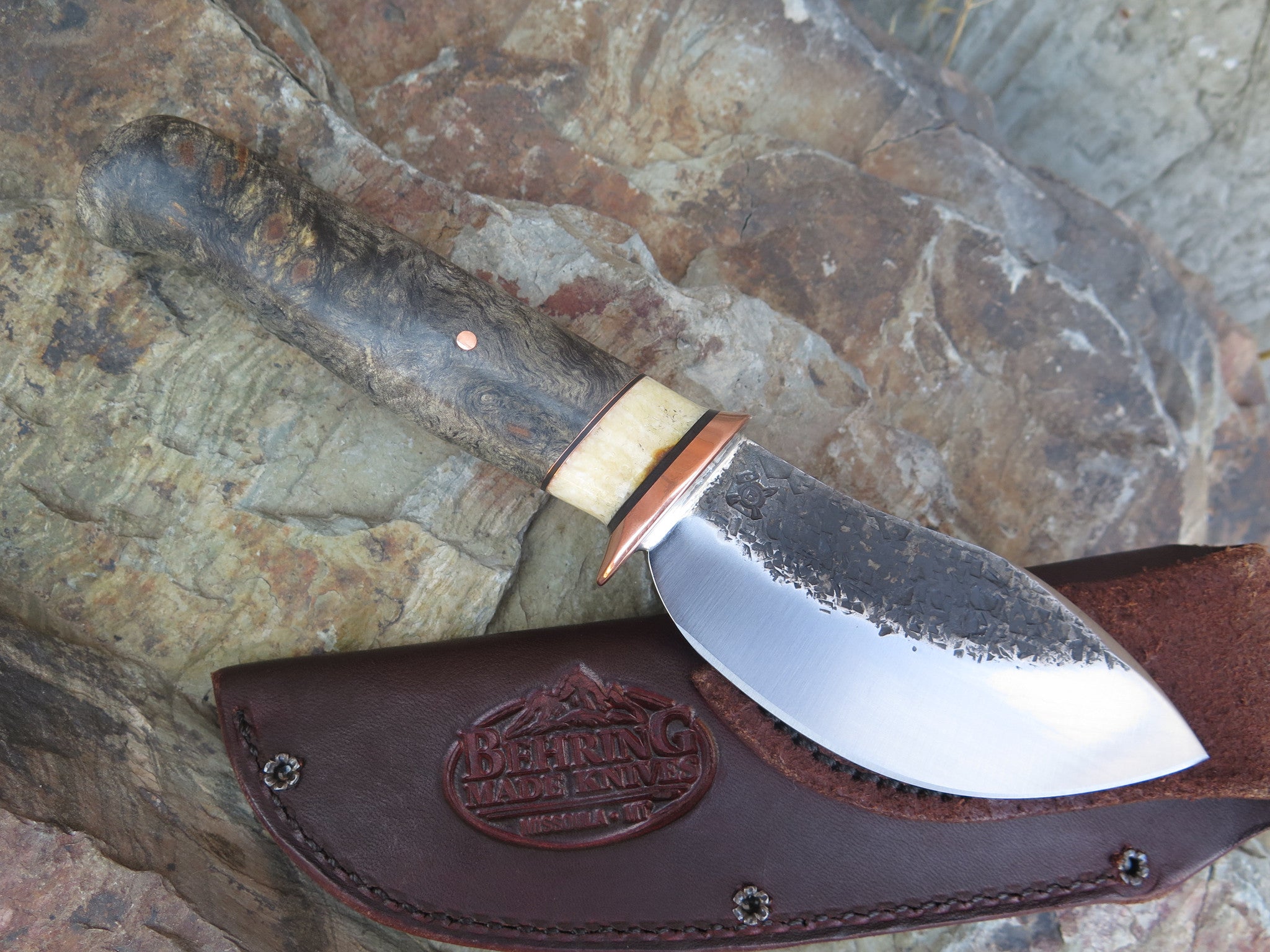 This beautiful Nessmuk from Behring Made is hand forged from high carbon 01 tool steel and it measures 4" from tip to guard with a razor sharp hollow grind and our hammermark finish. The copper guard is soldered in place above black fiber, copper and premium fossil walrus ivory spacers. The incredible buckeye burl handle is pinned with copper and brings the overall length to 8 5/8", plus it comes in our Behring Made pouch sheath.