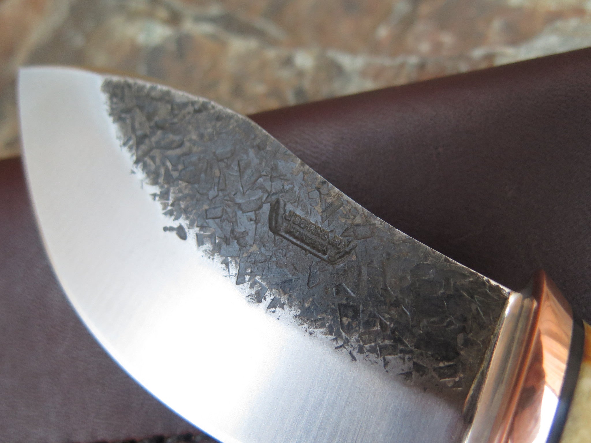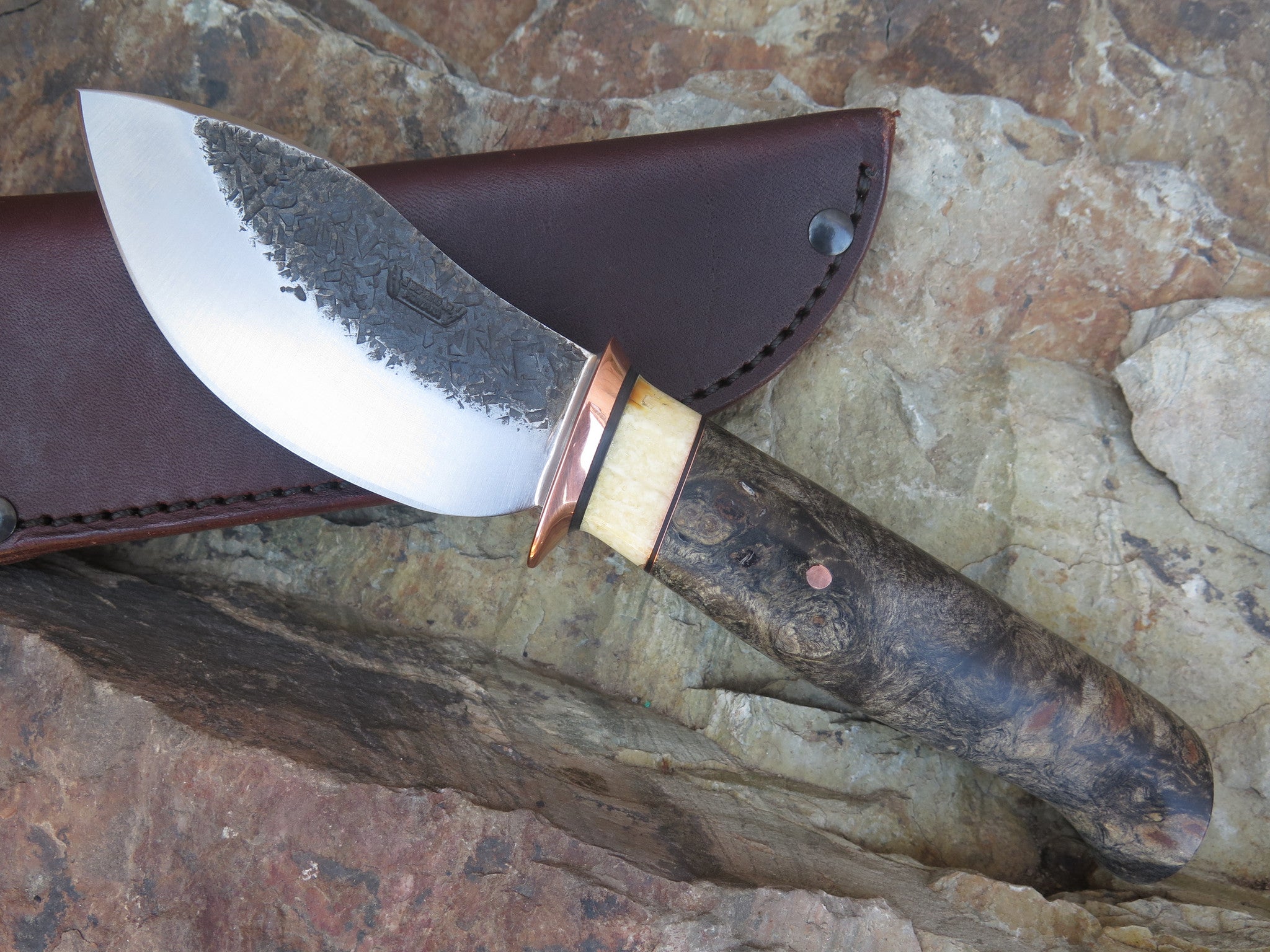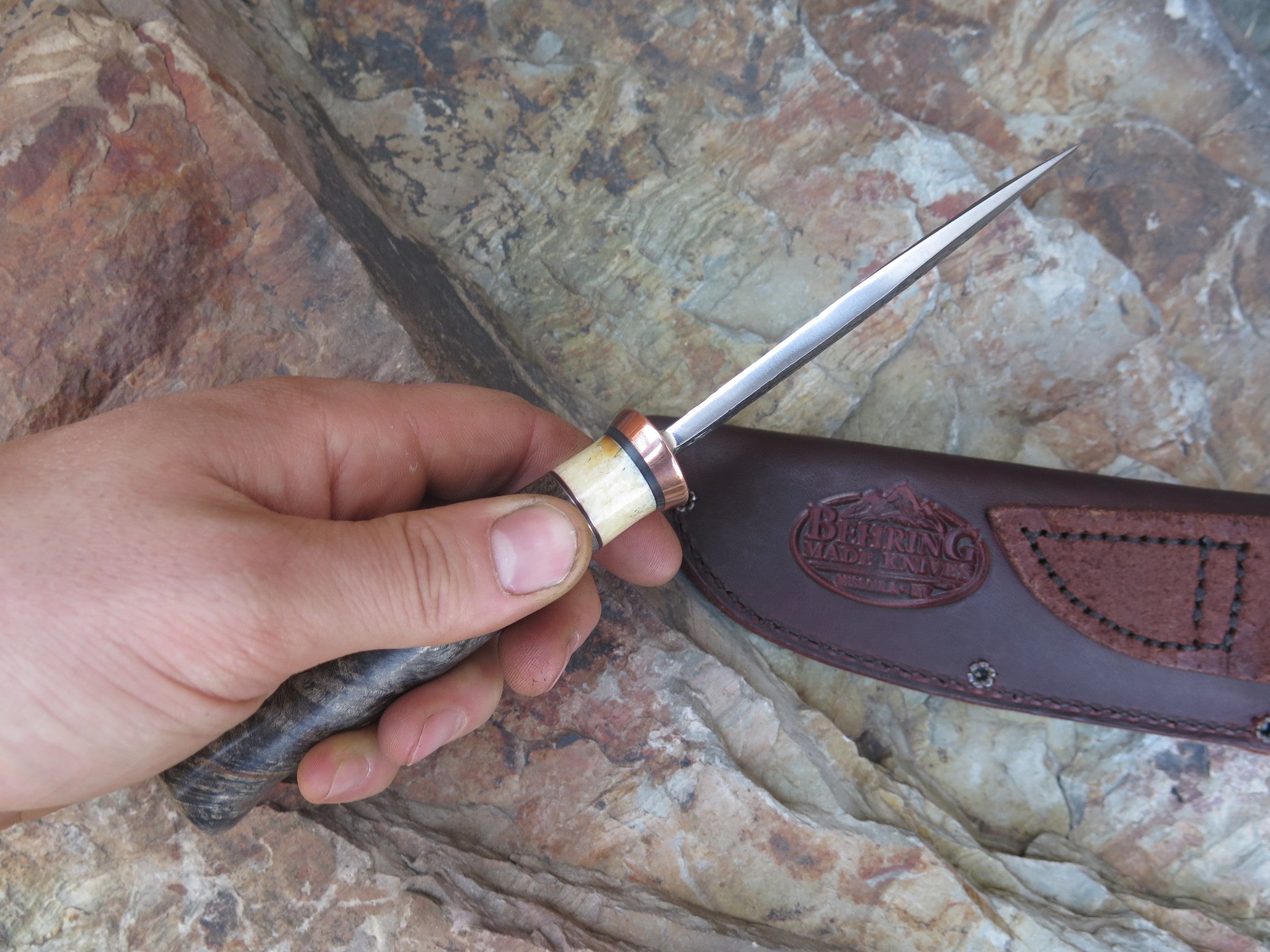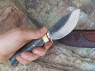 This beautiful Nessmuk from Behring Made is hand forged from high carbon 01 tool steel and it measures 4" from tip to guard with a razor sharp hollow grind and our hammermark finish. The copper guard is soldered in place above black fiber, copper and premium fossil walrus ivory spacers. The incredible buckeye burl handle is pinned with copper and brings the overall length to 8 5/8", plus it comes in our Behring Made pouch sheath.