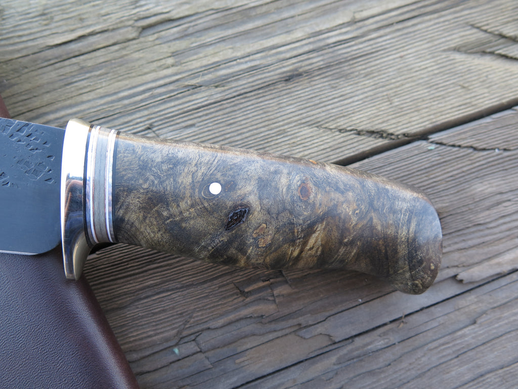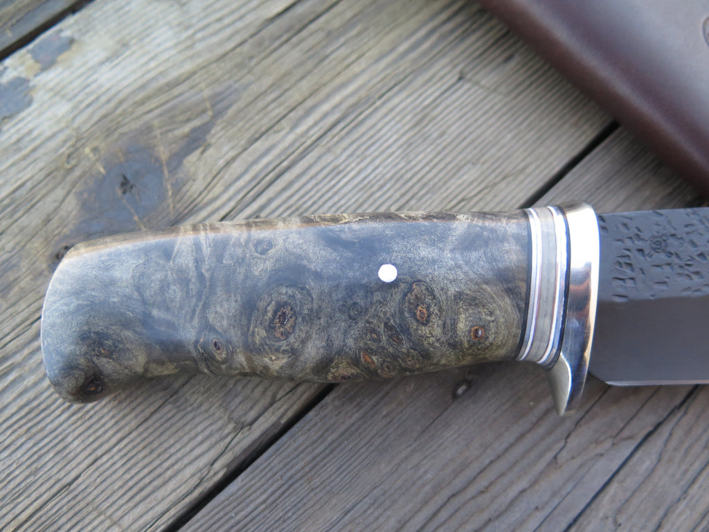 This beastly new Woodcraft from Behring Made© is hand forged from 3/16" thick high carbon 01 tool steel and it measures 5" from tip to guard with a razor sharp hollow grind, hammermarks and our forced patina blued finish. The nickel silver guard is soldered in place above black, white and gray fiber spacers with aluminum accents, all a tasteful compliment to the premium buckeye burl wood handle that's also pinned with aluminum. The overall length measures 9 1/2" and it comes in the belt pouch sheath shown.