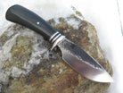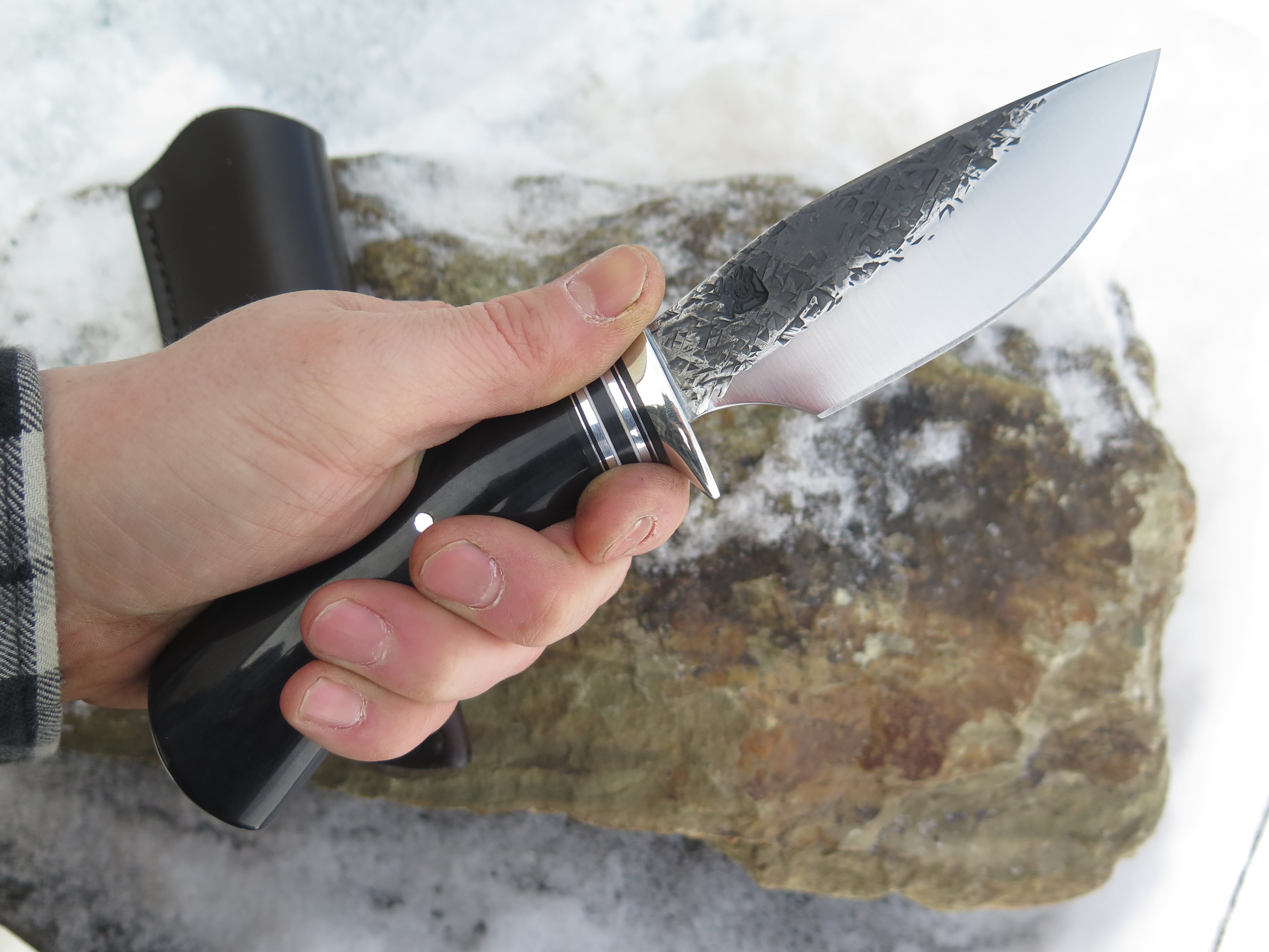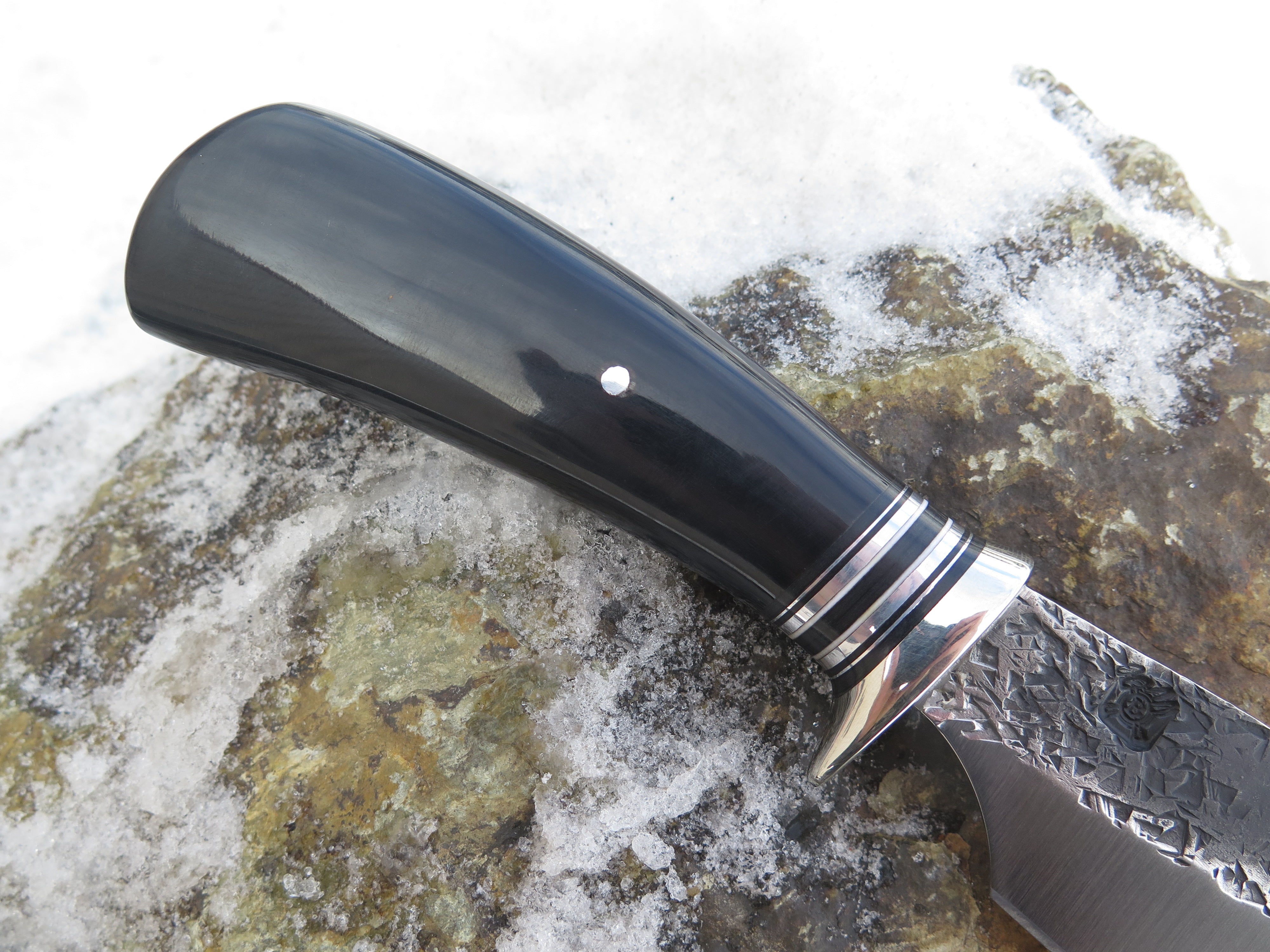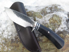 This new Alaskan from Behring Made™ is hand forged from 3/16" thick high carbon 01 tool steel and it measures 4 3/4" from tip to guard with a razor sharp hollow grind and our hammermark finish. The nickel silver guard is soldered in place above black and white fiber with aluminum spacers that are the perfect compliment to the buffalo horn handle that's pinned through the tang with aluminum. The overall length measures 9 3/8" and it comes in a Warlander Leather pouch sheath.