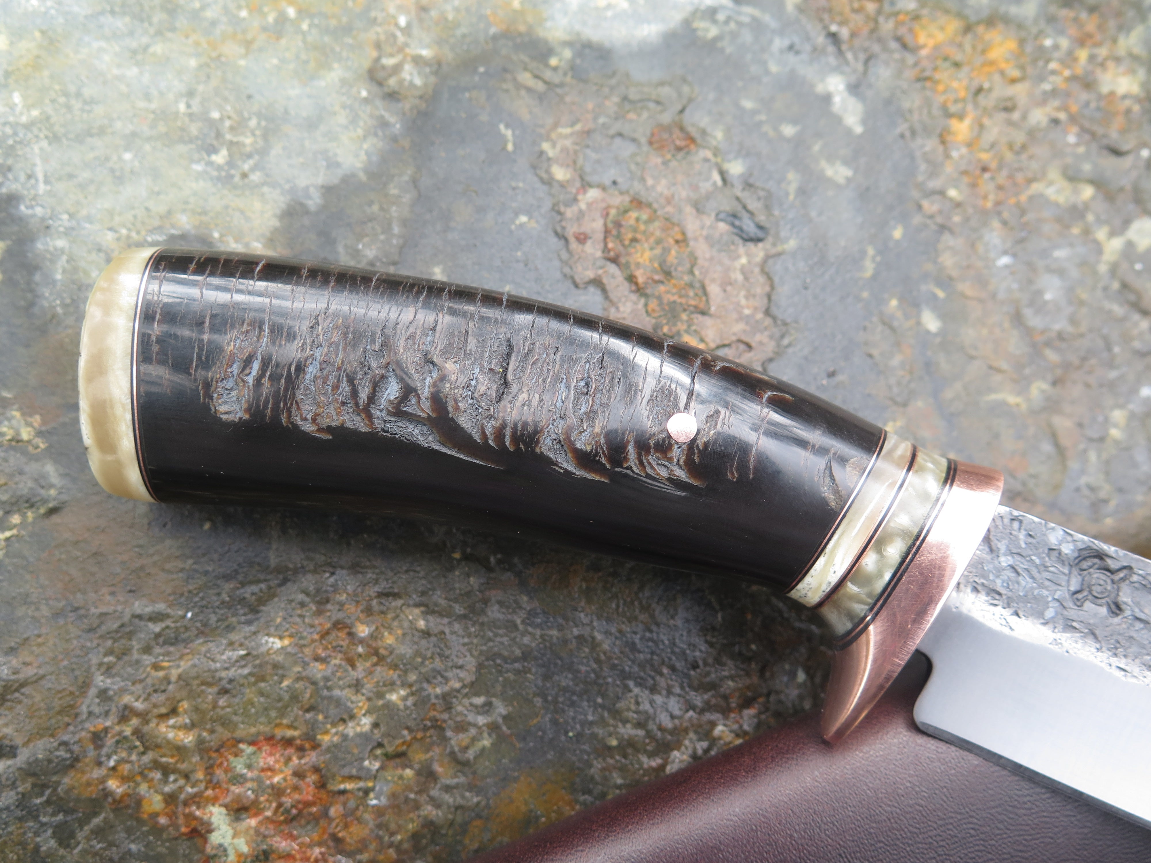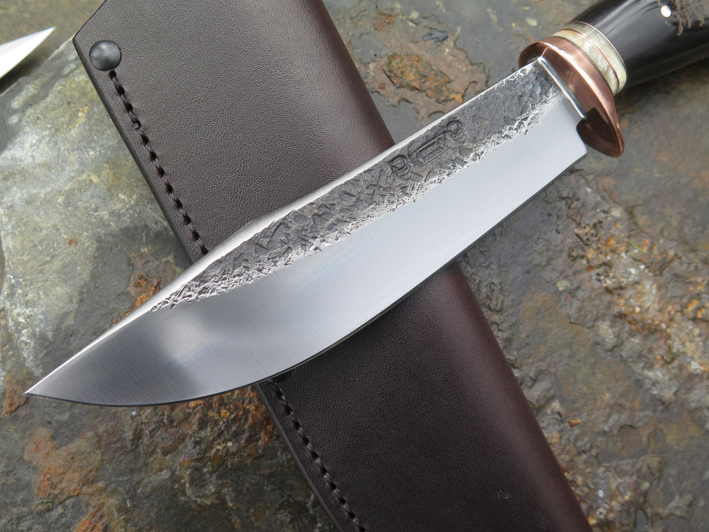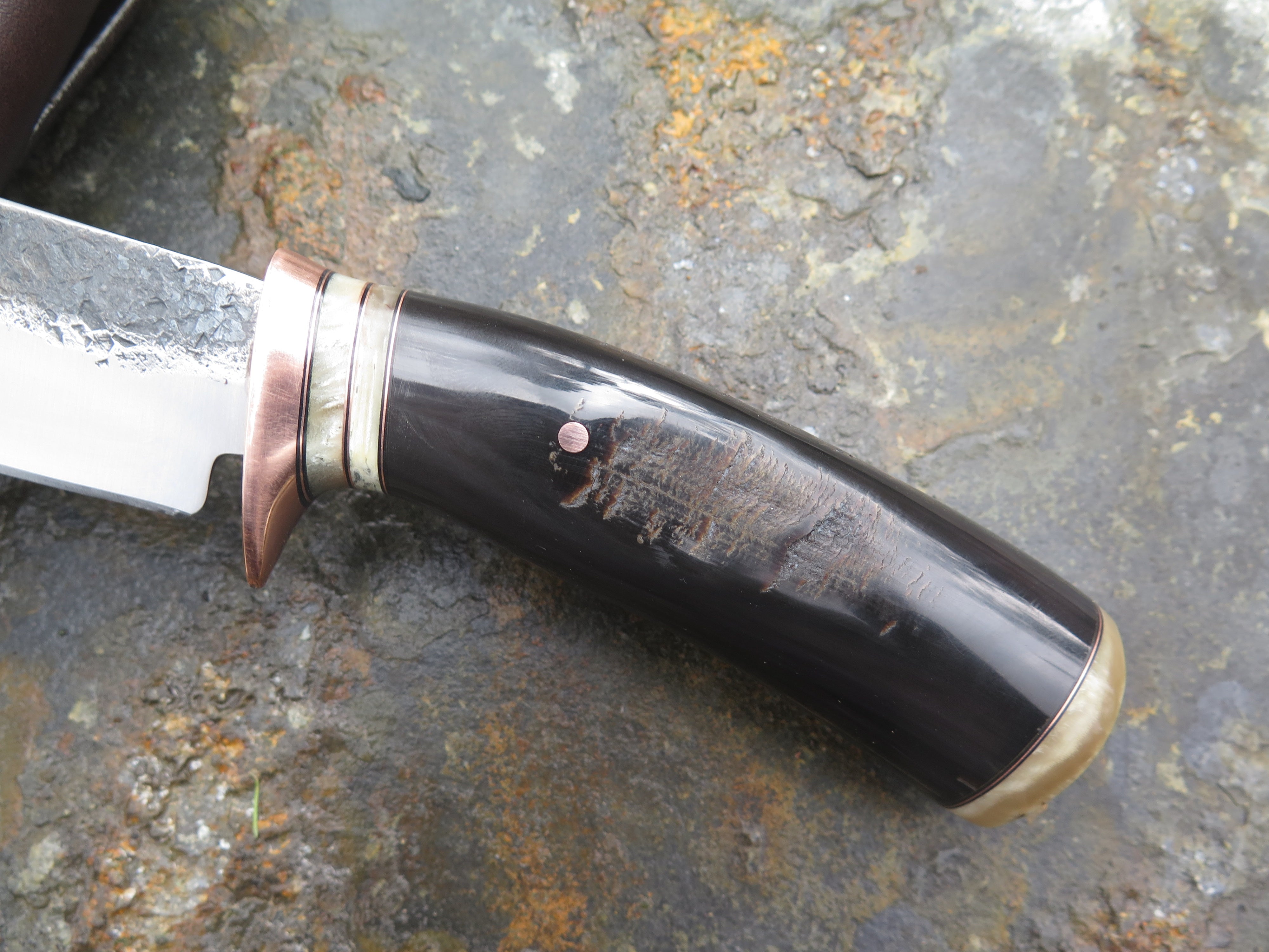 This new Clip Point from Behring Made© is hand forged from 13/64" thick high carbon 01 tool steel and it measures 6 1/4" from tip to guard with a razor sharp hollow grind and our hammermark finish. The copper guard is soldered in place above black fiber, copper and musk ox boss spacers with an African water buffalo horn that's pinned with copper and capped with musk ox boss as well. The overall length measures 11" and it comes in a classic leather belt pouch sheath.