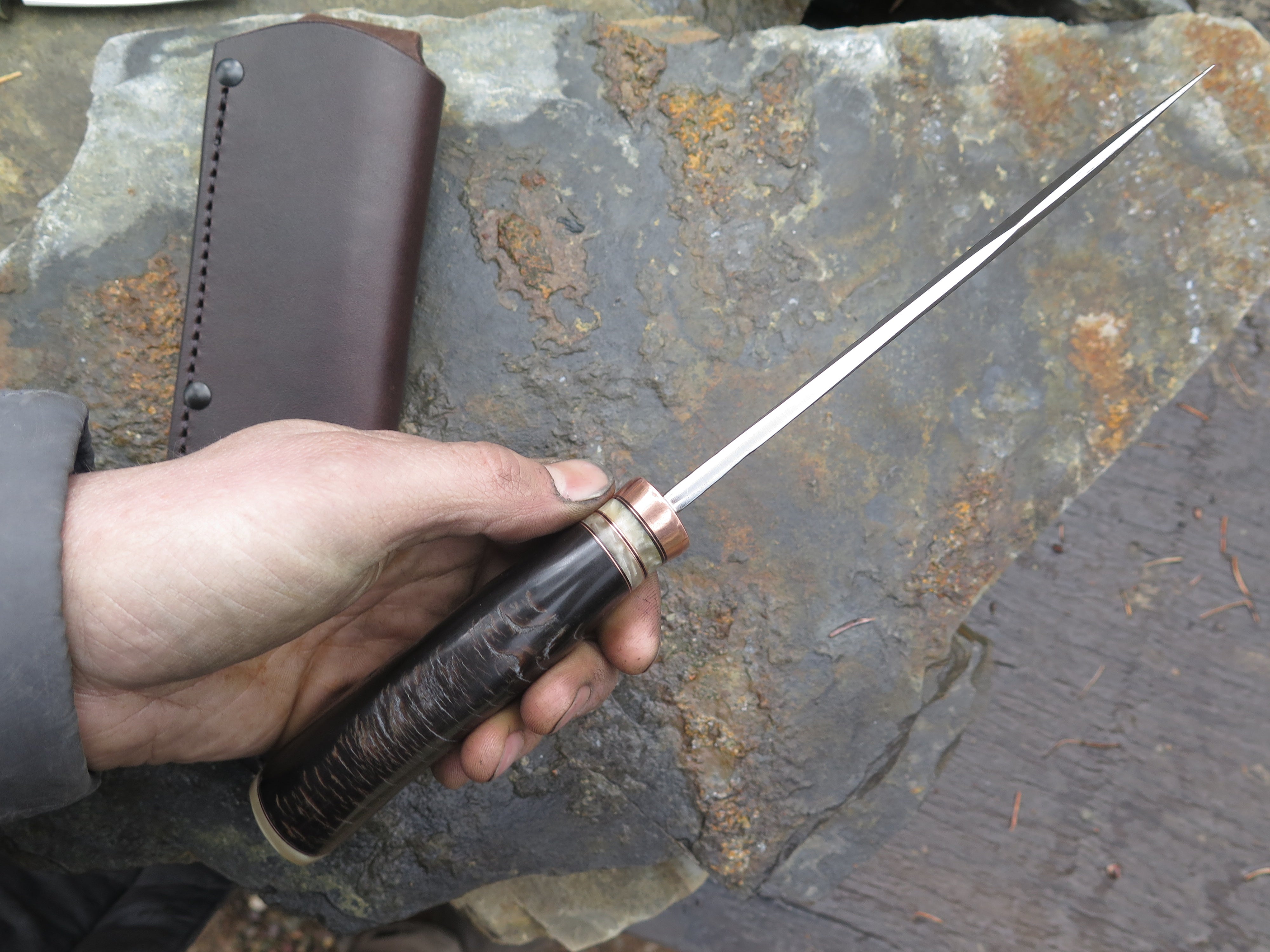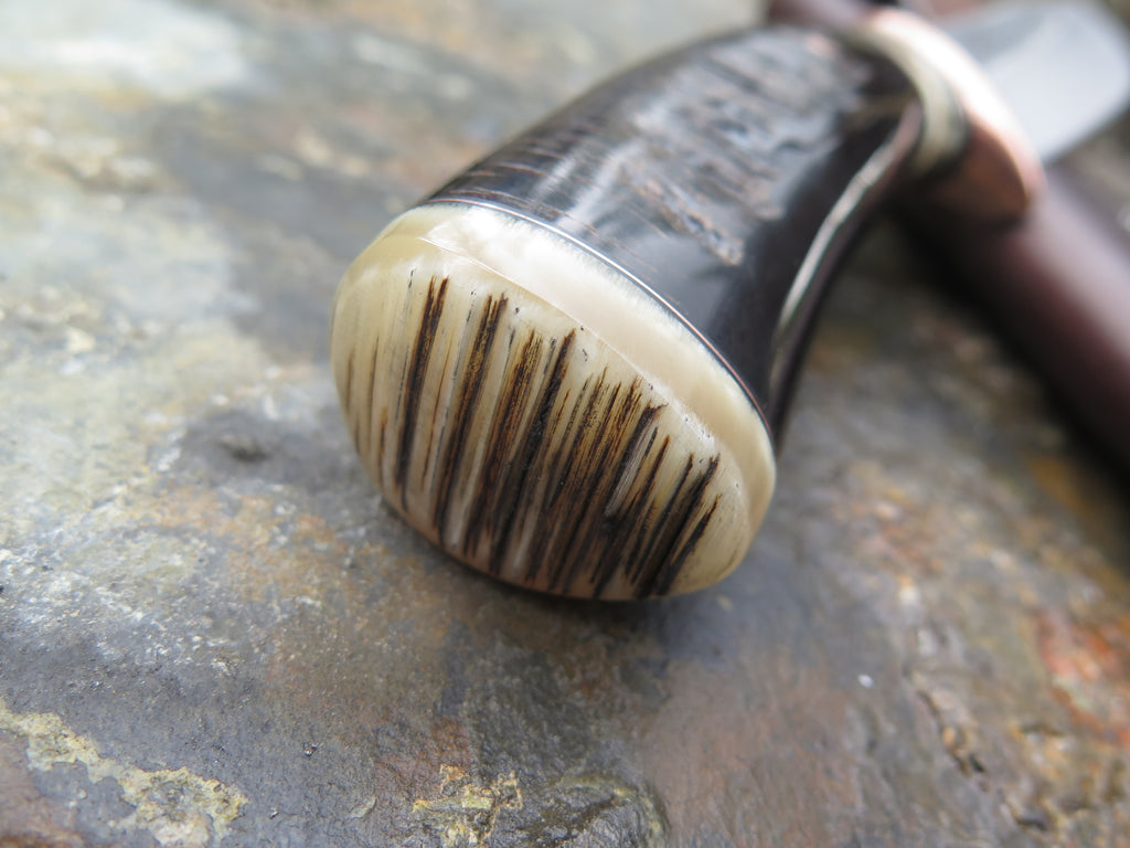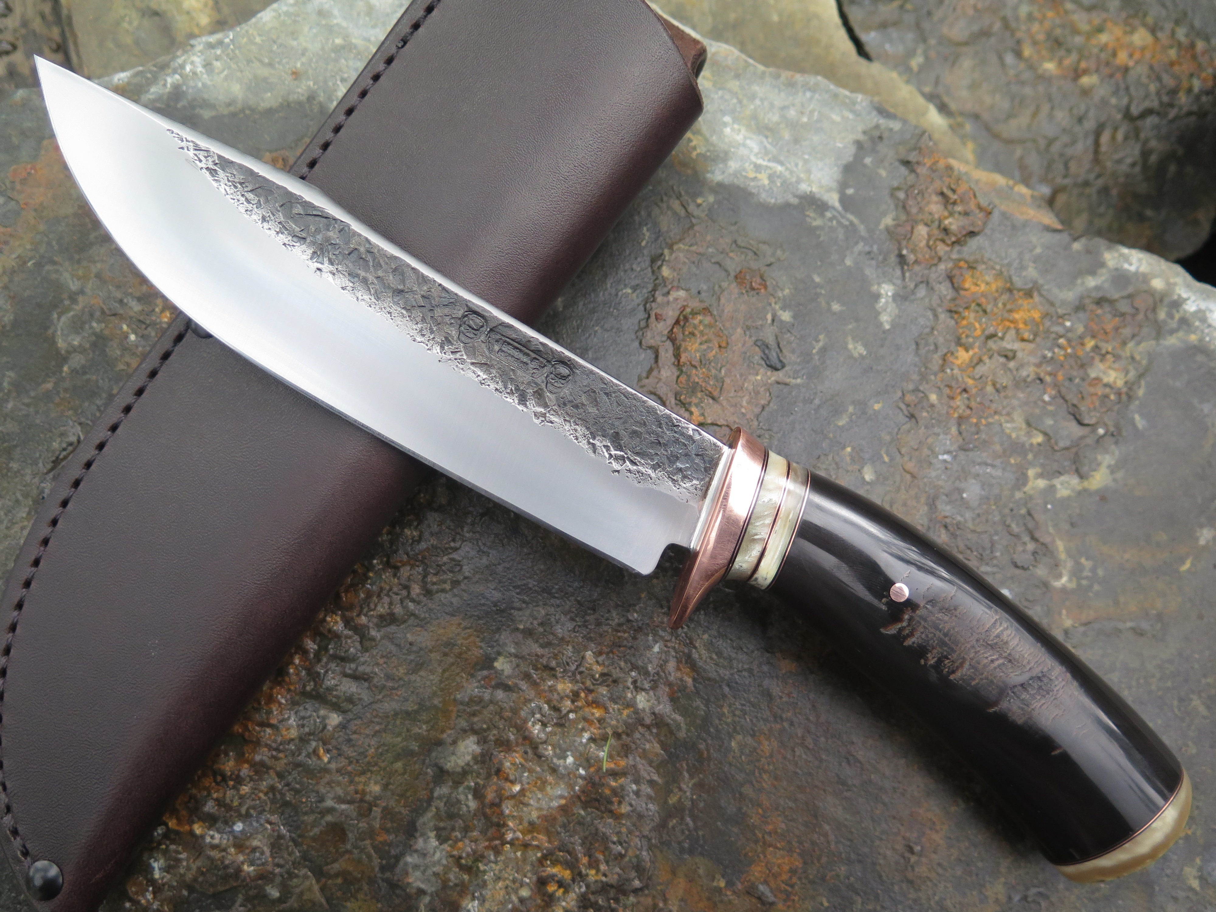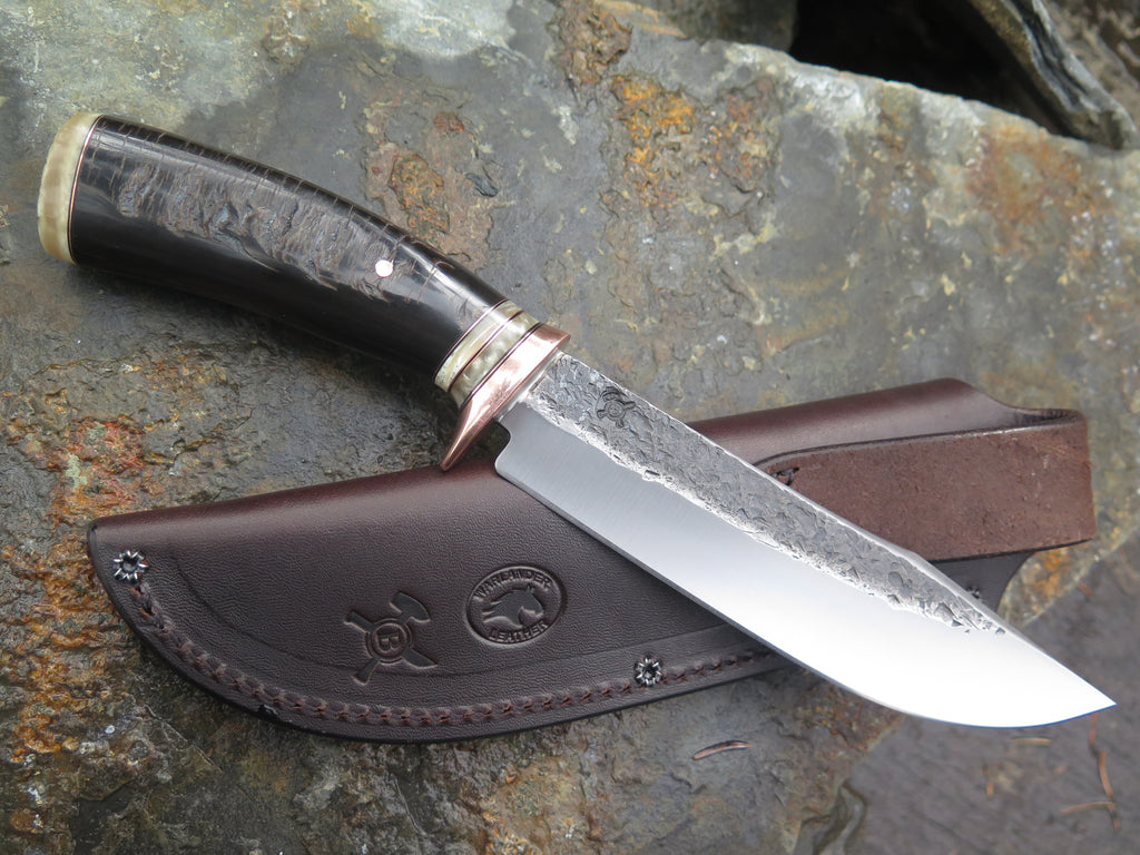 This new Clip Point from Behring Made© is hand forged from 13/64" thick high carbon 01 tool steel and it measures 6 1/4" from tip to guard with a razor sharp hollow grind and our hammermark finish. The copper guard is soldered in place above black fiber, copper and musk ox boss spacers with an African water buffalo horn that's pinned with copper and capped with musk ox boss as well. The overall length measures 11" and it comes in a classic leather belt pouch sheath.