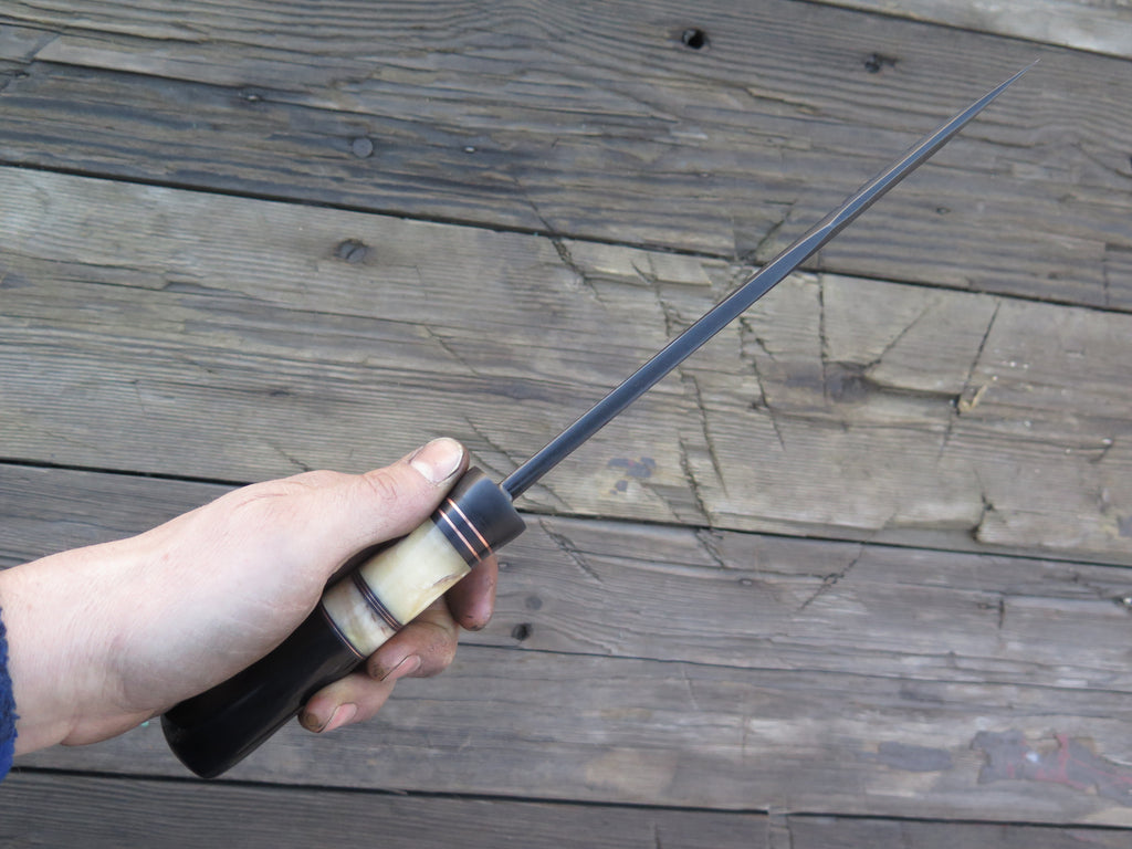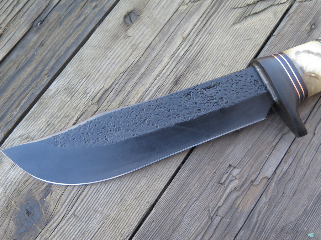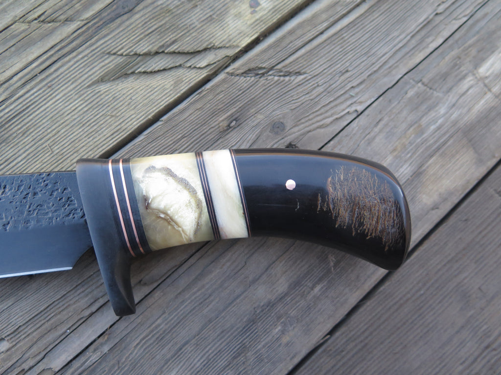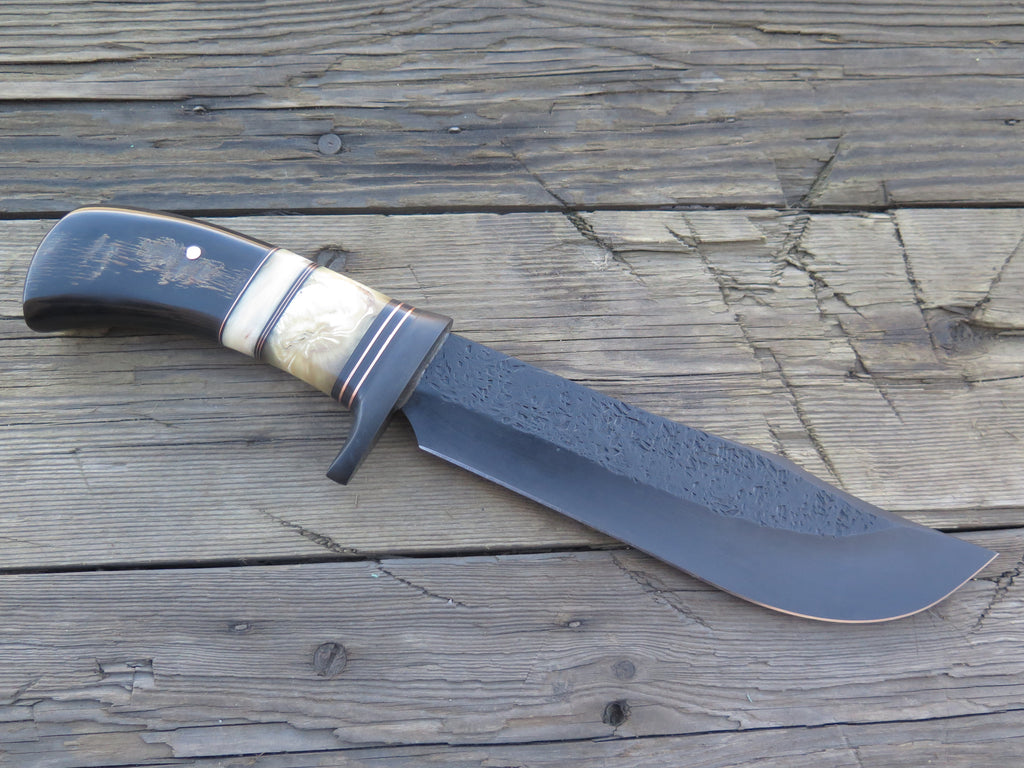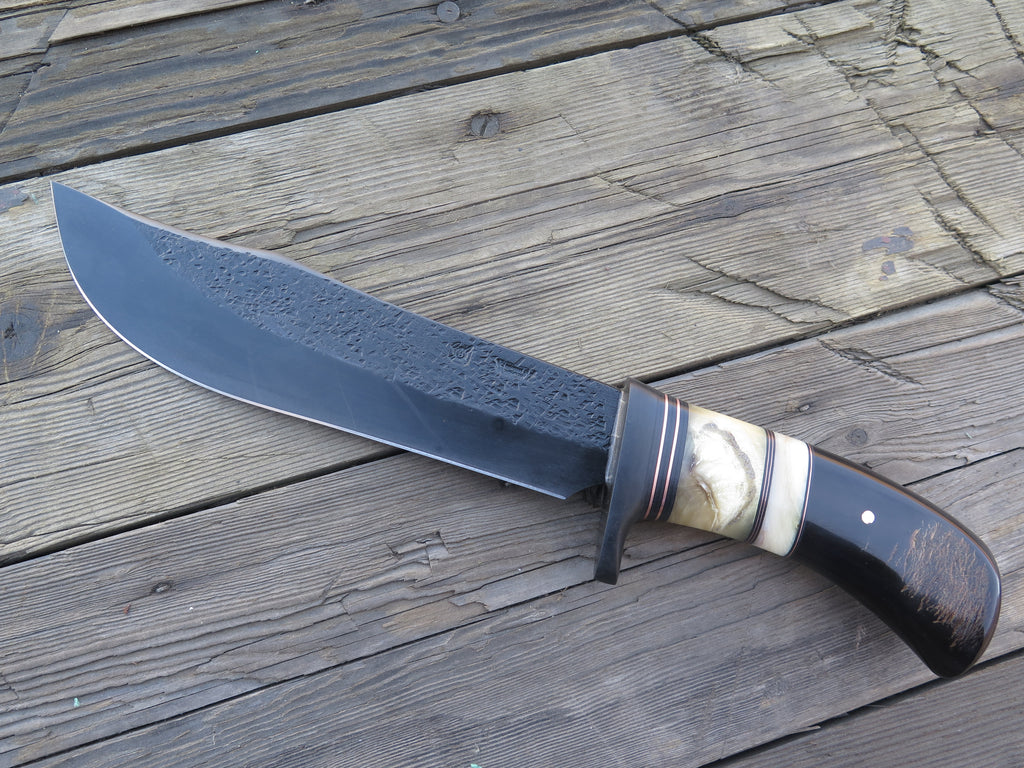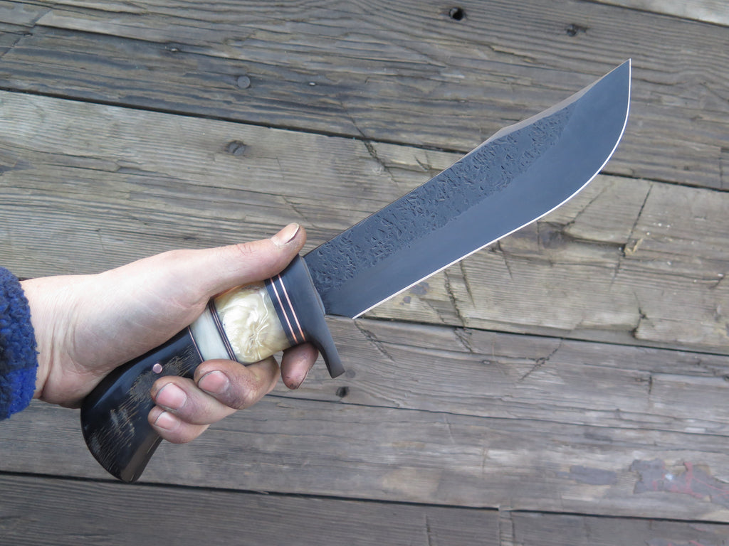 This new recurve bowie from Behring Made© is hand forged from 1/4" thick high carbon 01 tool steel and it measures 8 1/2" from tip to guard with a razor sharp hollow grind, hammermarks and our forced patina blued finish. The blued steel guard is soldered in place above black fiber, copper, musk ox and sheep horn spacers as well as a buffalo horn handle that's pinned with copper. The overall length measures 13 1/2" and it comes in a custom Warlander Leather sheath.