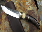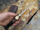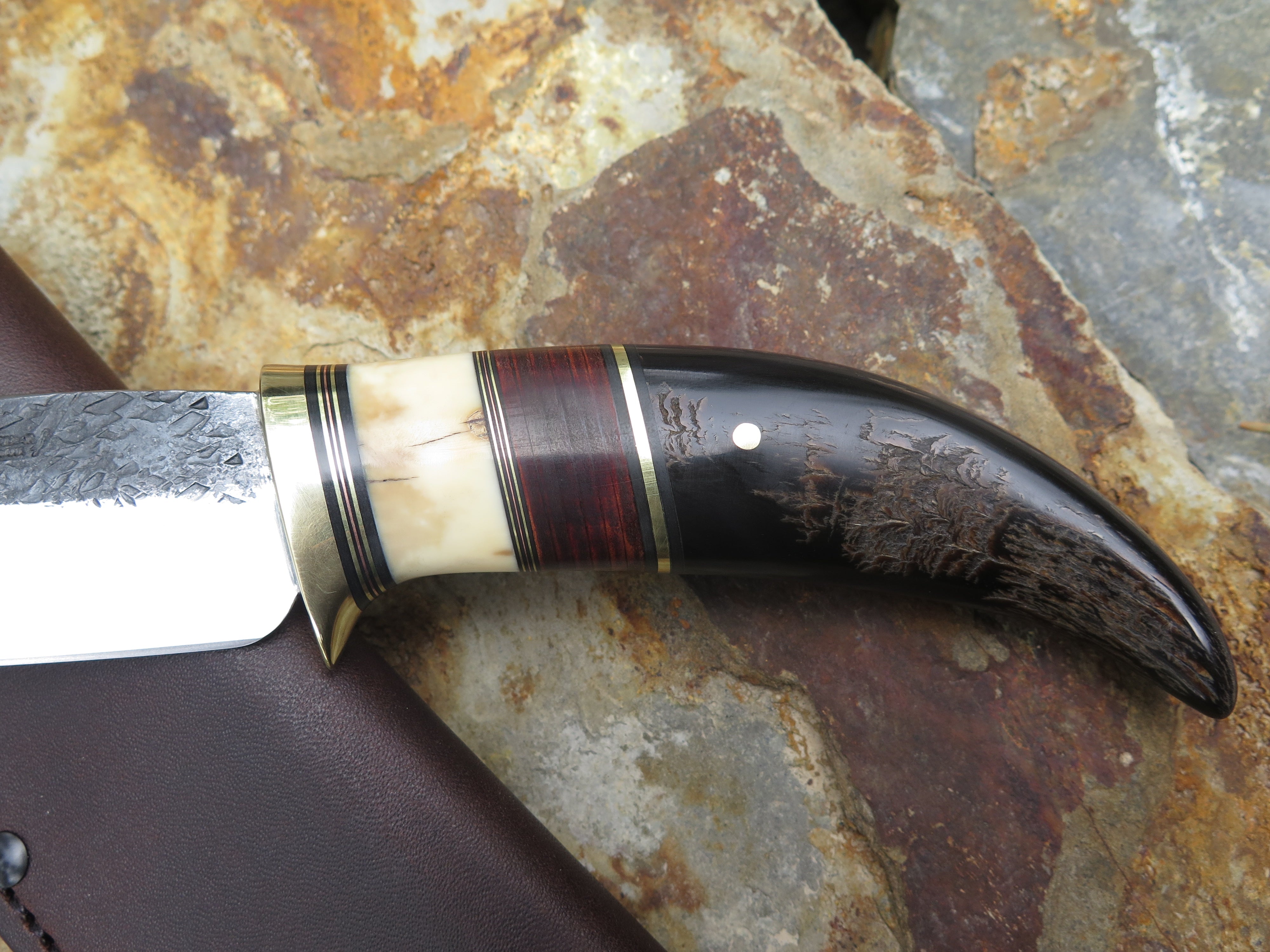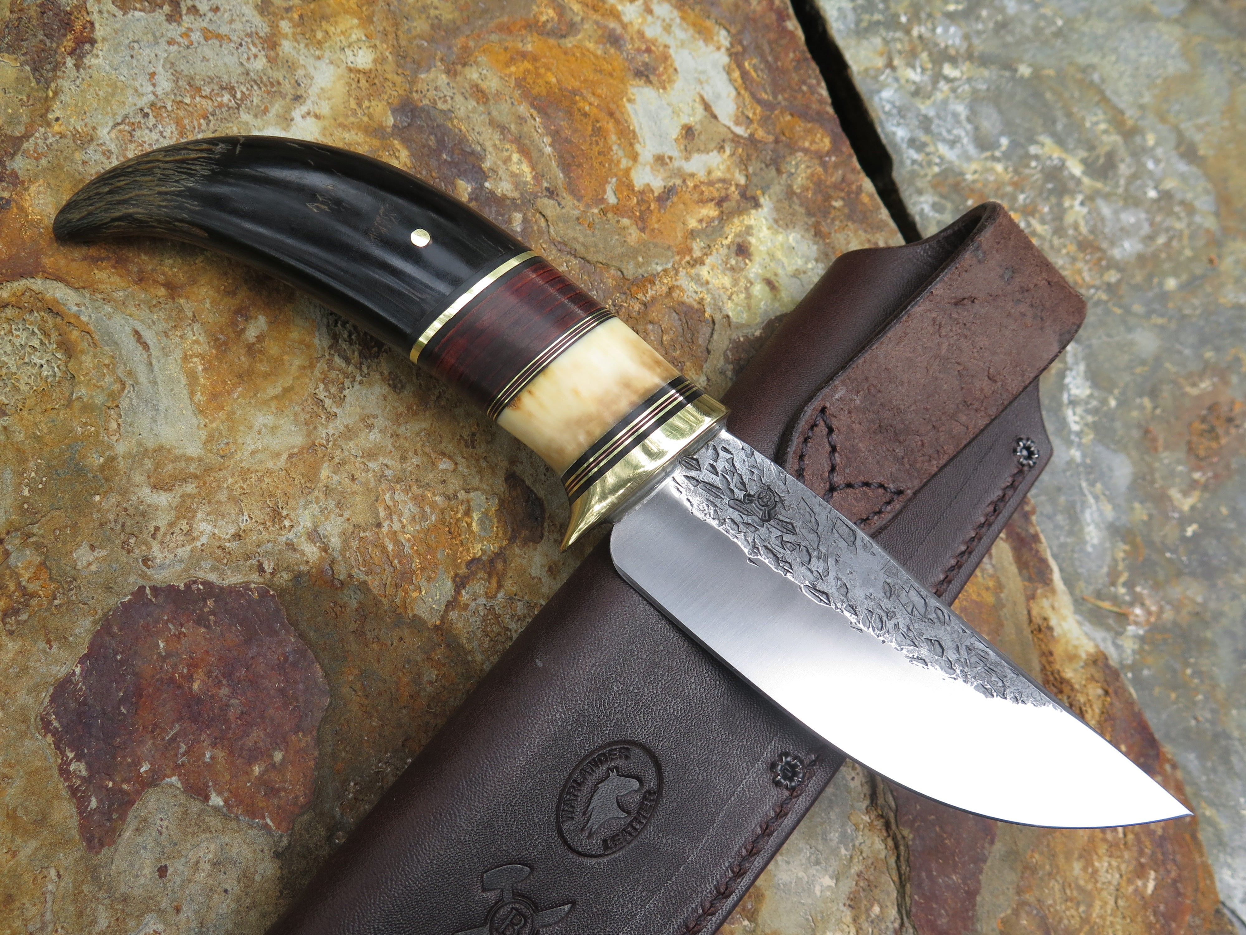 This beautiful new Hunter from Behring Made© is hand forged from 3/16" thick high carbon 01 tool steel and it measures 5" from tip to guard with a razor sharp hollow grind and our hammermark finish. The brass guard is soldered in place above black fiber, copper, brass, horsehide and fossil walrus ivory spacers with a buffalo horn tip handle that's pinned with brass through the tang. The overall length measures just over 10" and it comes in a classic leather belt pouch sheath.