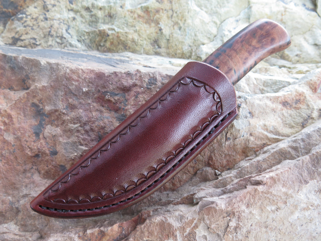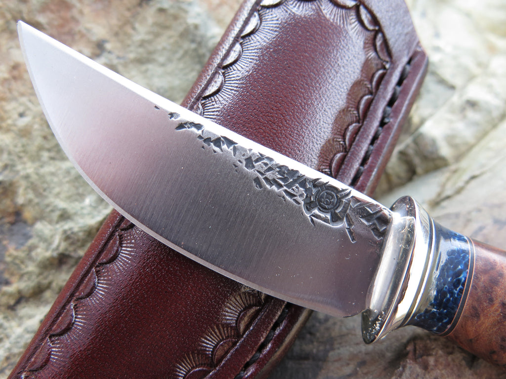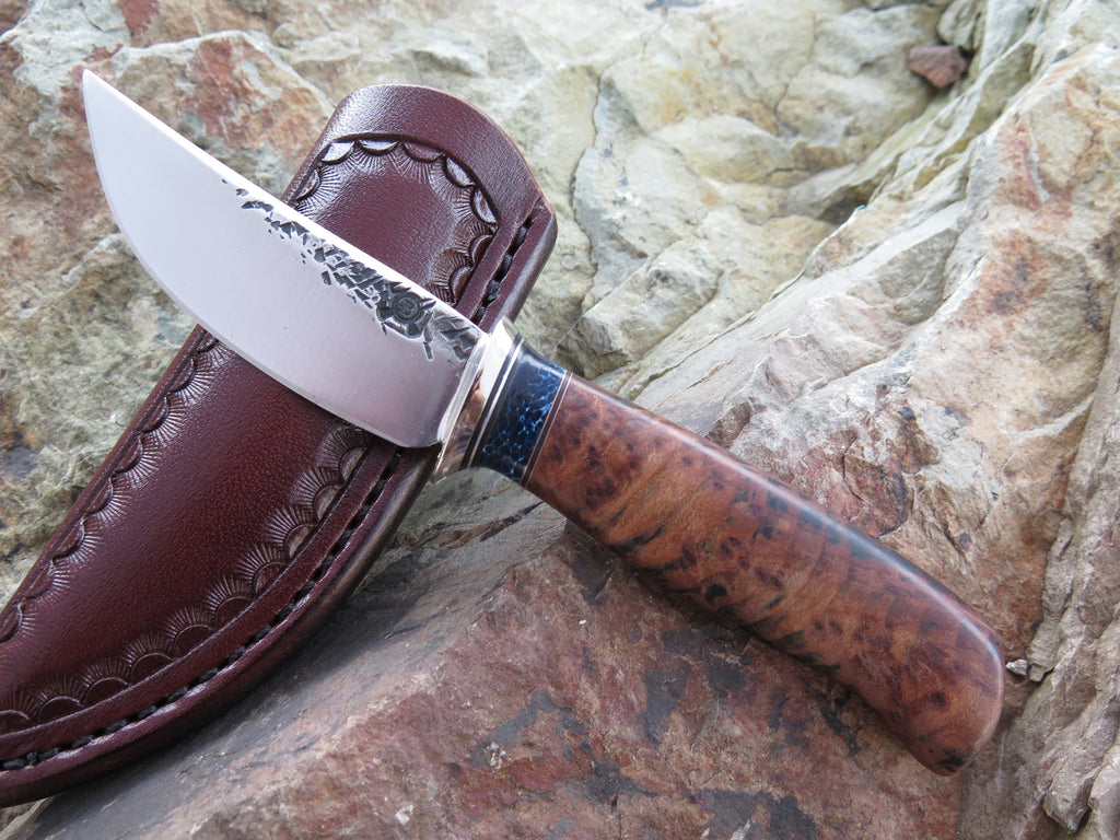 This beautiful new Pocket Knife from Behring Made is hand forged from 1/8" thick high carbon 01 tool steel and it measures 2 3/4" from tip to guard with a razor sharp hollow grind and our hammermark finish. The nickel silver guard is soldered in place above black fiber, aluminum, copper and gorgeous stabilized giraffe bone spacers. The handle is made from California Redwood and the overall length measures 6 3/8". This one comes in a custom sheath from Warlander Leather designed for wear inside the front or rear right pocket.