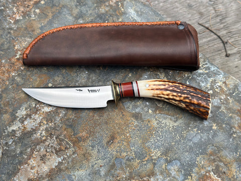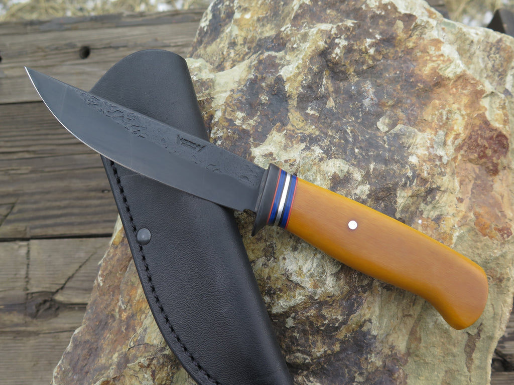 This new Trout & Bird from Behring Made© is a straight forward ultra user that excels in all things hunting, fishing, and steakhouse show-boatin'. The blade is hand forged from 1/8" thick high carbon 01 tool steel and measures 4 3/4" from tip to guard with a razor sharp hollow grind and our forced patina blued finish. The blued steel guard is soldered in place above black, maroon and blue fiber with aluminum spacers atop a classic westinghouse yellow micarta handle that's pinned through the tang with aluminum. Overall length measures 9" and it comes in a Warlander Leather pouch sheath.