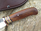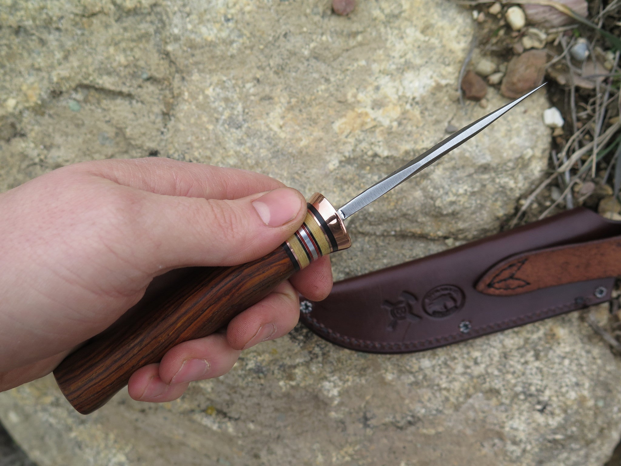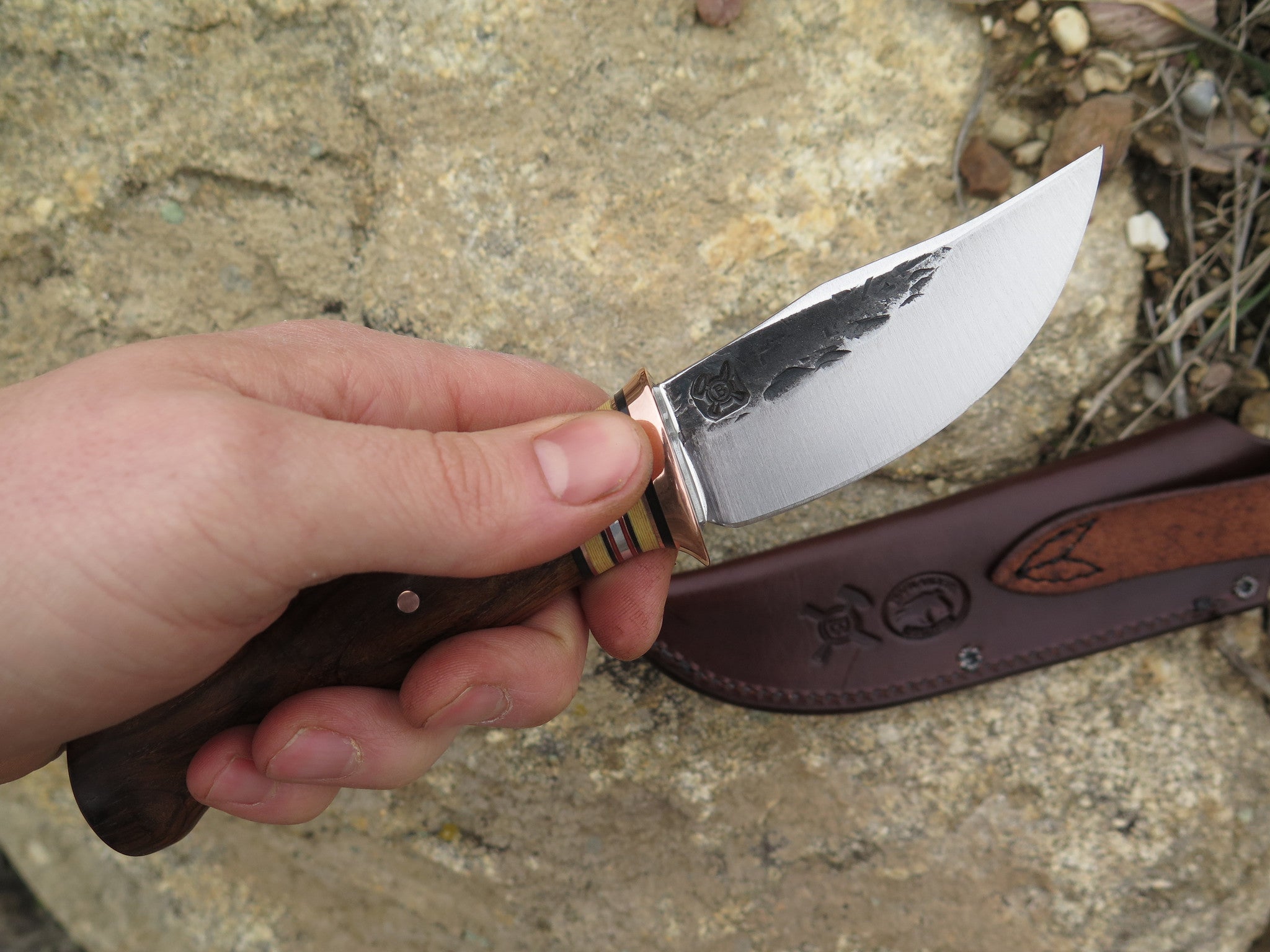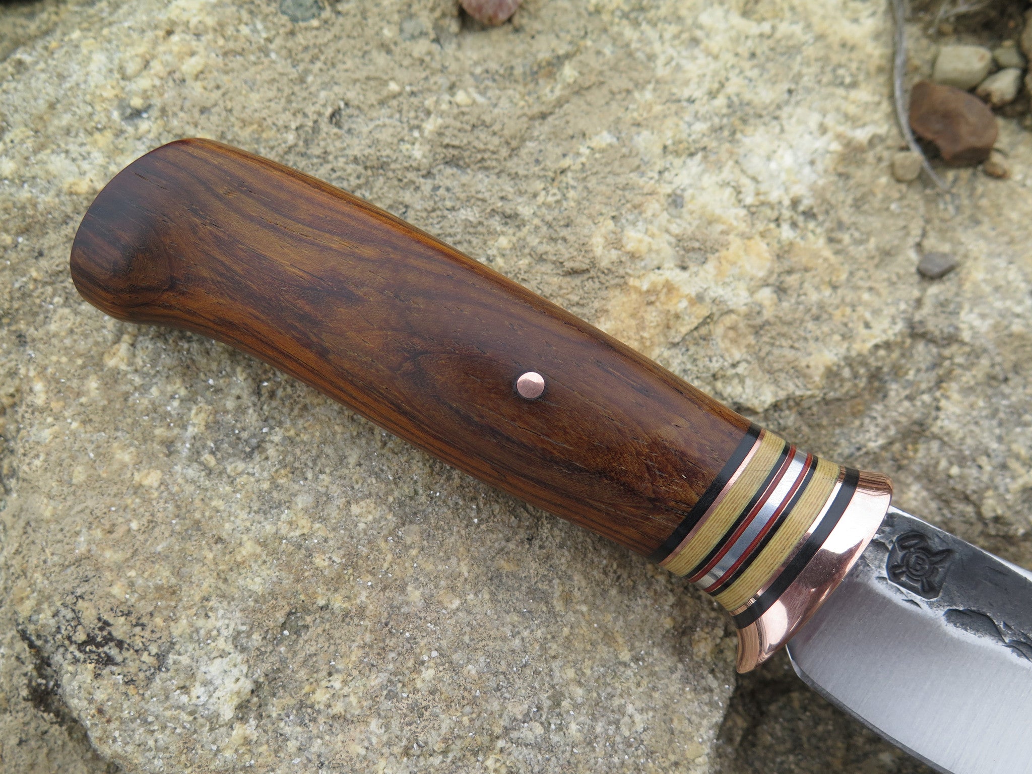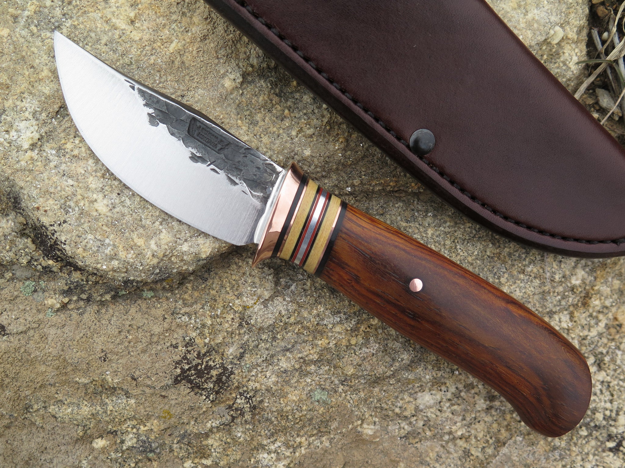 This incredible Behring Made™ Sharptail is hand forged from 3/16" thick high carbon 01 tool steel and it measures 3 1/4" from tip to guard with a razor sharp hollow grind and our hammermark finsh. The copper guard is soldered in place above black and maroon fiber, copper, aluminum and ivory micarta spacers that create a beautiful contrast with the cocobolo handle that's pinned through the tang with copper. The overall length measures 7 7/8" and it comes in a Warlander Leather pouch sheath.