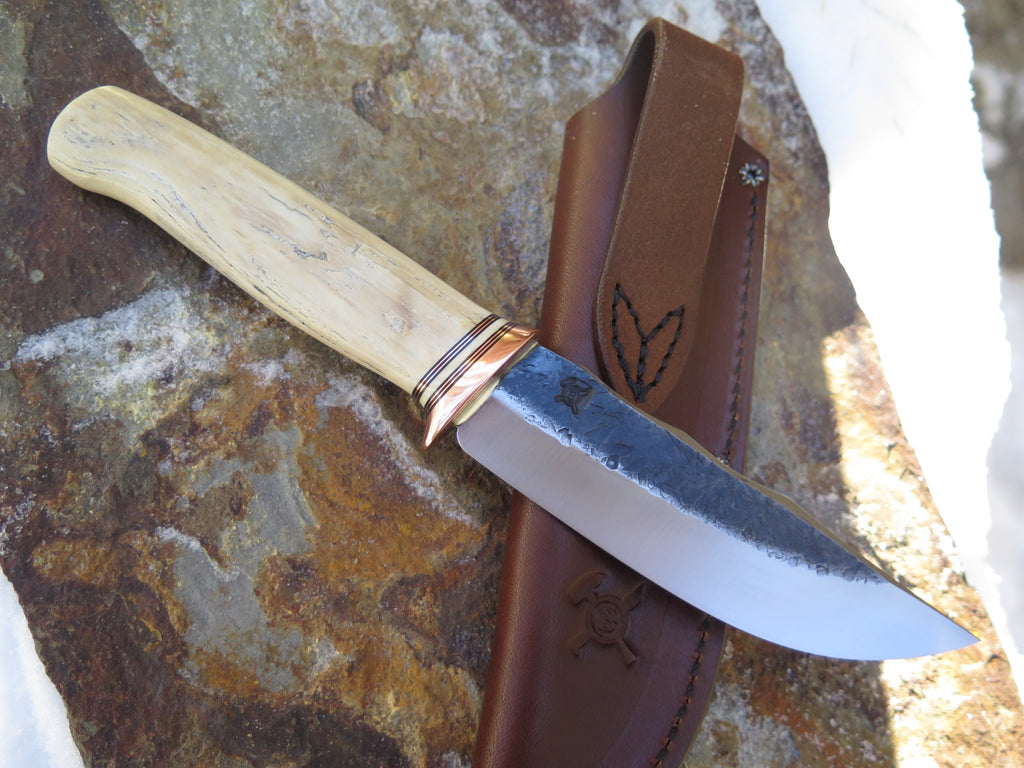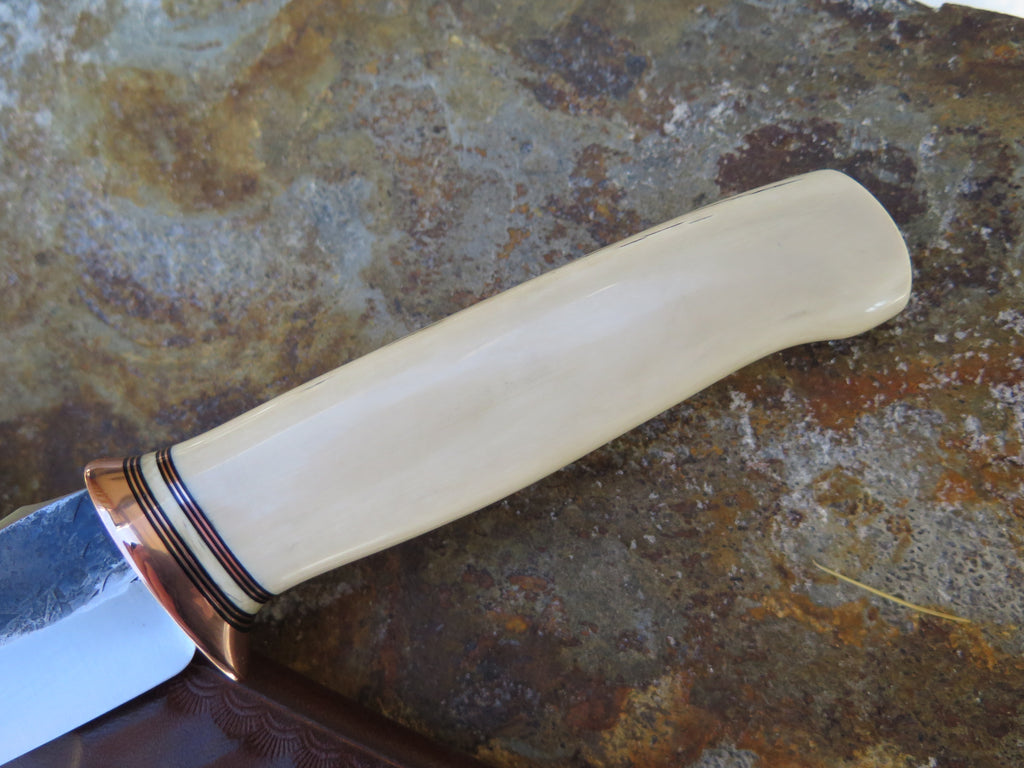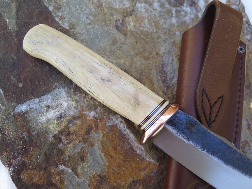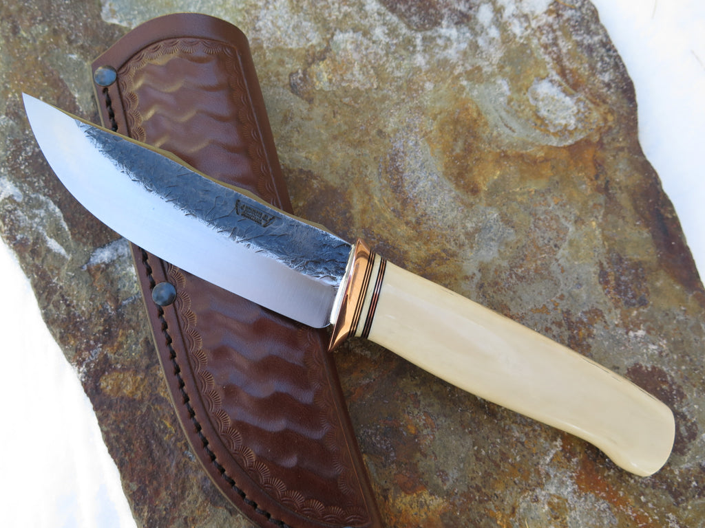 This beautiful new triple clip point from Behring Made© is a tribute to one of Bill Scagel's blade shapes that is hand forged from 3/16" thick high carbon 01 tool steel and measures with a razor sharp hollow grind that measures 4 3/4" with a hammermark finish. The copper guard is soldered in place above black fiber, copper and mammoth ivory spacers which top a premium ancient mammoth ivory handle. Overall length measures 9 3/8" and it comes in a ripple tooled pouch sheath.