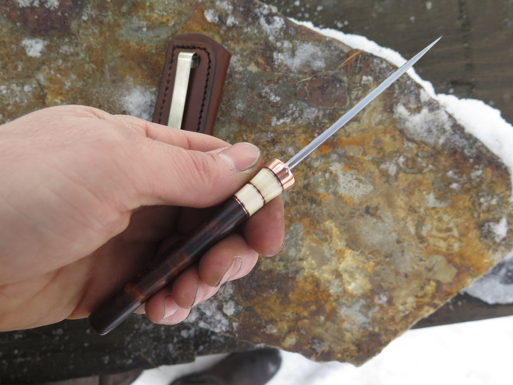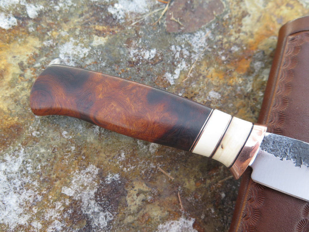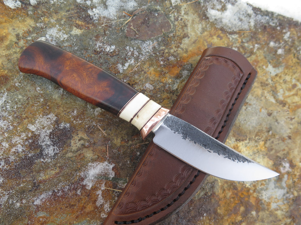 This beautiful Behring Made© Pocket Knife is hand forged from 1/8" thick high carbon 01 tool steel and it measures 3" from tip to guard with a razor sharp hollow grind and our hammermark finish. The copper guard is soldered in place above black fiber and copper with two ancient mammoth ivory spacers to boot. The premium desert ironwood burl handle brings the overall length to measure 6 3/4" and it comes in a right hand pocket clip sheath.