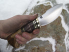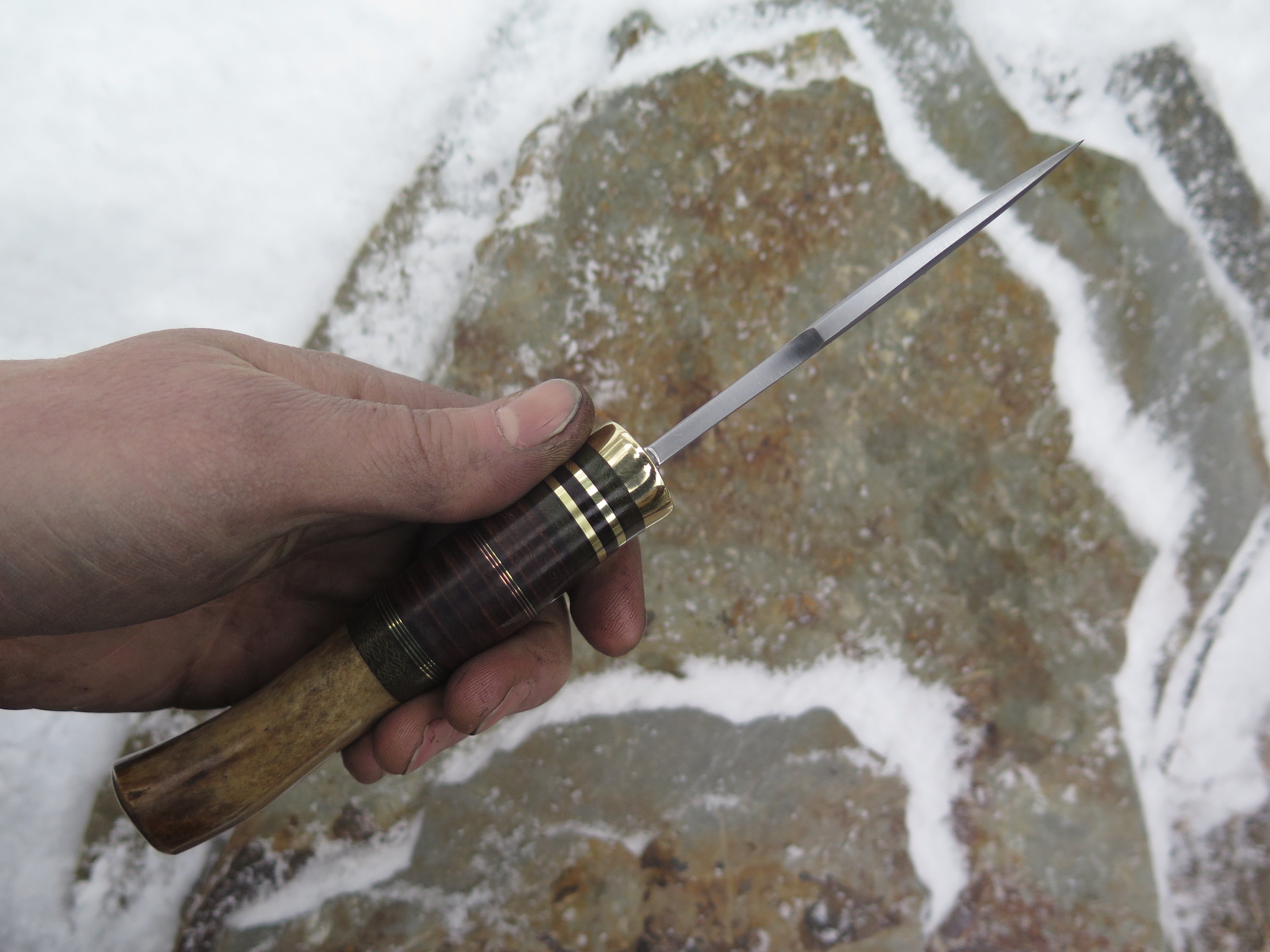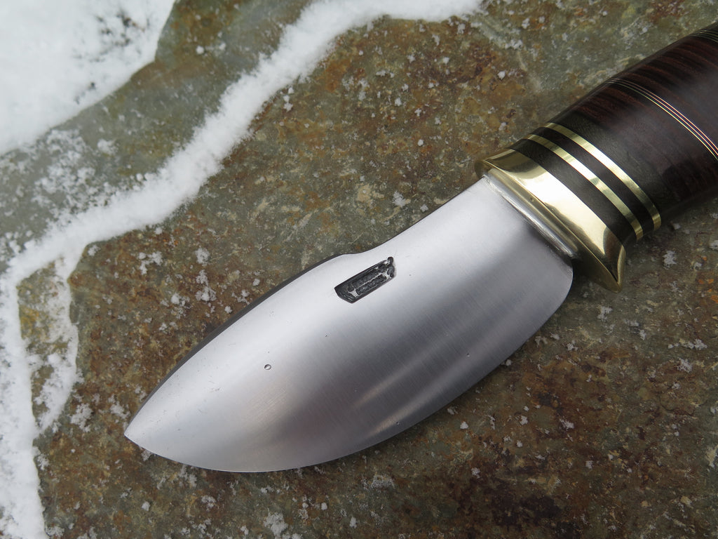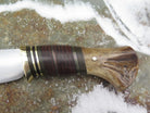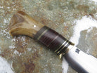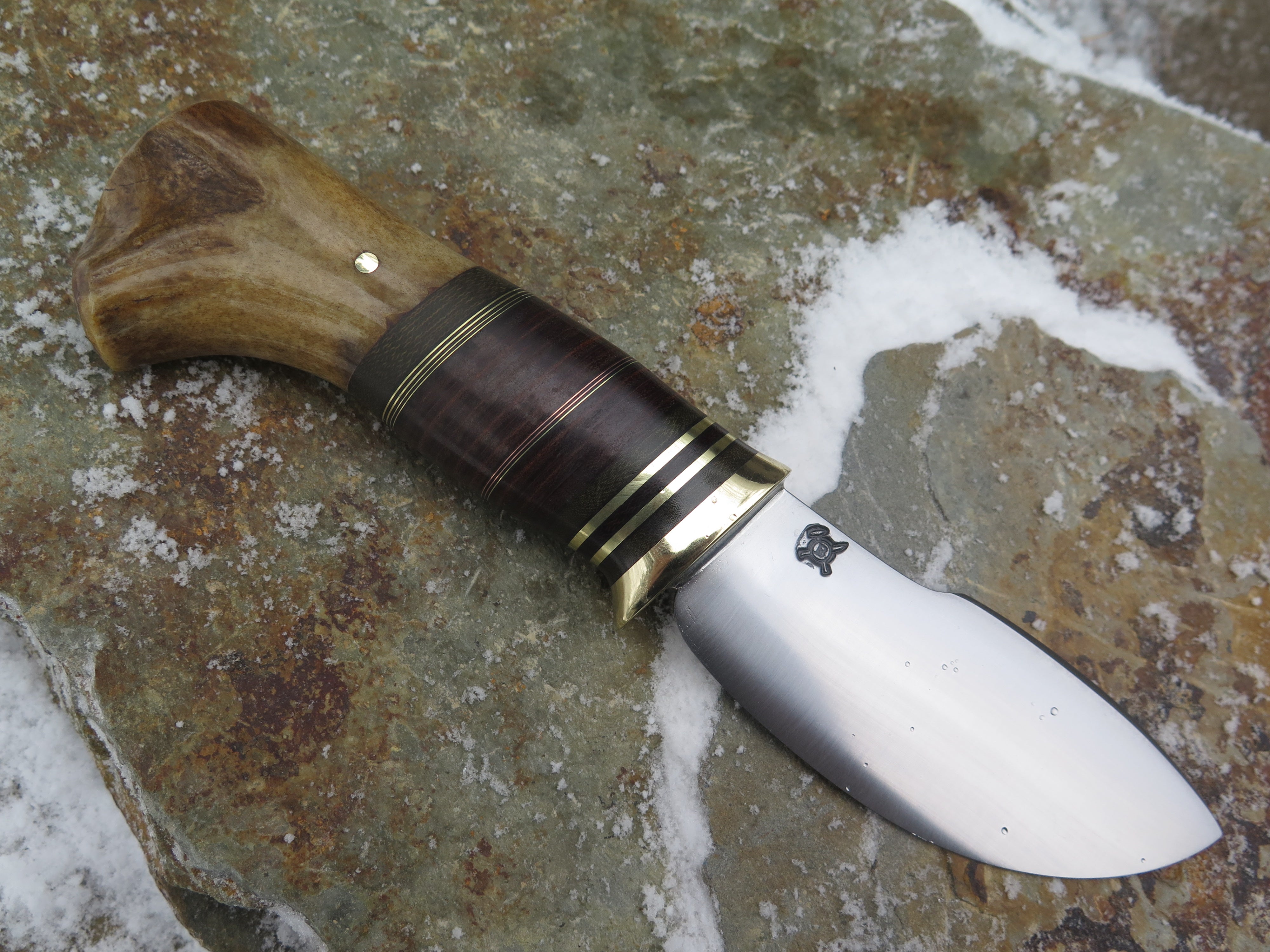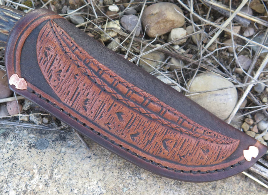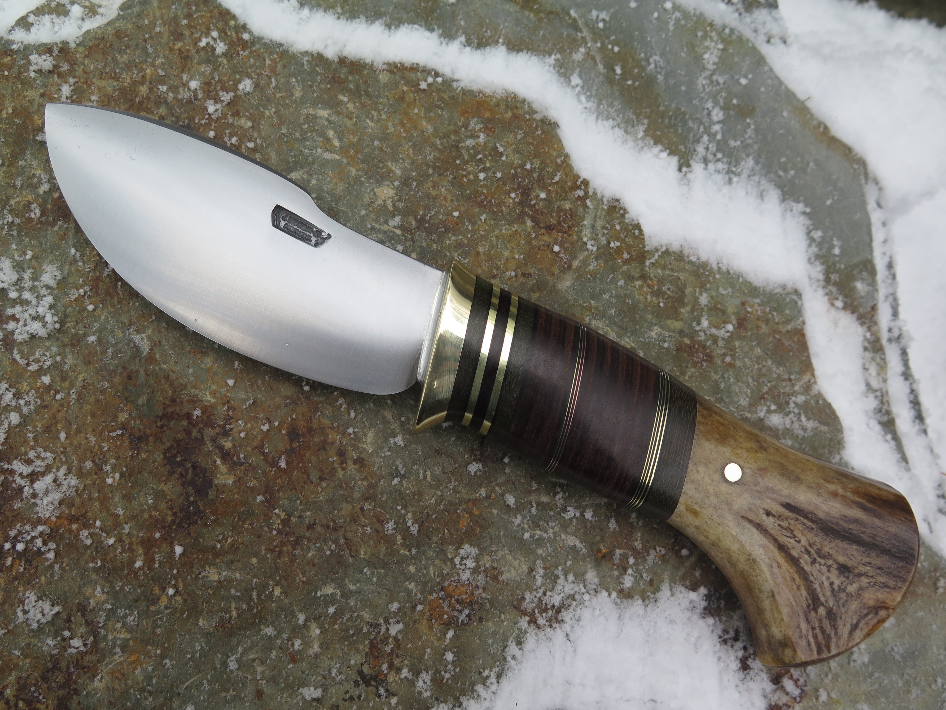 This beautiful new Canoe knife from Behring Made© is hand forged from 3/16" thick high carbon 01 tool steel and it measures 4" from tip to guard with a razor sharp convex grind. The brass guard is soldered in place above black fiber, brass, green micarta, horsehide leather spacers and a crotch stag butt that's pinned through the tang with brass. The overall length measures 8 3/4" and I'm sending this one to Mudbone for a similar looking canoe style pouch sheath.
