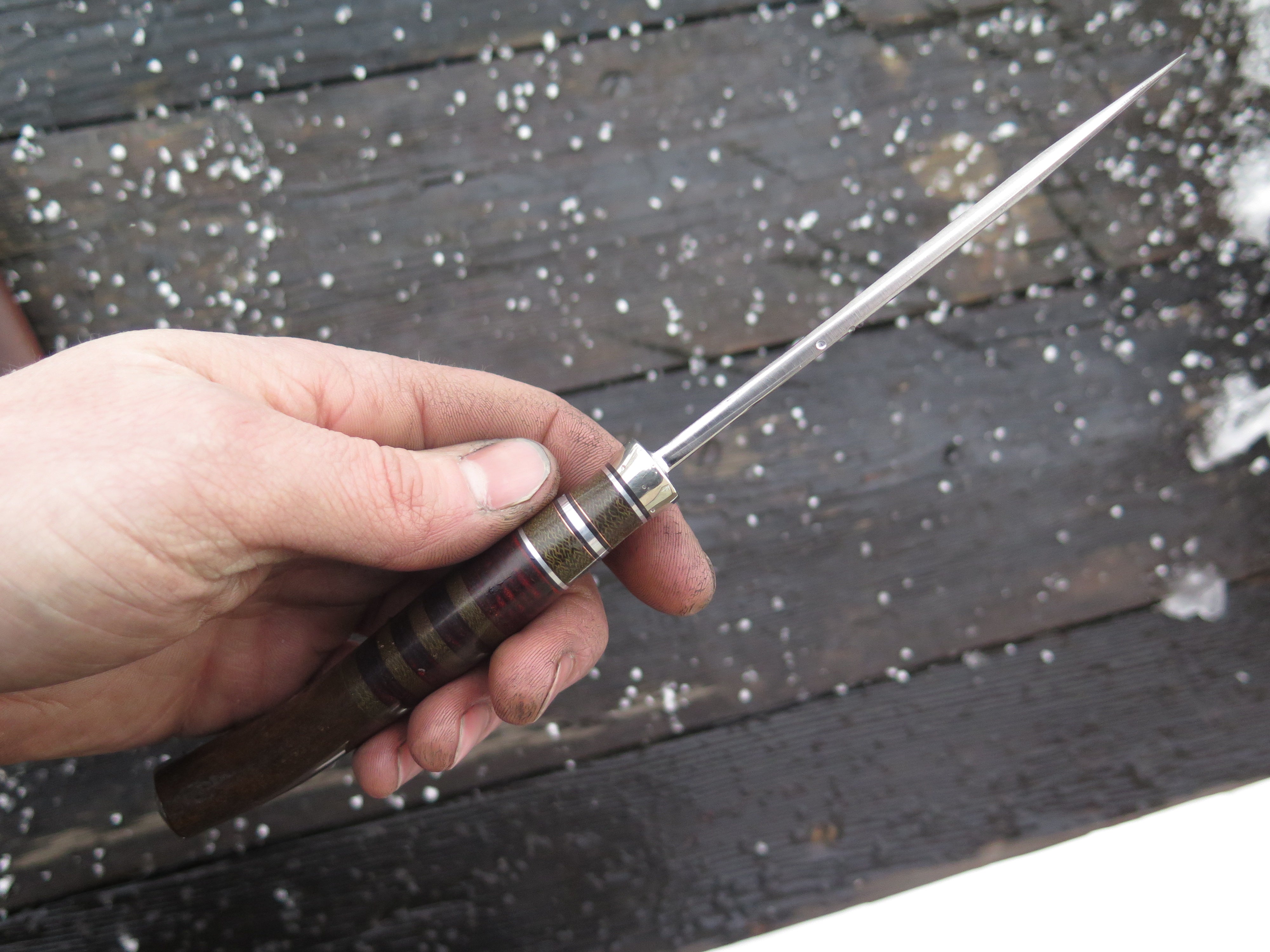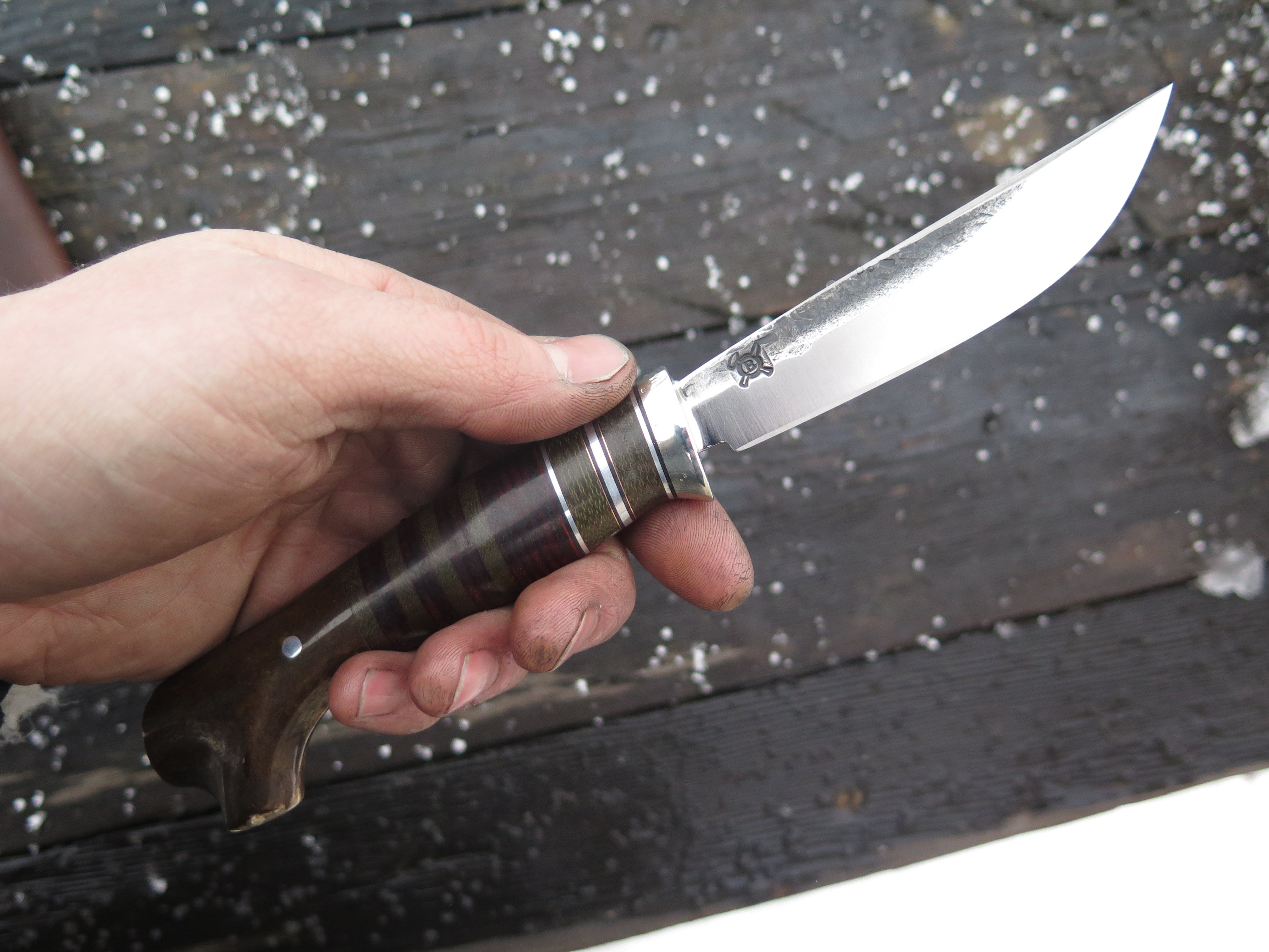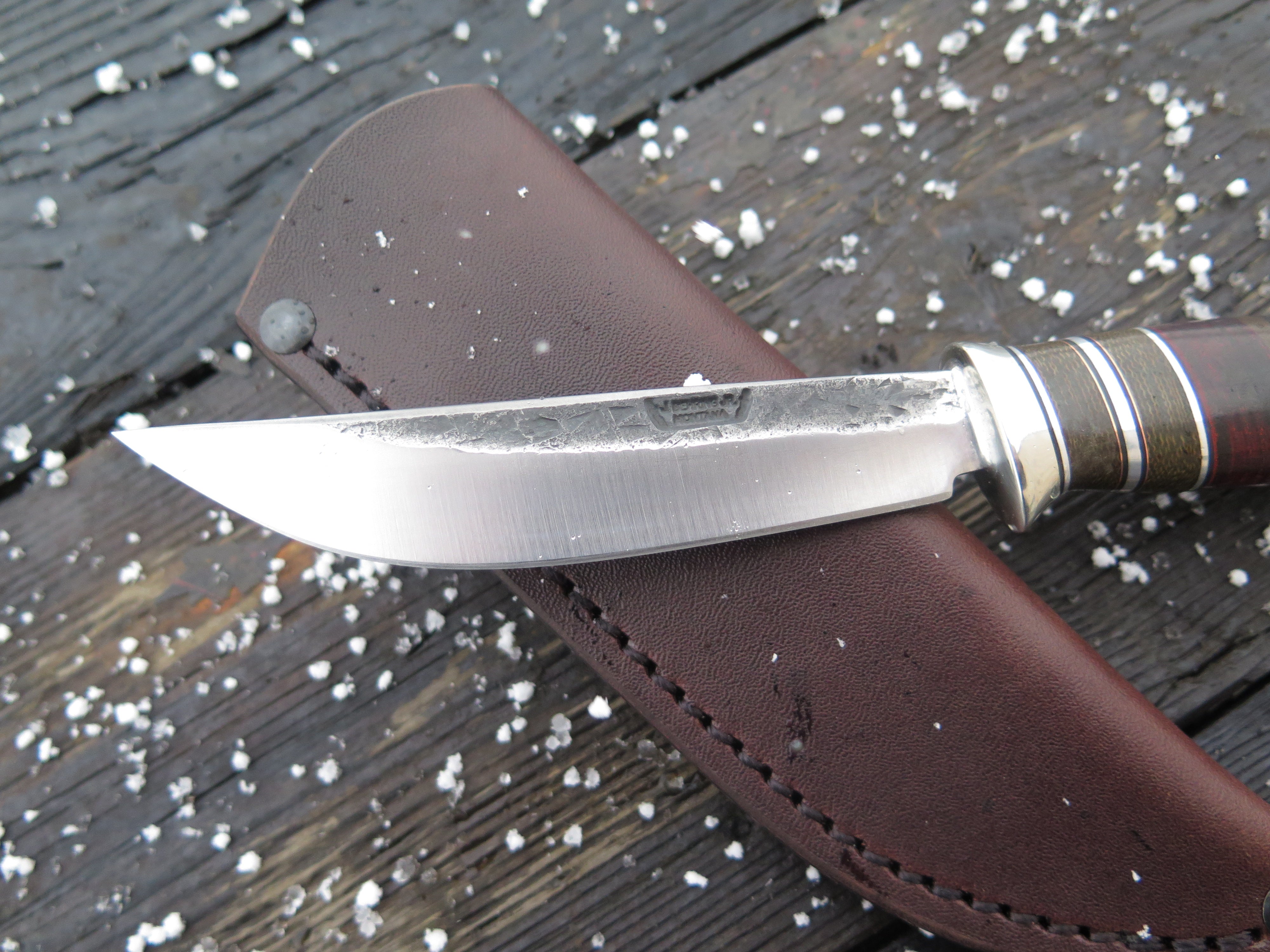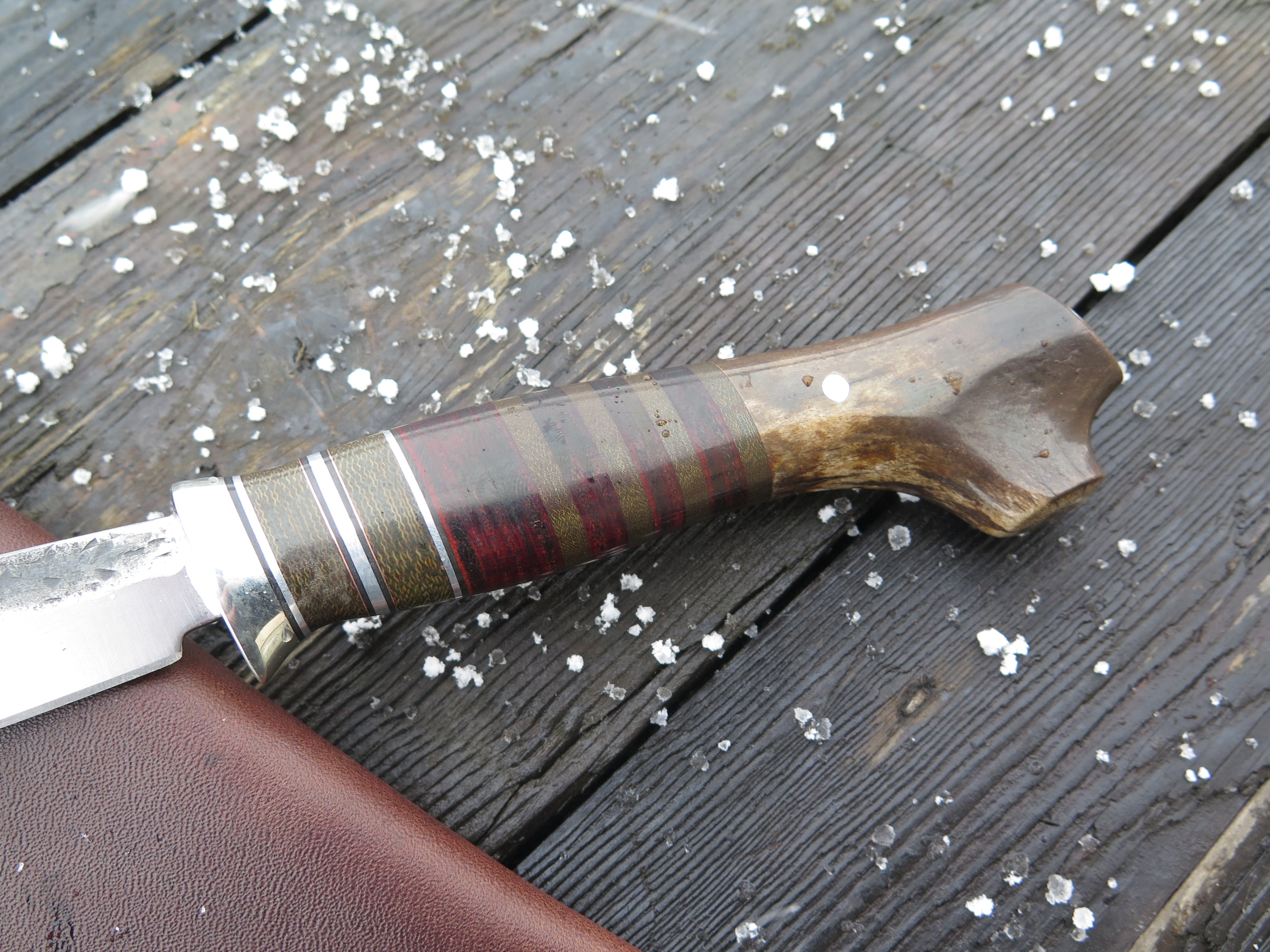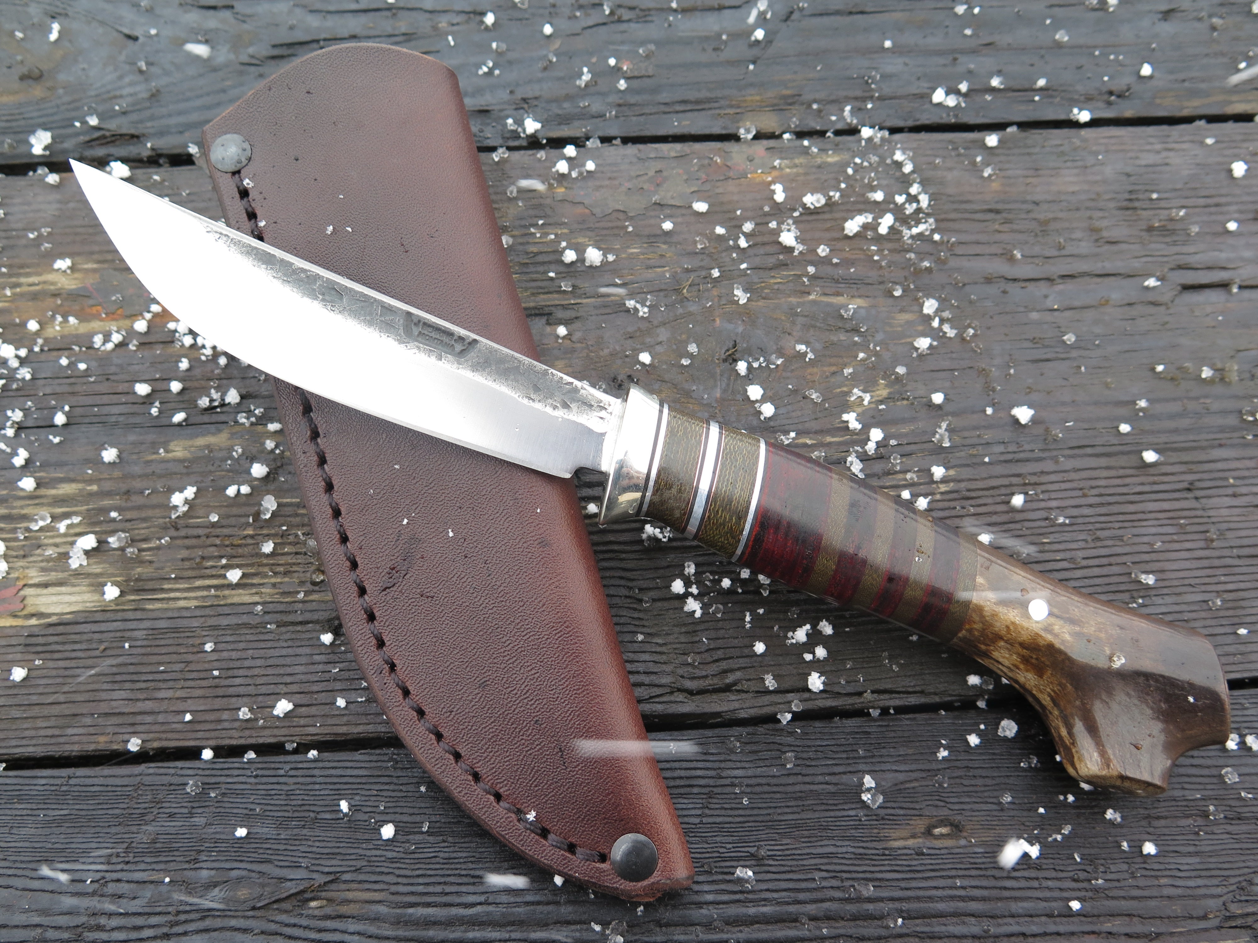 This Trout & Bird from Behring Made© may be brand-spankin'-new but it's truly an instant classic. The blade is hand forged from 3/16" thick high carbon 01 tool steel and it measures 4 1/4" from tip to guard with a razor sharp hollow grind and our hammermark finish. The nickel silver guard is soldered in place above black fiber, green micarta, copper, aluminum and horsehide leather spacers atop a whitetail crotch stag butt that's pinned through the tang with aluminum. The overall length measures 9" and it comes ready to stand the test of time in a simple belt pouch sheath.