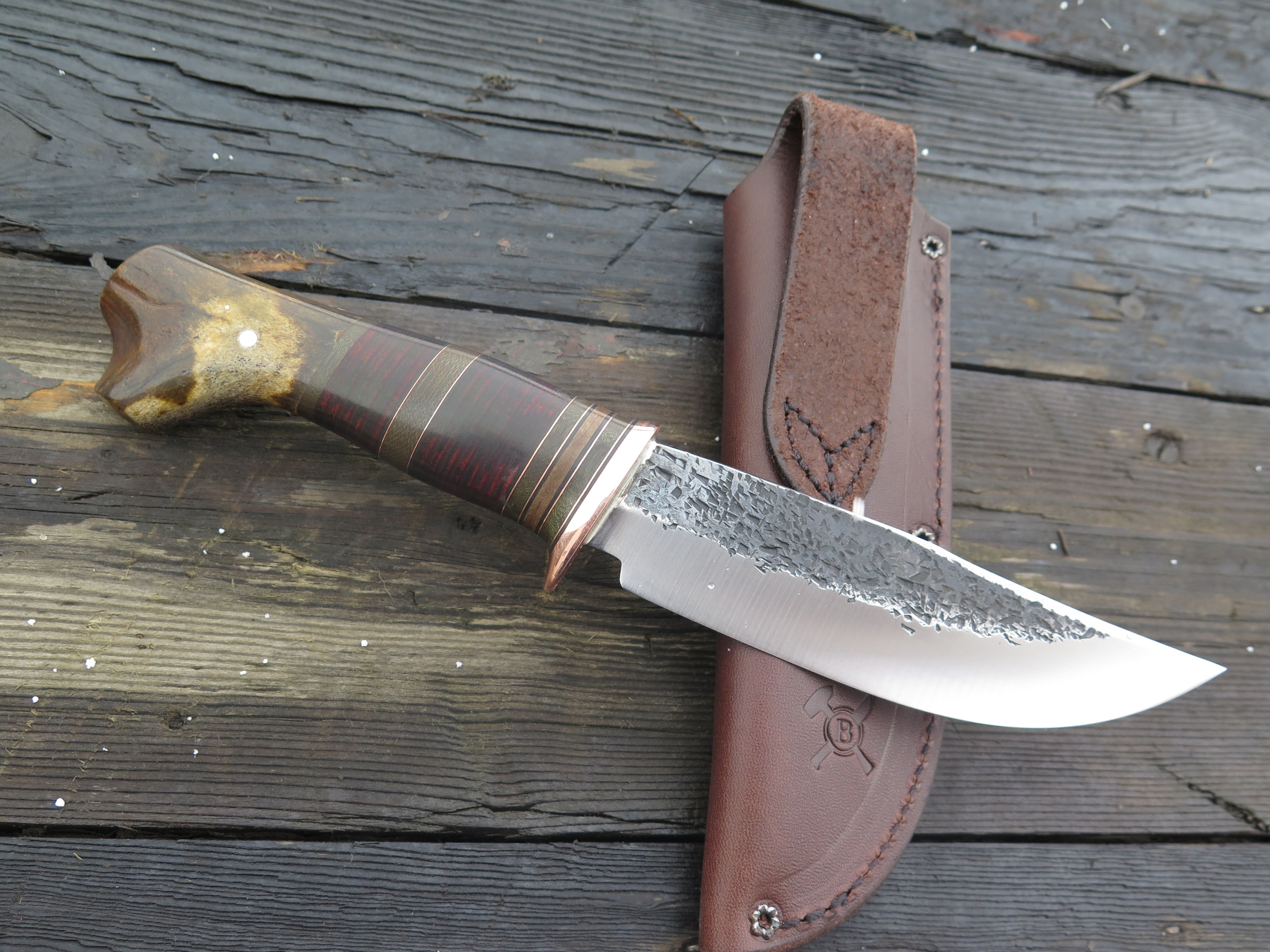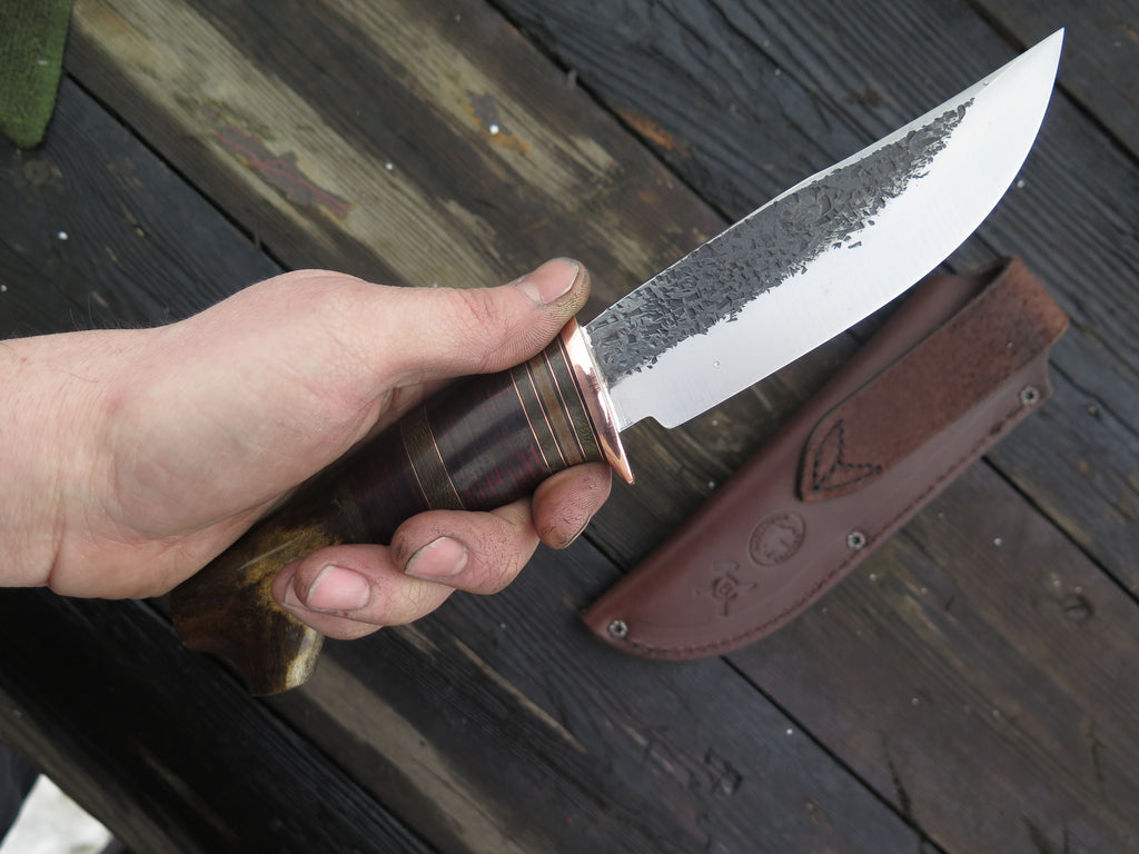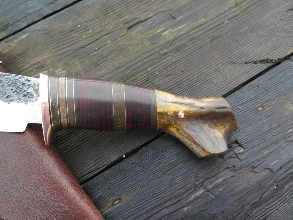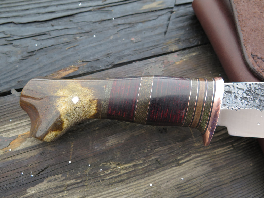 This bad ass new Hunter from Behring Made© is hand forged from 3/16" thick high carbon 01 tool steel and it measures 5 1/2" from tip to guard with a razor sharp hollow grind and our hammermark finish. The copper guard is soldered in place above black and gray fiber, green micarta, copper and horsehide leather as well as a premium whitetail stag crotch that's pinned through the tang with copper. The overall measures 10 1/4" and it also comes in a classic belt pouch sheath.