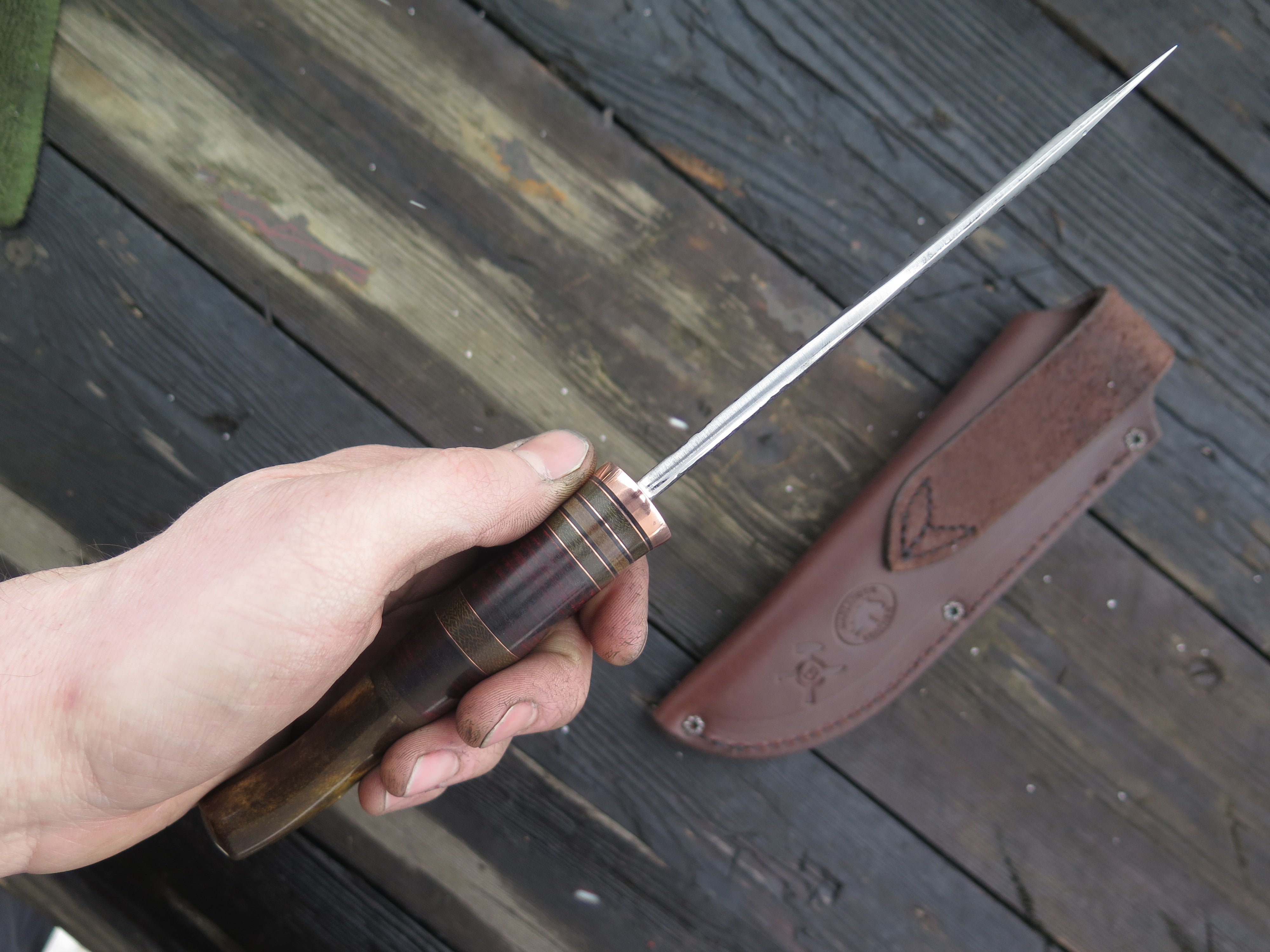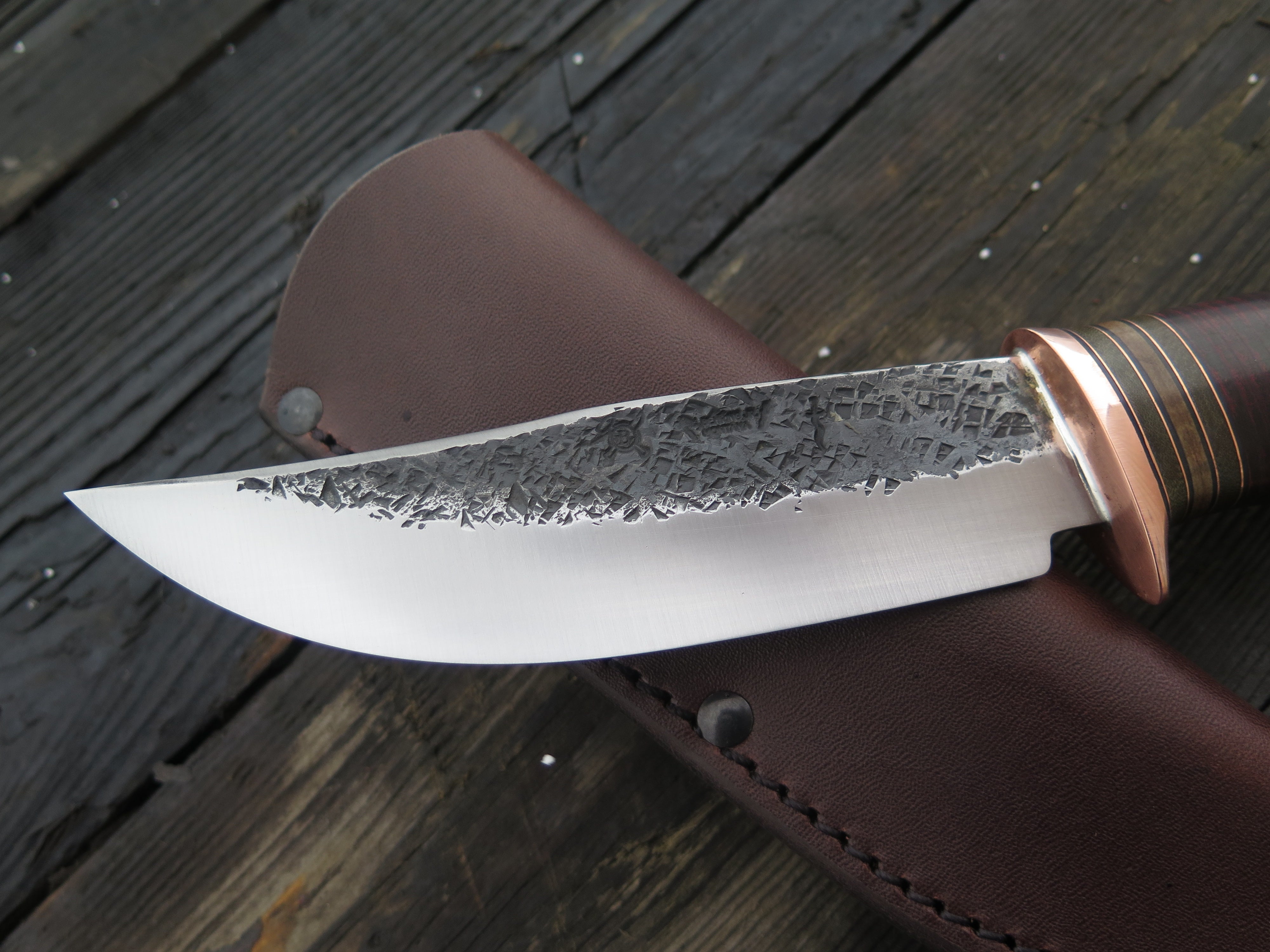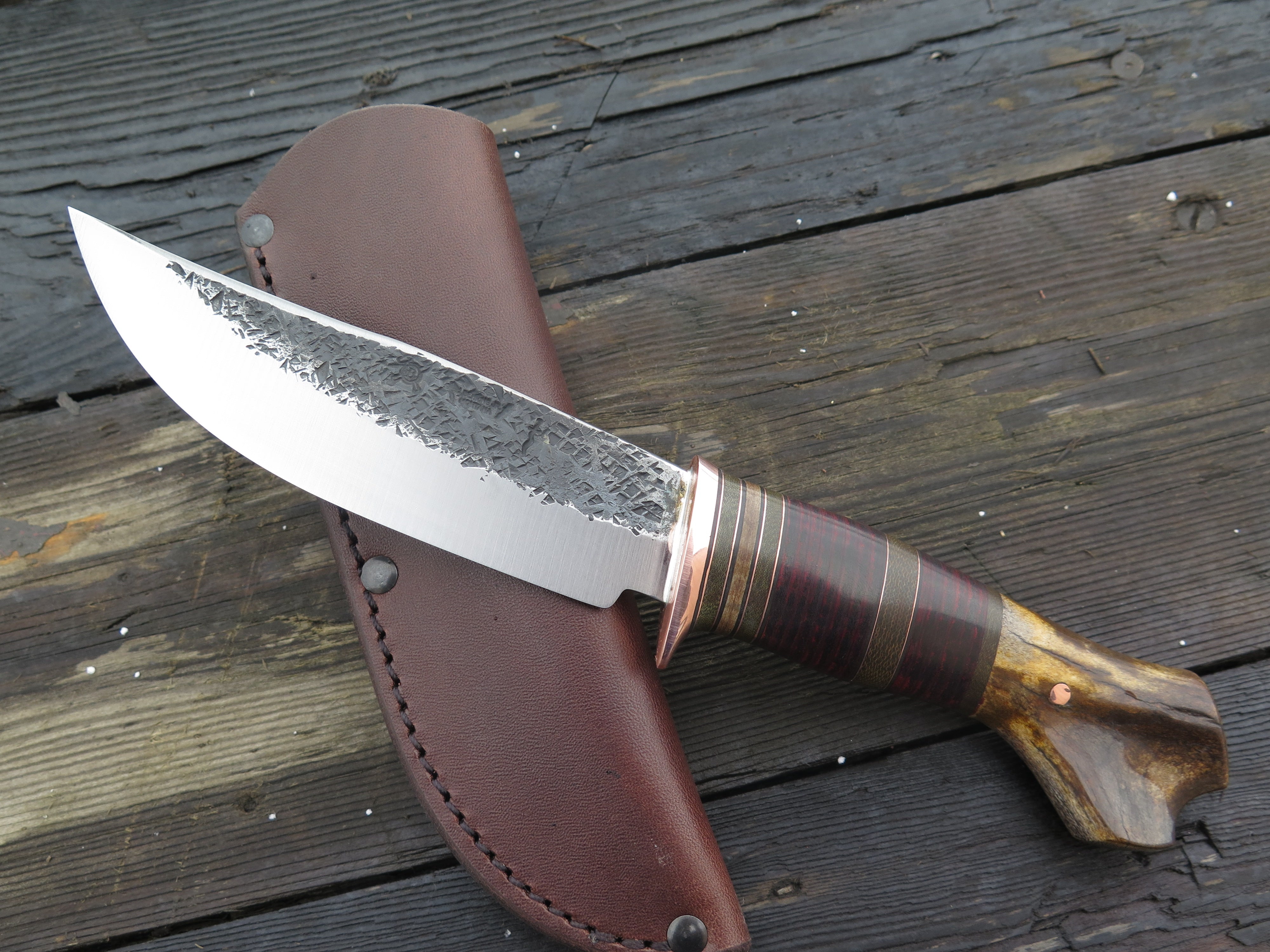 This bad ass new Hunter from Behring Made© is hand forged from 3/16" thick high carbon 01 tool steel and it measures 5 1/2" from tip to guard with a razor sharp hollow grind and our hammermark finish. The copper guard is soldered in place above black and gray fiber, green micarta, copper and horsehide leather as well as a premium whitetail stag crotch that's pinned through the tang with copper. The overall measures 10 1/4" and it also comes in a classic belt pouch sheath.