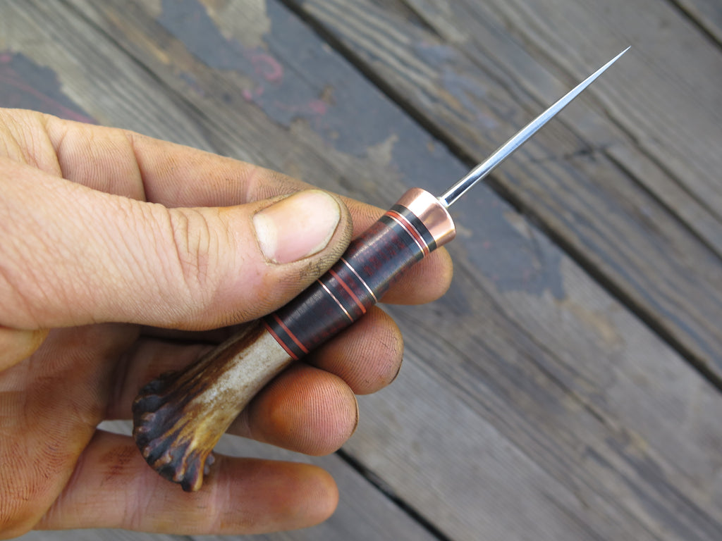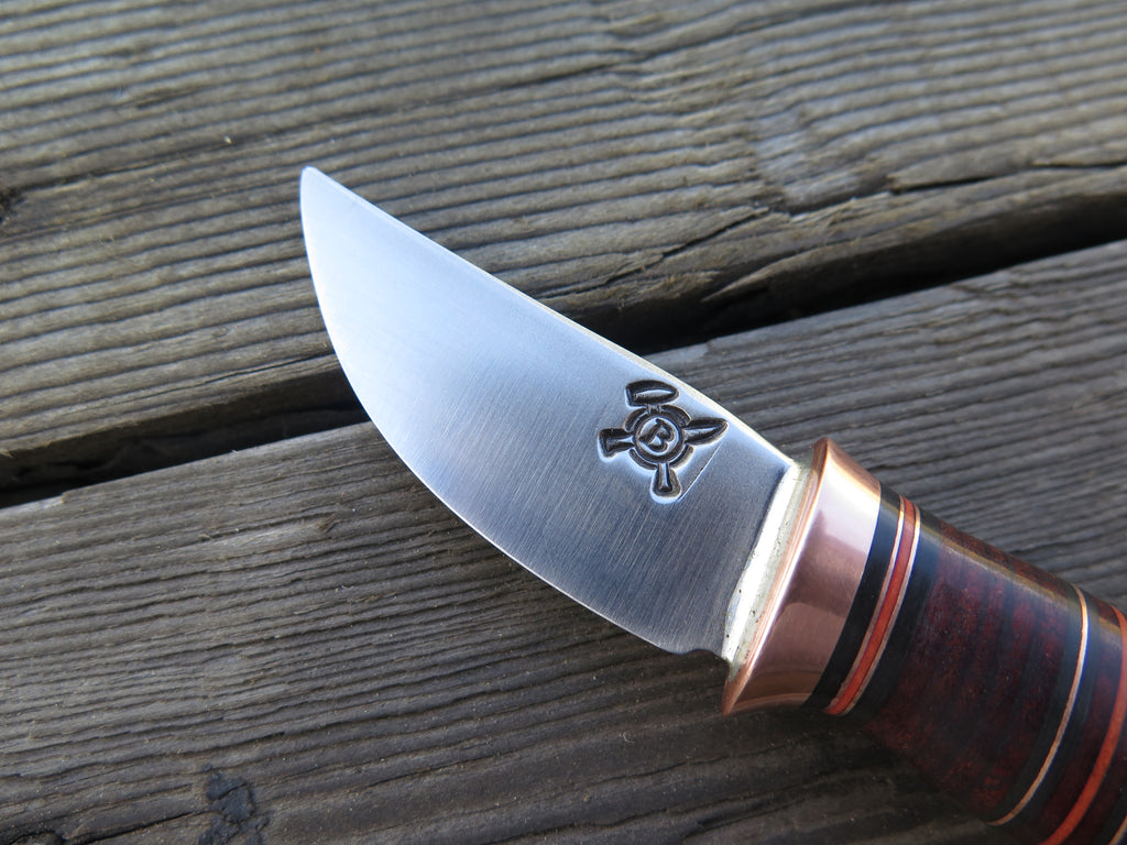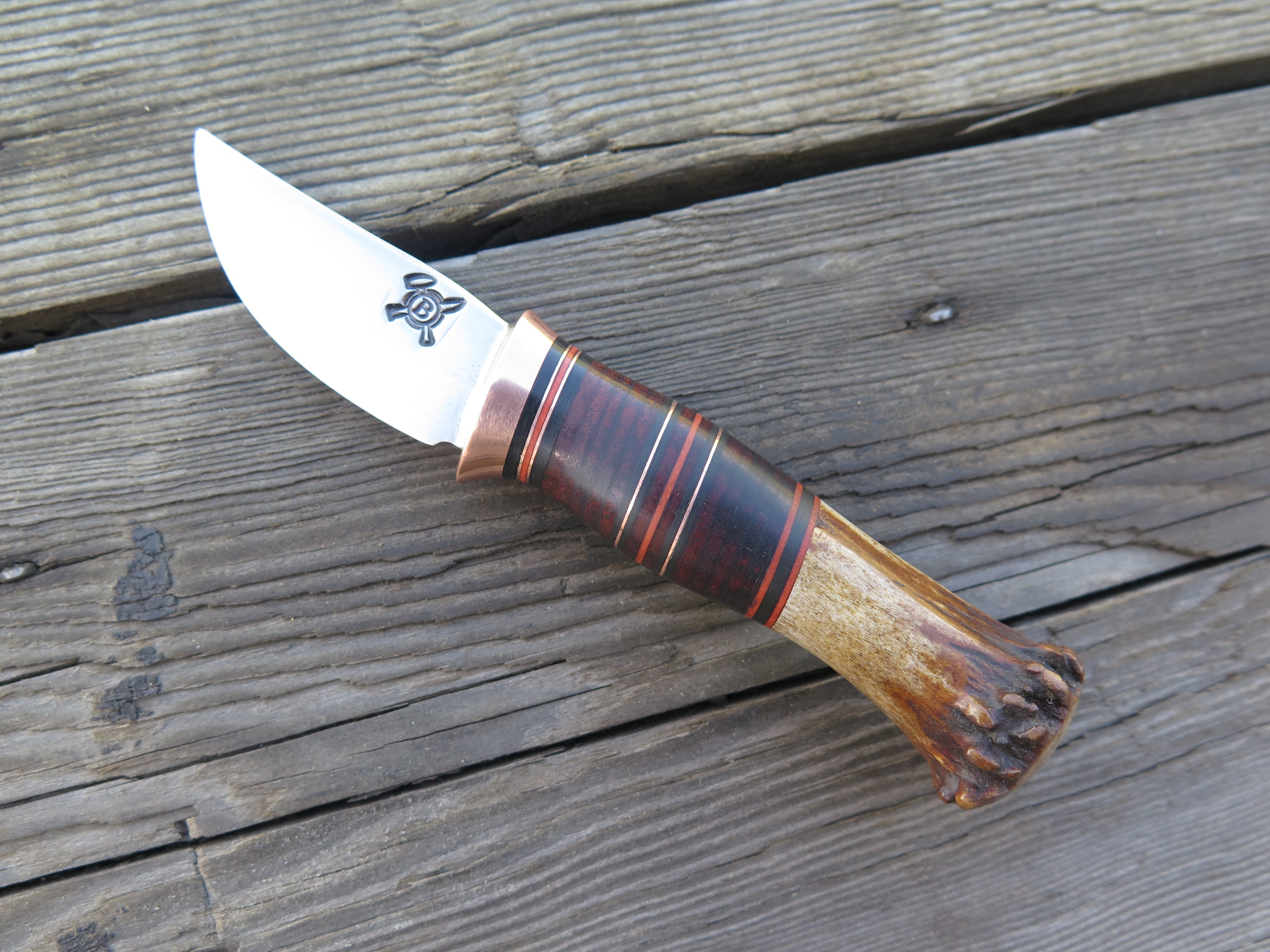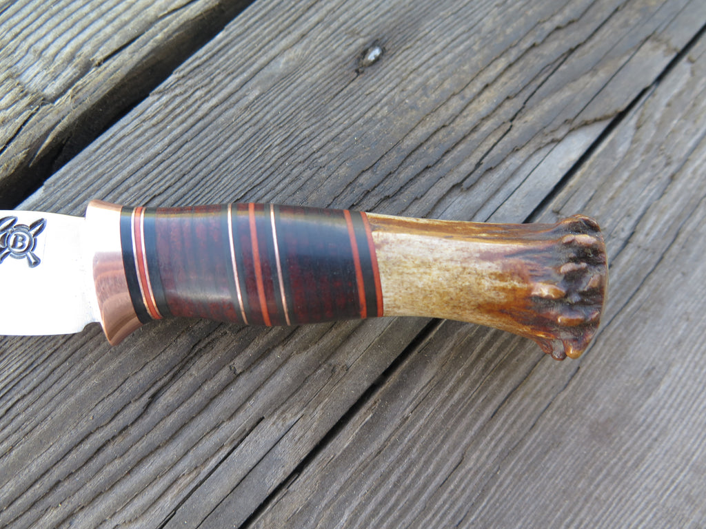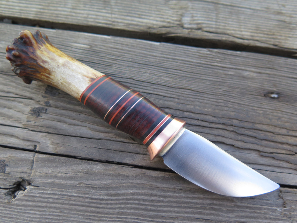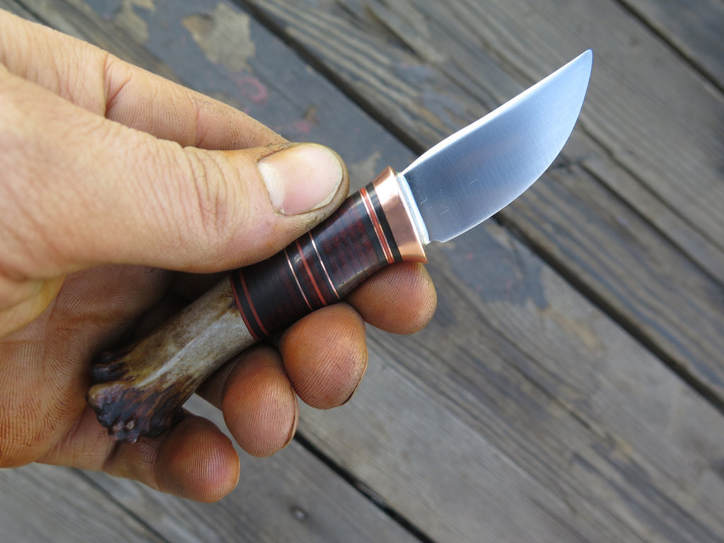 This awesome little Behring Made™ Pocket Knife is hand forged from 1/8" thick high carbon 01 tool steel and it measures 1 3/4" from tip to guard with a razor sharp convex grind. The copper guard is soldered in place above black and maroon fiber, copper and horsehide leather spacers as well as a sweet little whitetail crown stag butt. The overall length measures 4 5/8" and it comes in a custom sheath from Warlander Leather designed to ride in the 5th pocket of your britches.