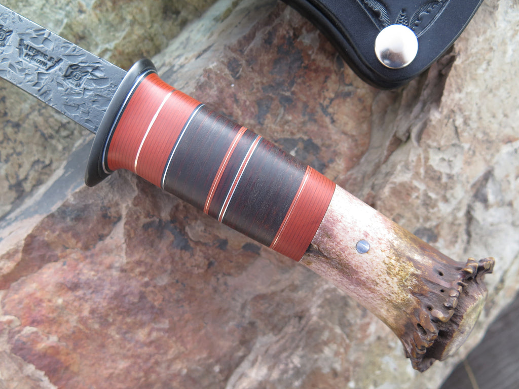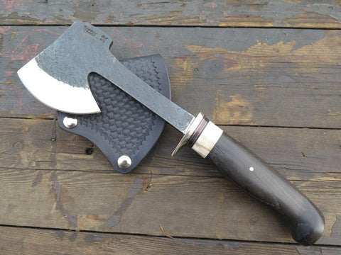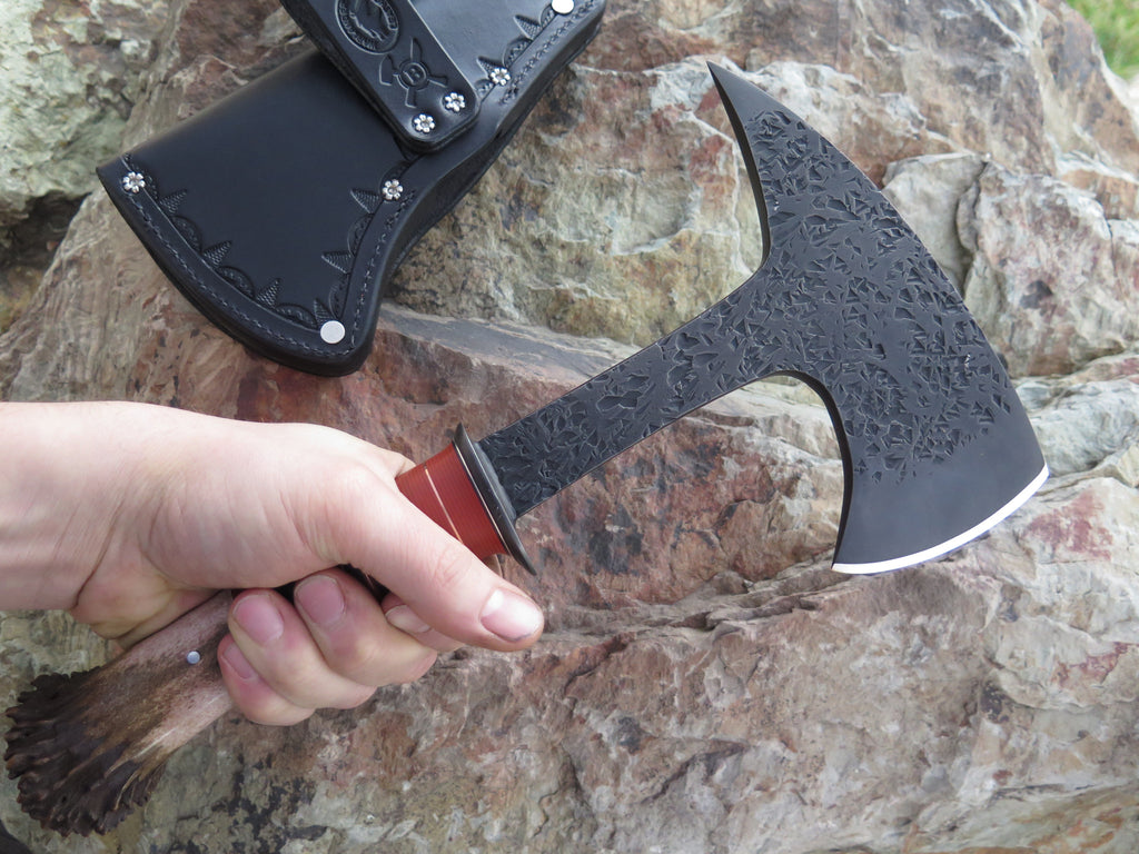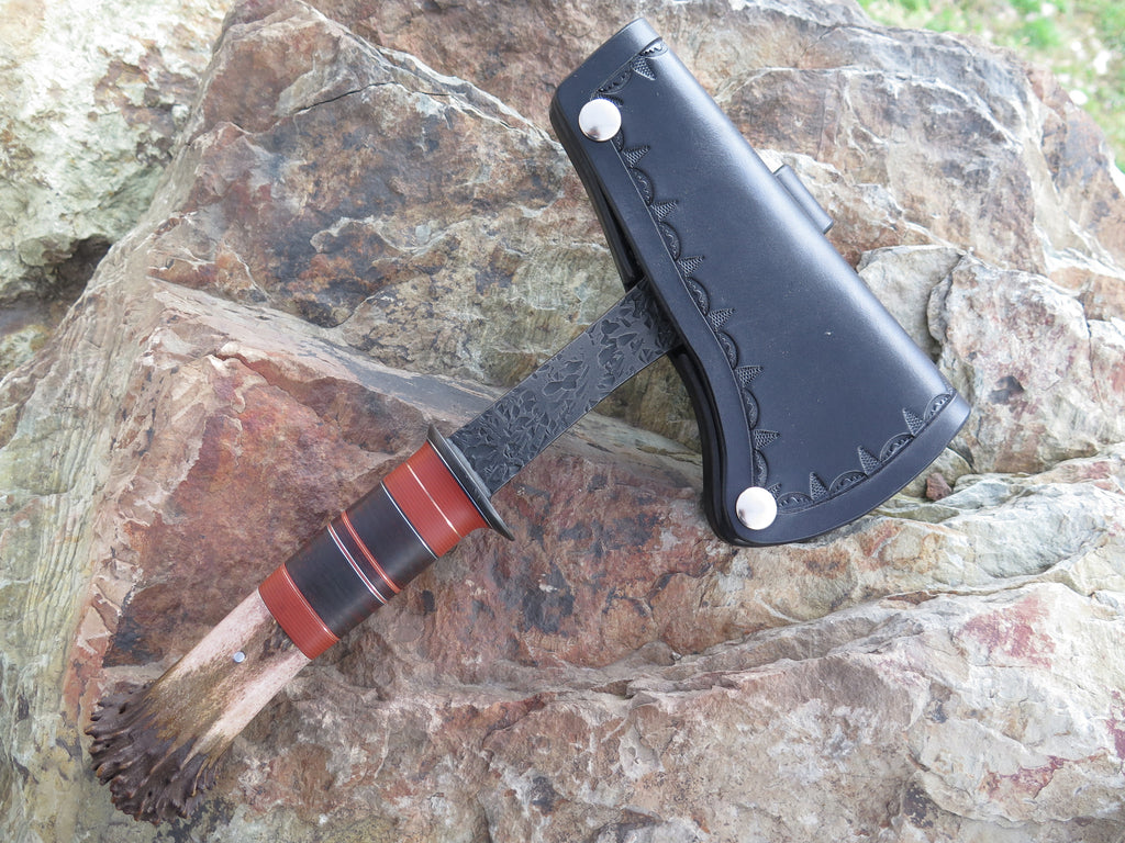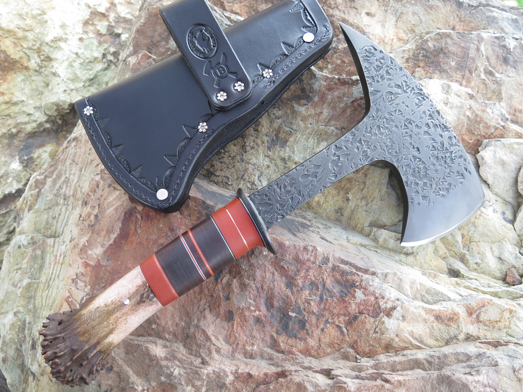 This bad ass new Spike Hawk from Behring Made is hand forged from 3/8" thick high carbon 01 tool steel and it measures a 3" razor sharp bit, 6 5/8" from bit to spike and 6" from top of the head to the guard. The blued steel guard is soldered in place above black fiber, maroon, horsehide, copper and aluminum spacers as well as a premium crown stag but that's pinned with aluminum. The overall length measures 12" and it comes in a custom sheath from Warlander Leather.