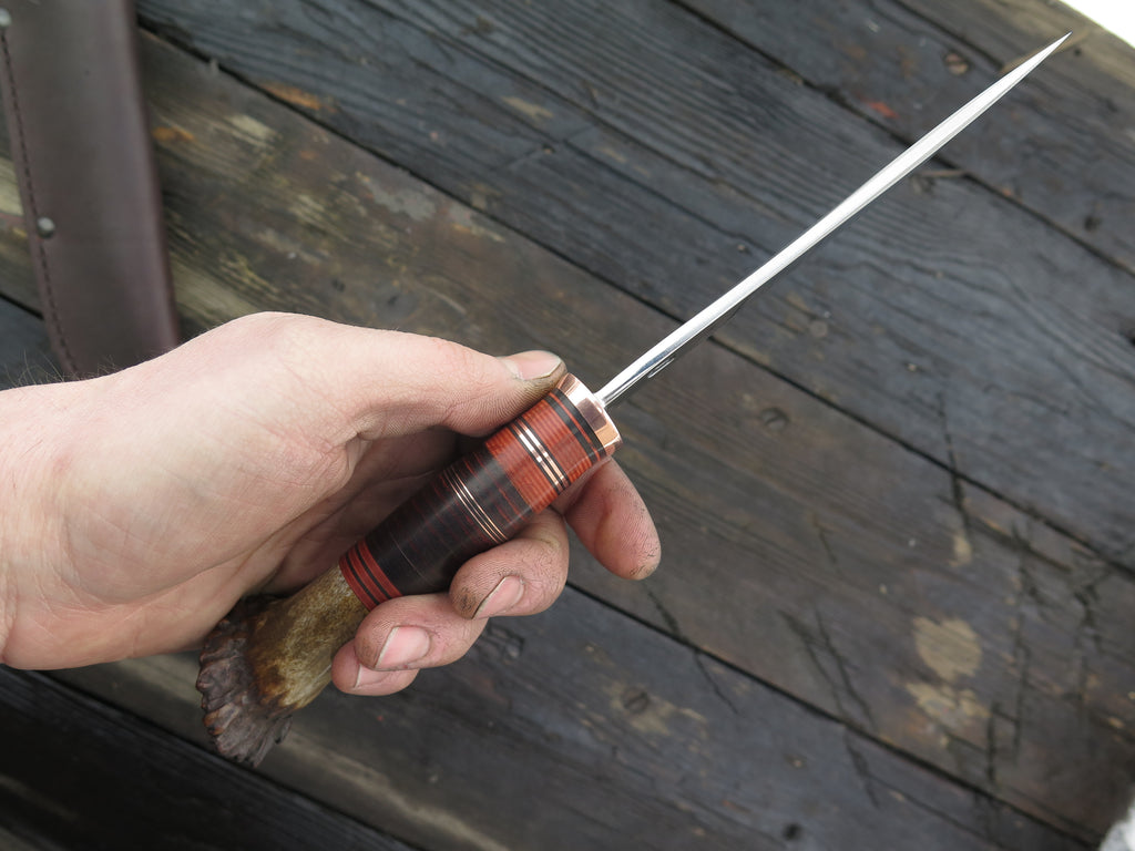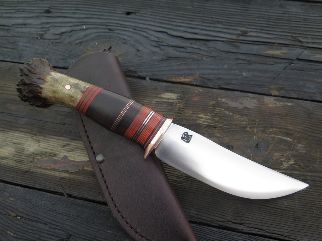 This Hunter from Behring Made© may be new, but it's truly an instant classic! The blade is hand forged from 3/16" thick high carbon 01 tool steel and it measures 5" from tip to guard with a razor sharp convex grind. The copper guard is soldered in place above black and maroon fiber with copper and horsehide spacers to boot the premium crown stag butt that's also pinned with copper. The overall length measures 9 3/4" and it comes in a leather belt pouch sheath.