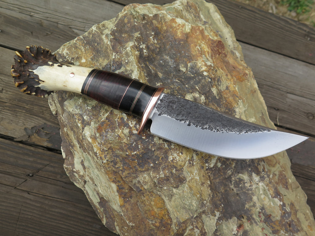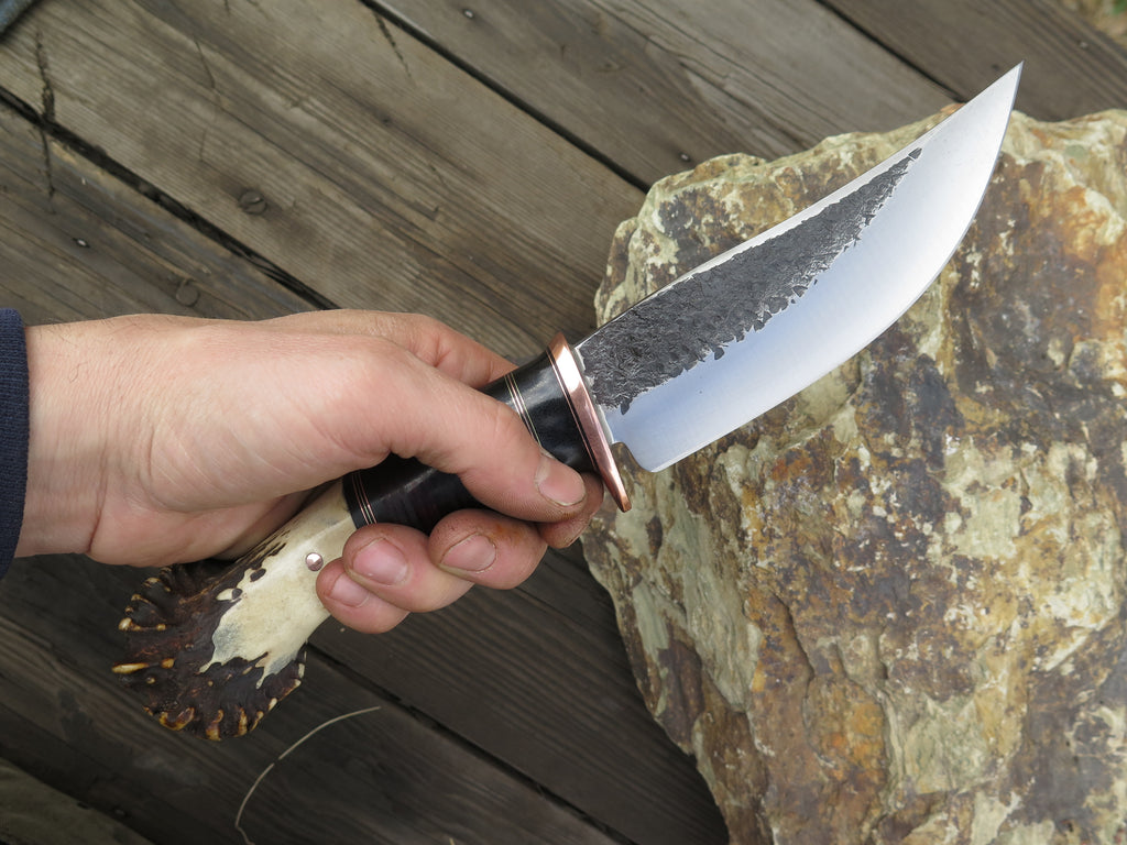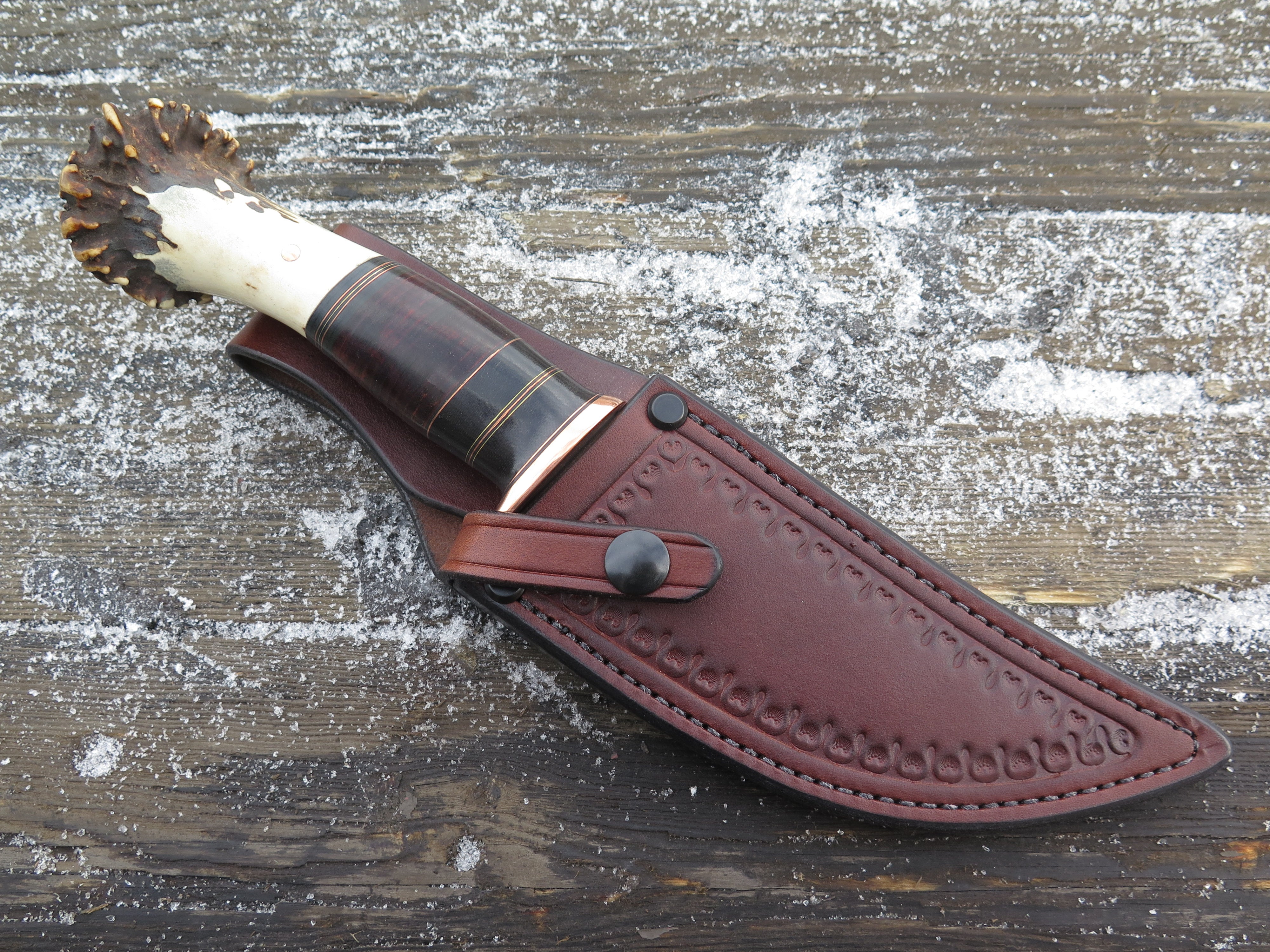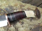 This new XL Hunter from Behring Made™ is an absolute tank. We hand forged the shock absorbing spring steel blade and it measures 6" from tip to guard with a razor sharp hollow grind and our hammermark finish. The copper guard is soldered in place above black fiber, micarta, copper, brass and horsehide leather spacers as well as the big crown stag butt that's pinned with copper. The overall length measures 11 1/4" and it comes in a custom sheath from Warlander Leather.