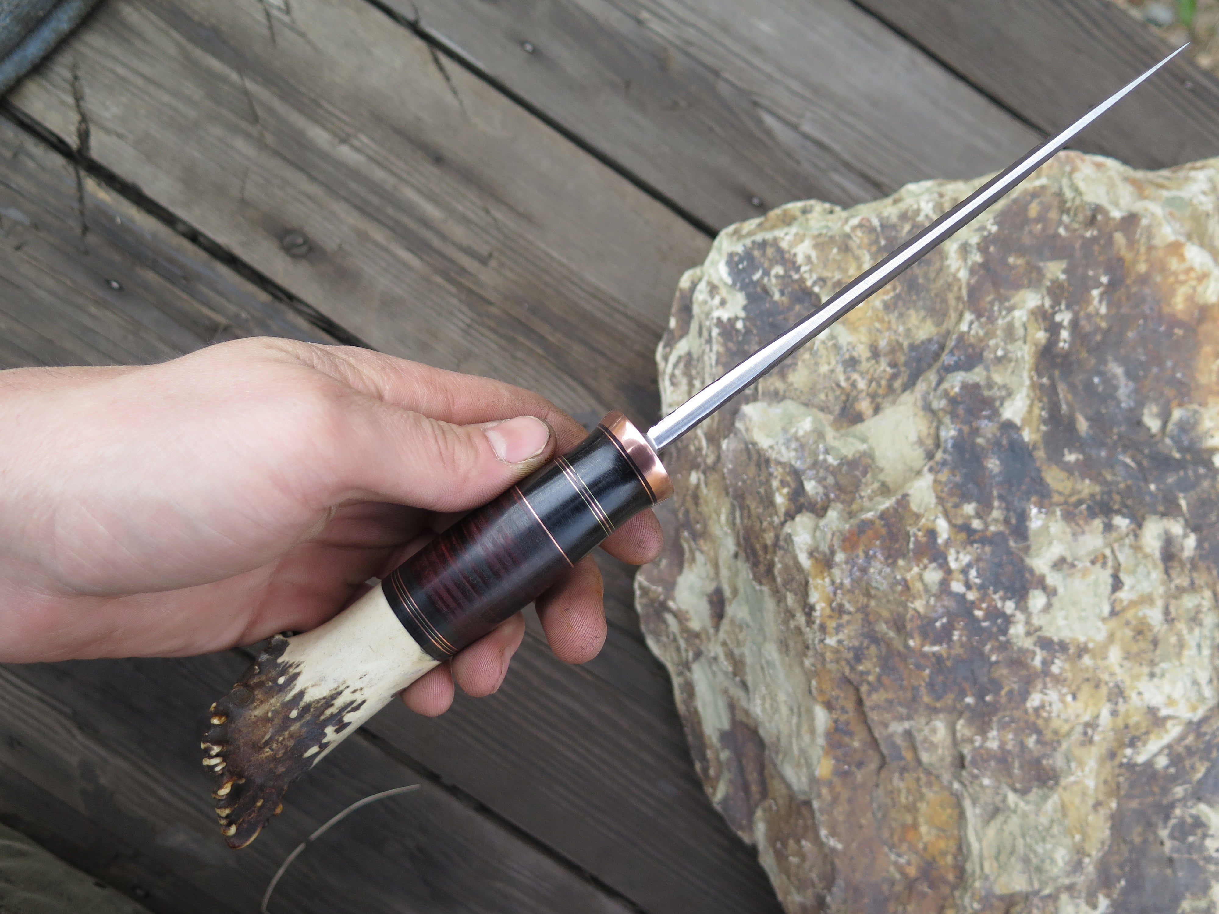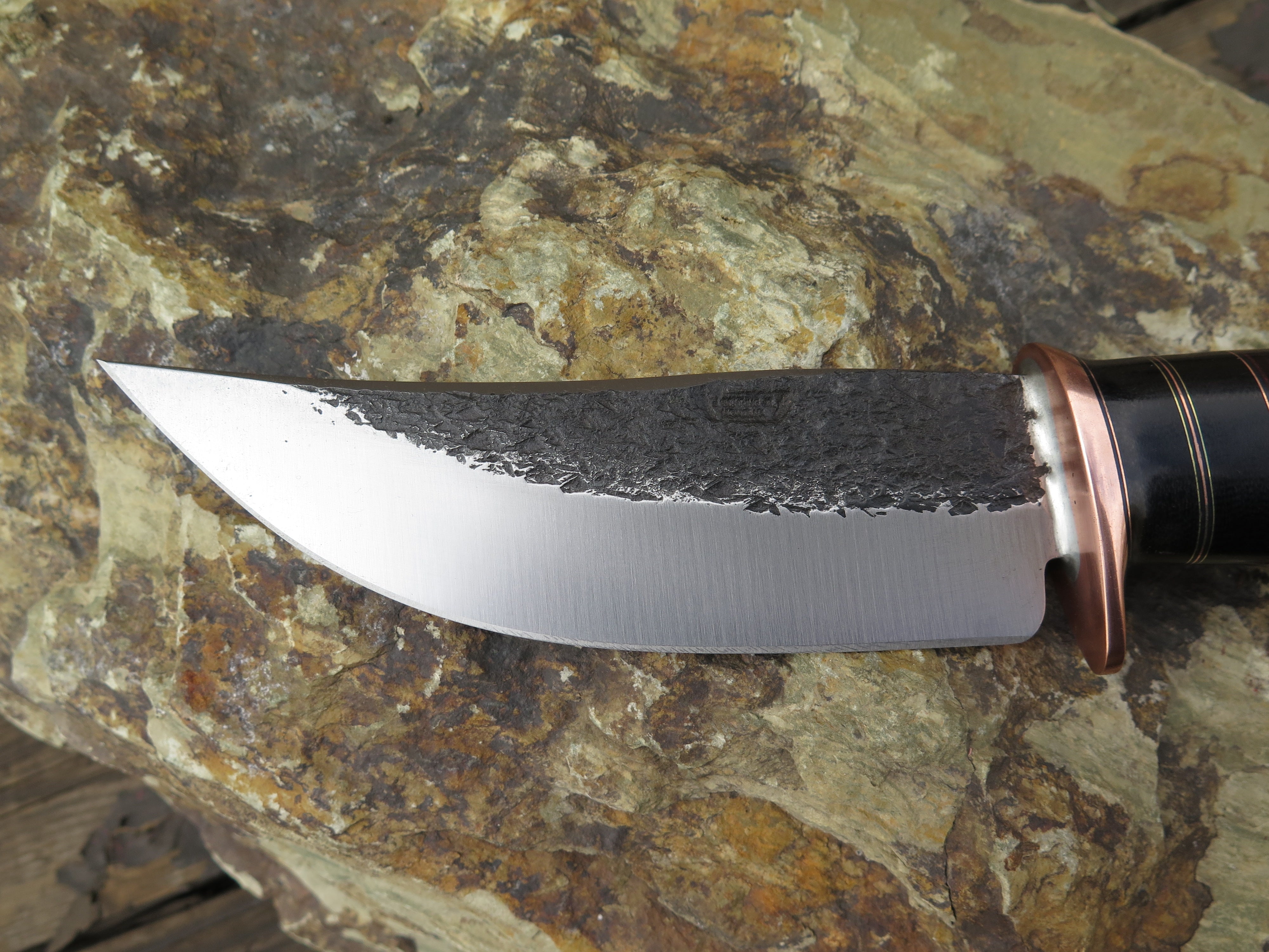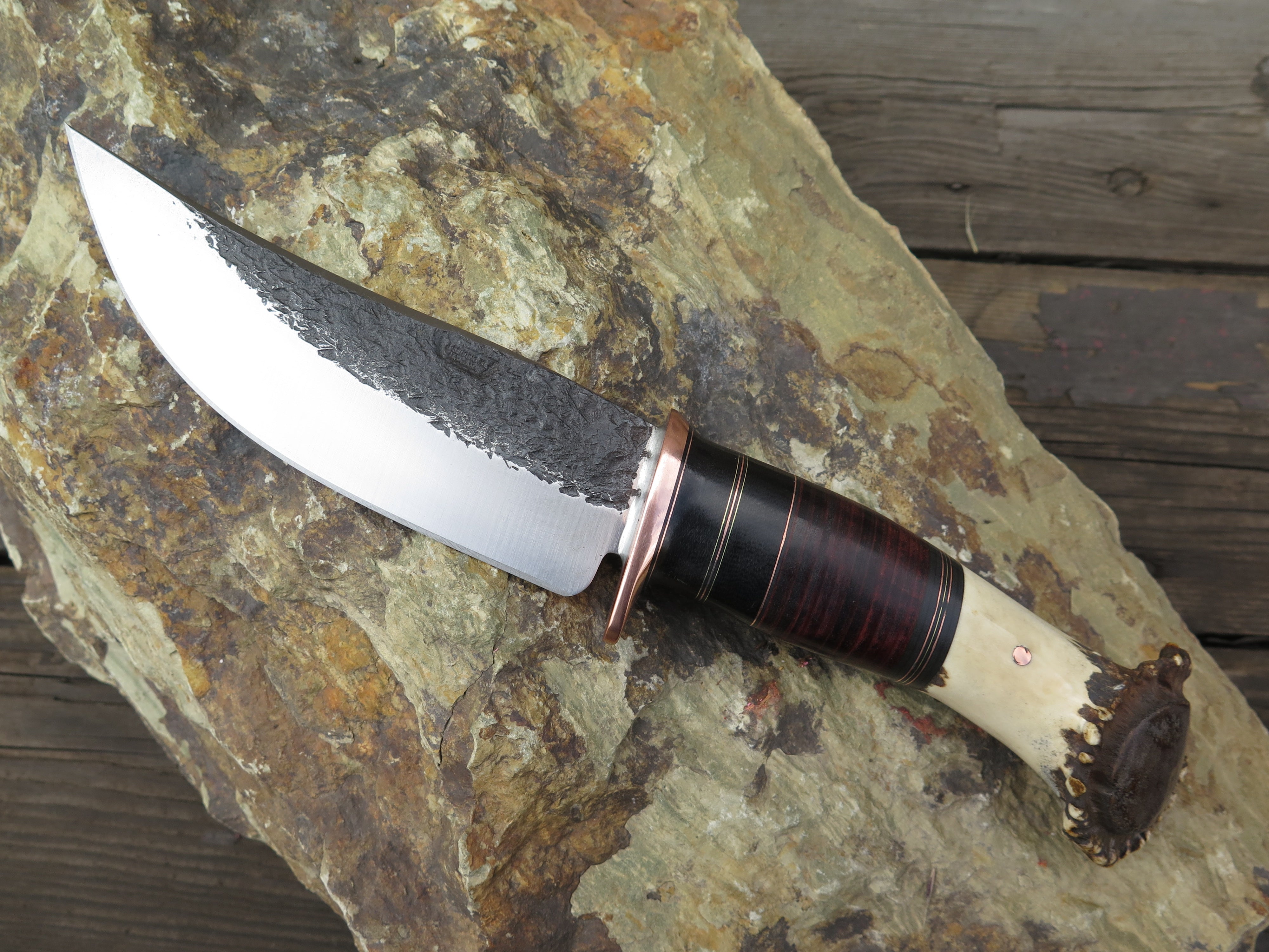 This new XL Hunter from Behring Made™ is an absolute tank. We hand forged the shock absorbing spring steel blade and it measures 6" from tip to guard with a razor sharp hollow grind and our hammermark finish. The copper guard is soldered in place above black fiber, micarta, copper, brass and horsehide leather spacers as well as the big crown stag butt that's pinned with copper. The overall length measures 11 1/4" and it comes in a custom sheath from Warlander Leather.