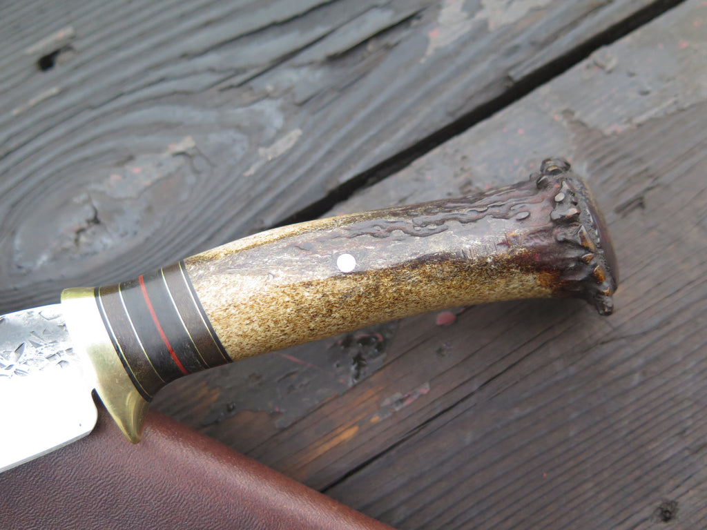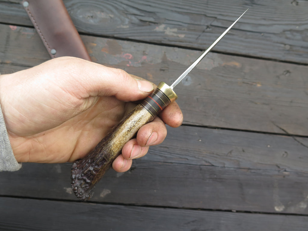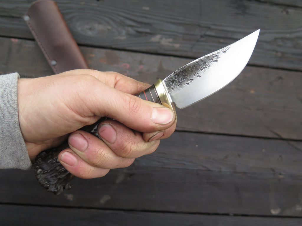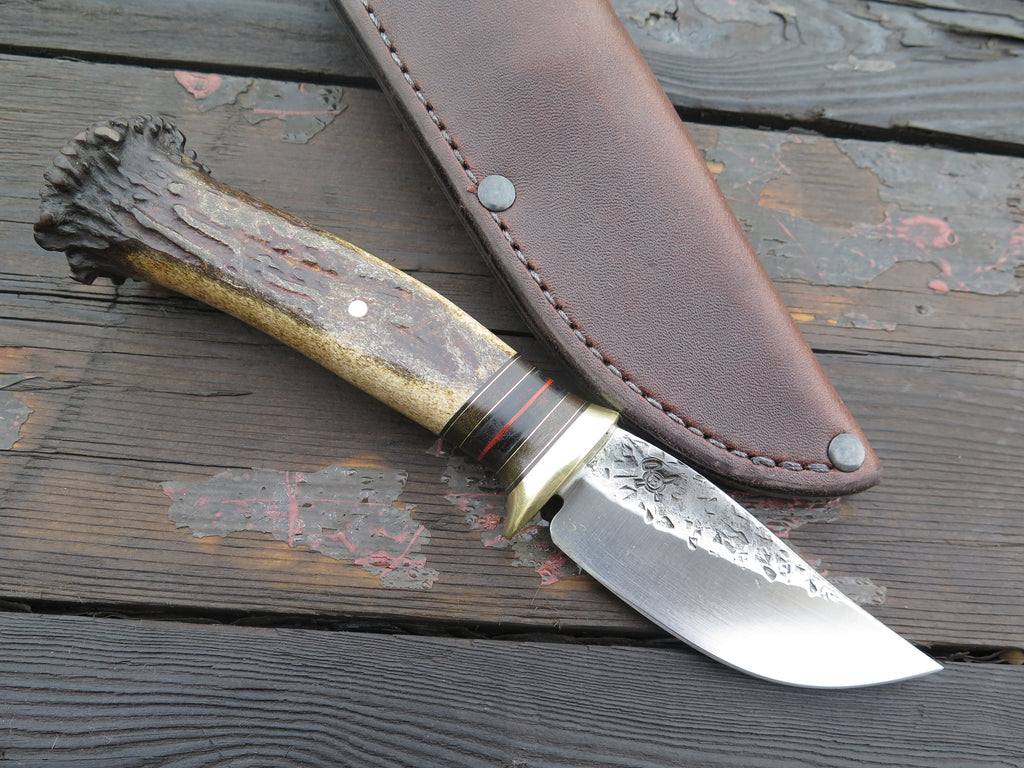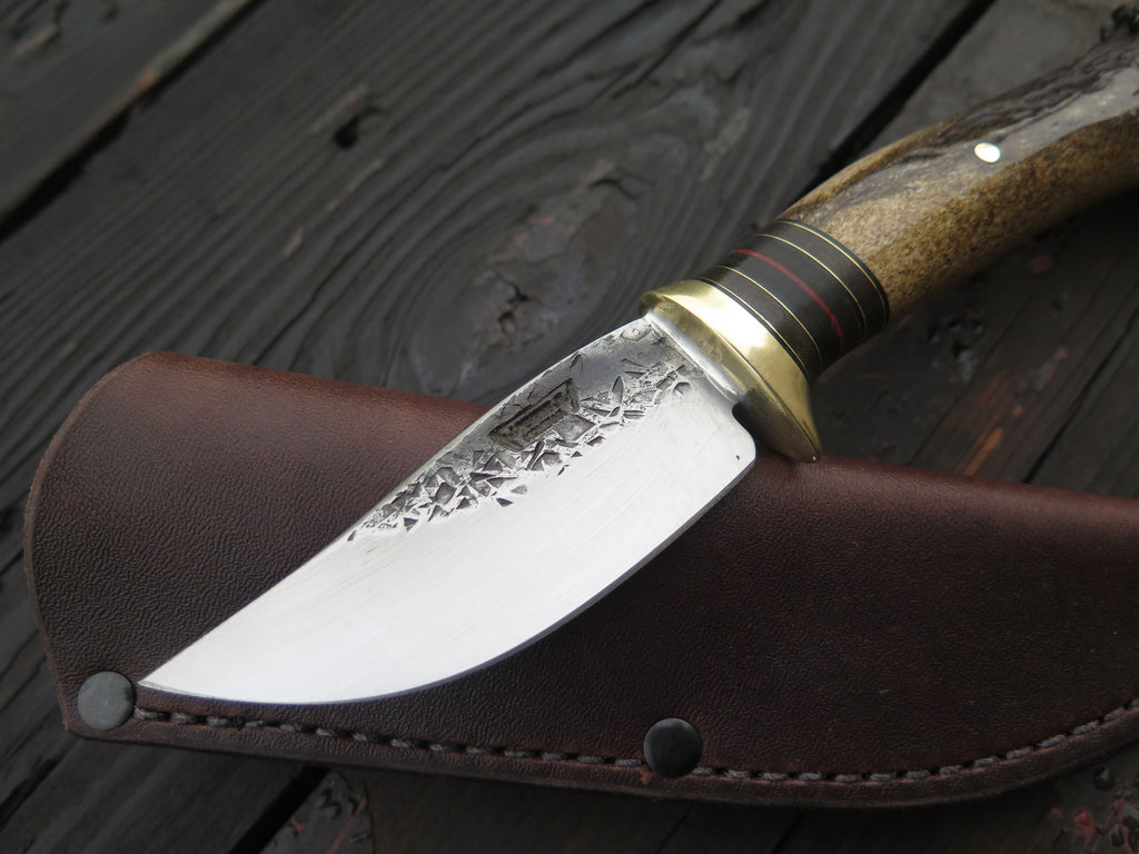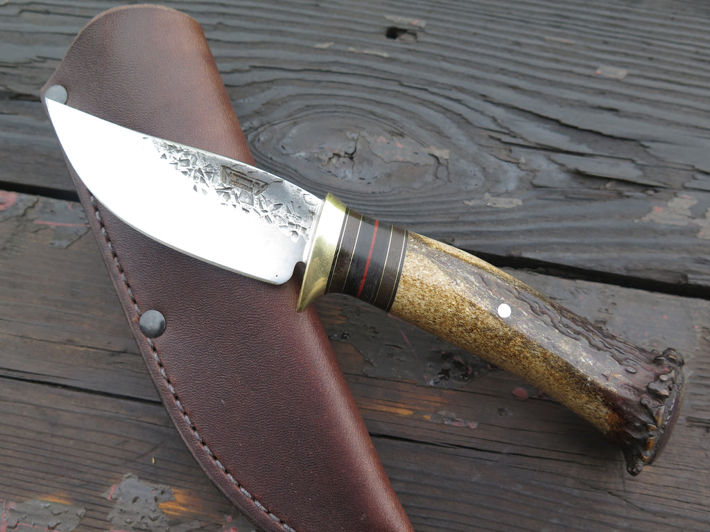 This beautiful new Sharptail from your boys at Behring Made™ is a truly perfect field companion for all things big game to small fish and then some. The blade is hand forged from 1/8" thick high carbon 01 tool steel and it measures 3 1/4" from tip to guard with a razor sharp hollow grind and our hammermark finish. THe brass guard is soldered in place above black and maroon fiber, green micarta and brass spacers as well as a premium crown stag handle that is pinned with brass. The overall length measures 7 3/4" and it comes in a Warlander Leather pouch sheath.
