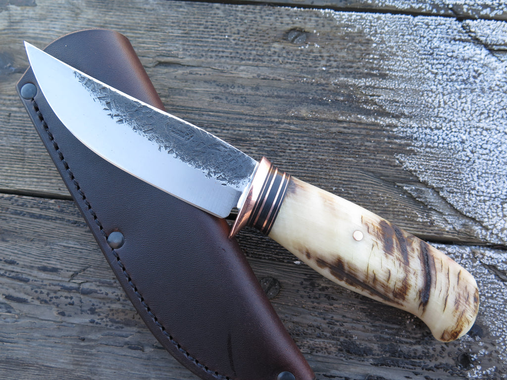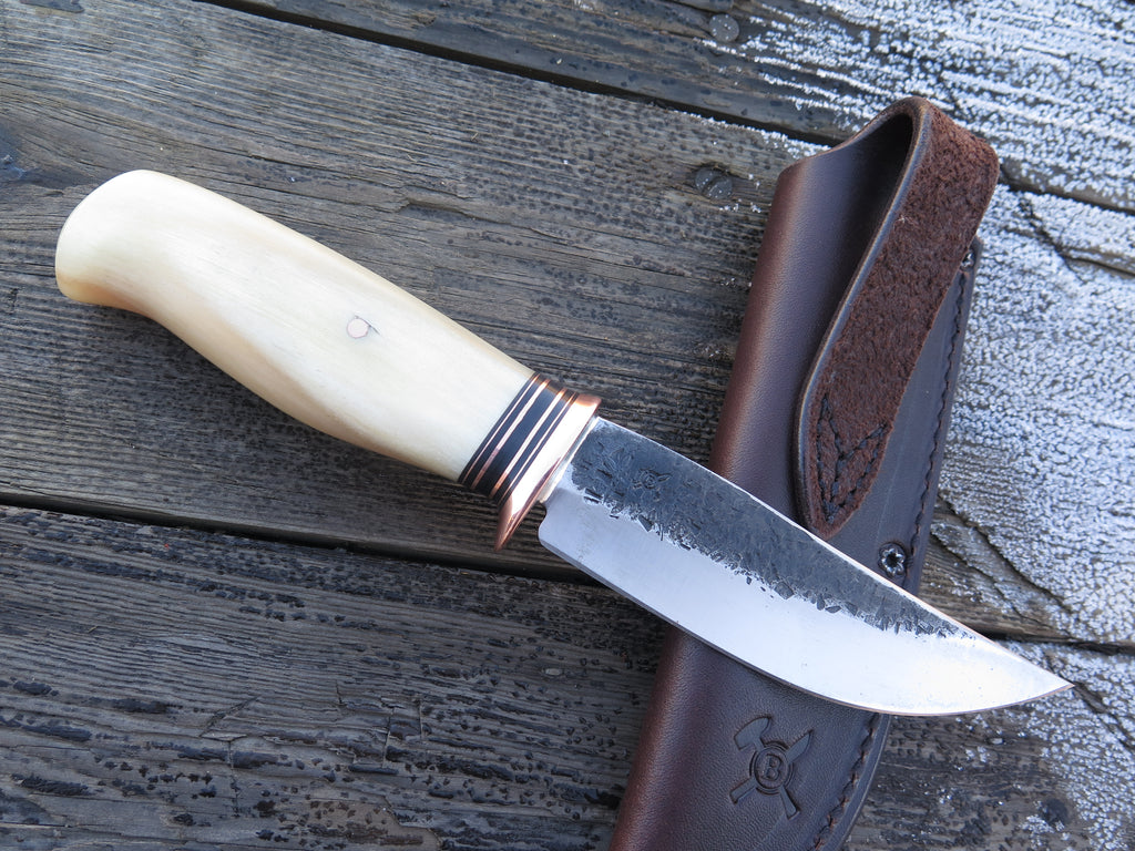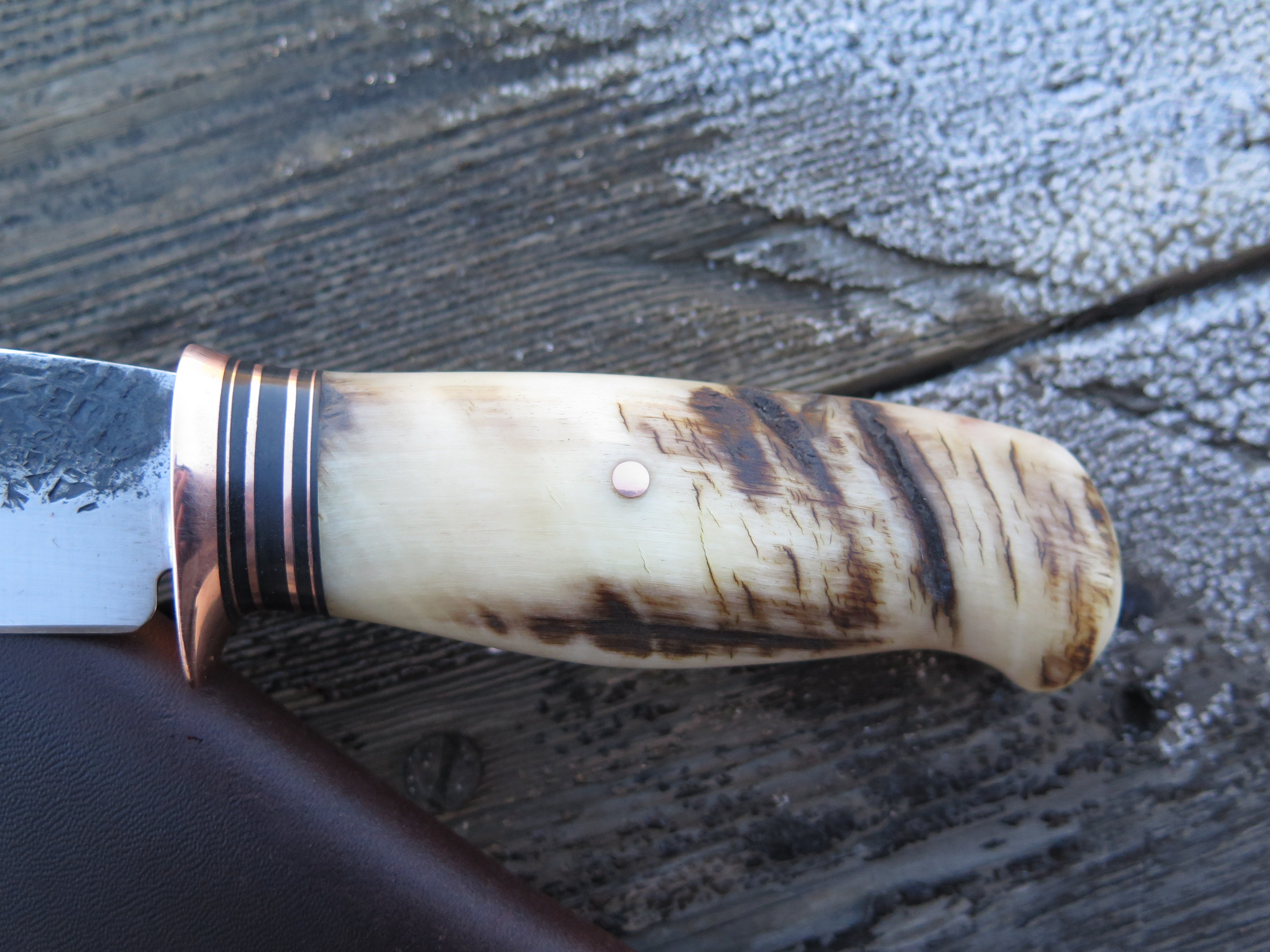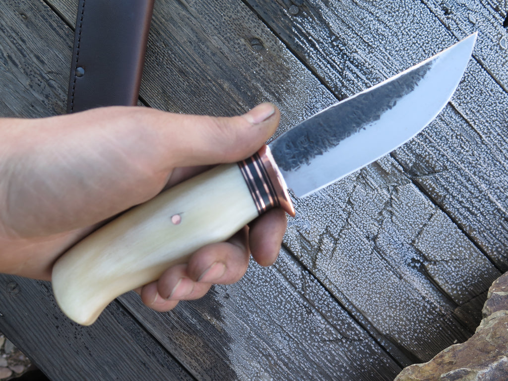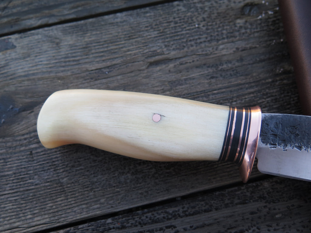 This beautiful new Hunter from Behring Made© is hand forged from 1/8" thick high carbon 01 tool steel and it measures 4 3/4" from tip to guard with a razor sharp hollow grind and our hammermark finish. The copper guard is soldered in place above black fiber and copper spacers with an incredible Dall sheep horn handle that's pinned through the tang with copper. The overall length measures 9 1/4" and it comes in a classic leather belt pouch sheath from Warlander. *Material figure will vary