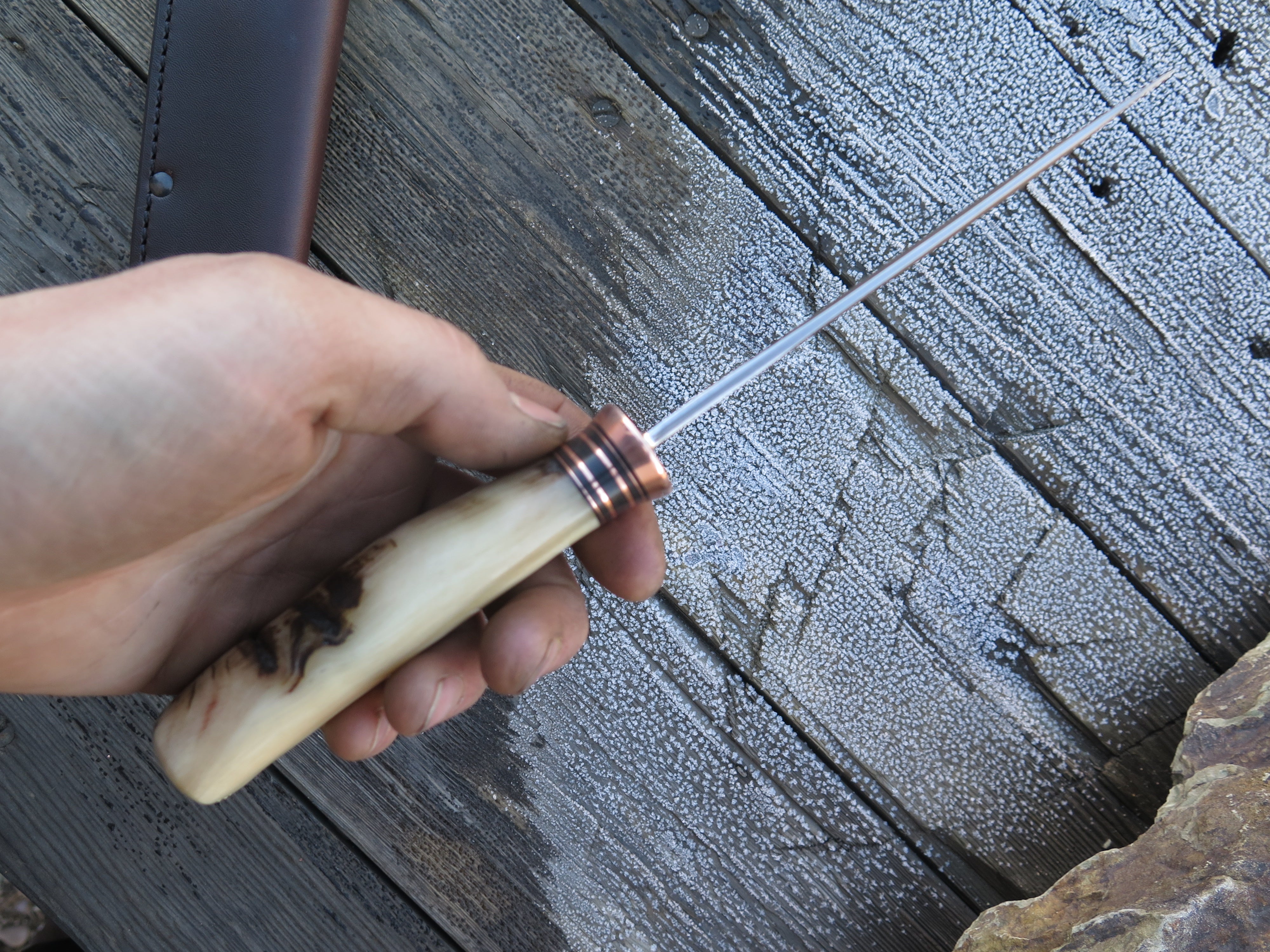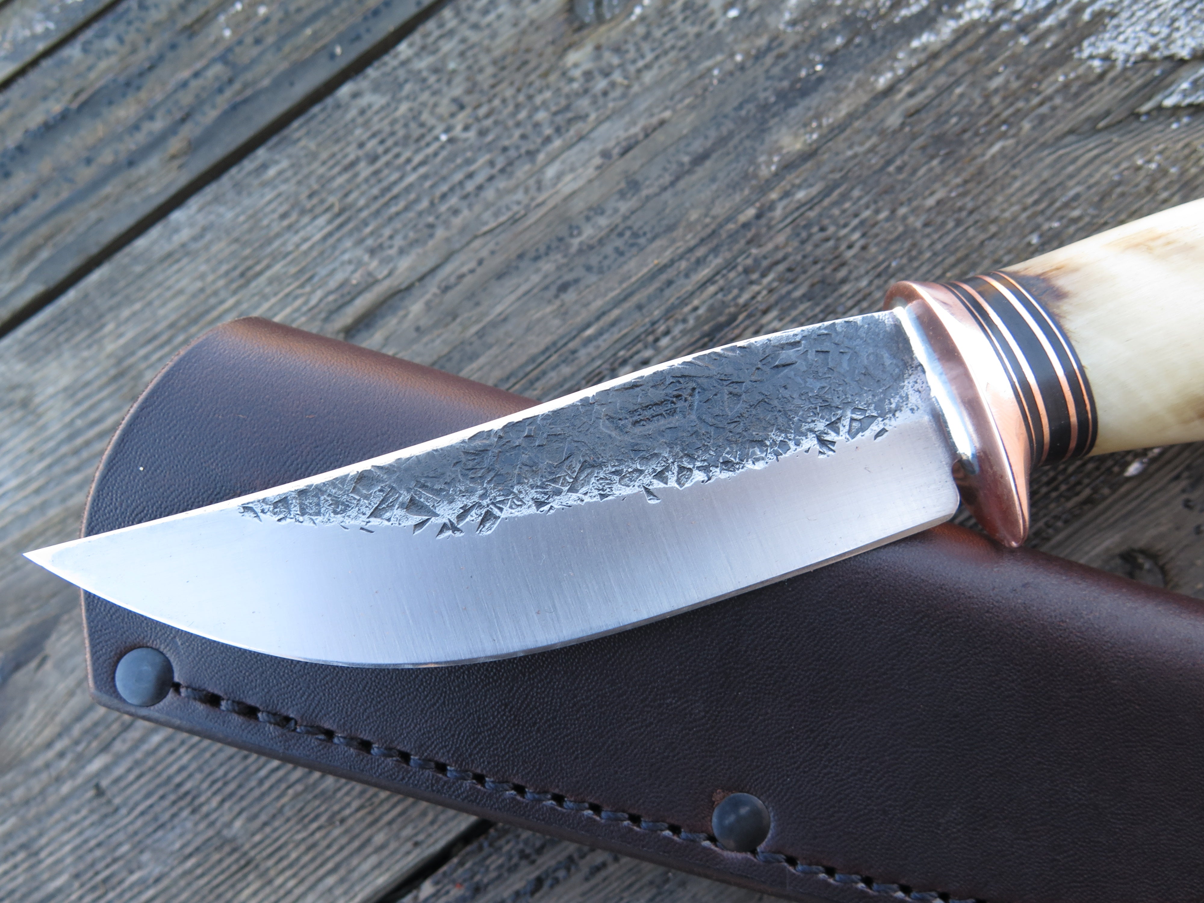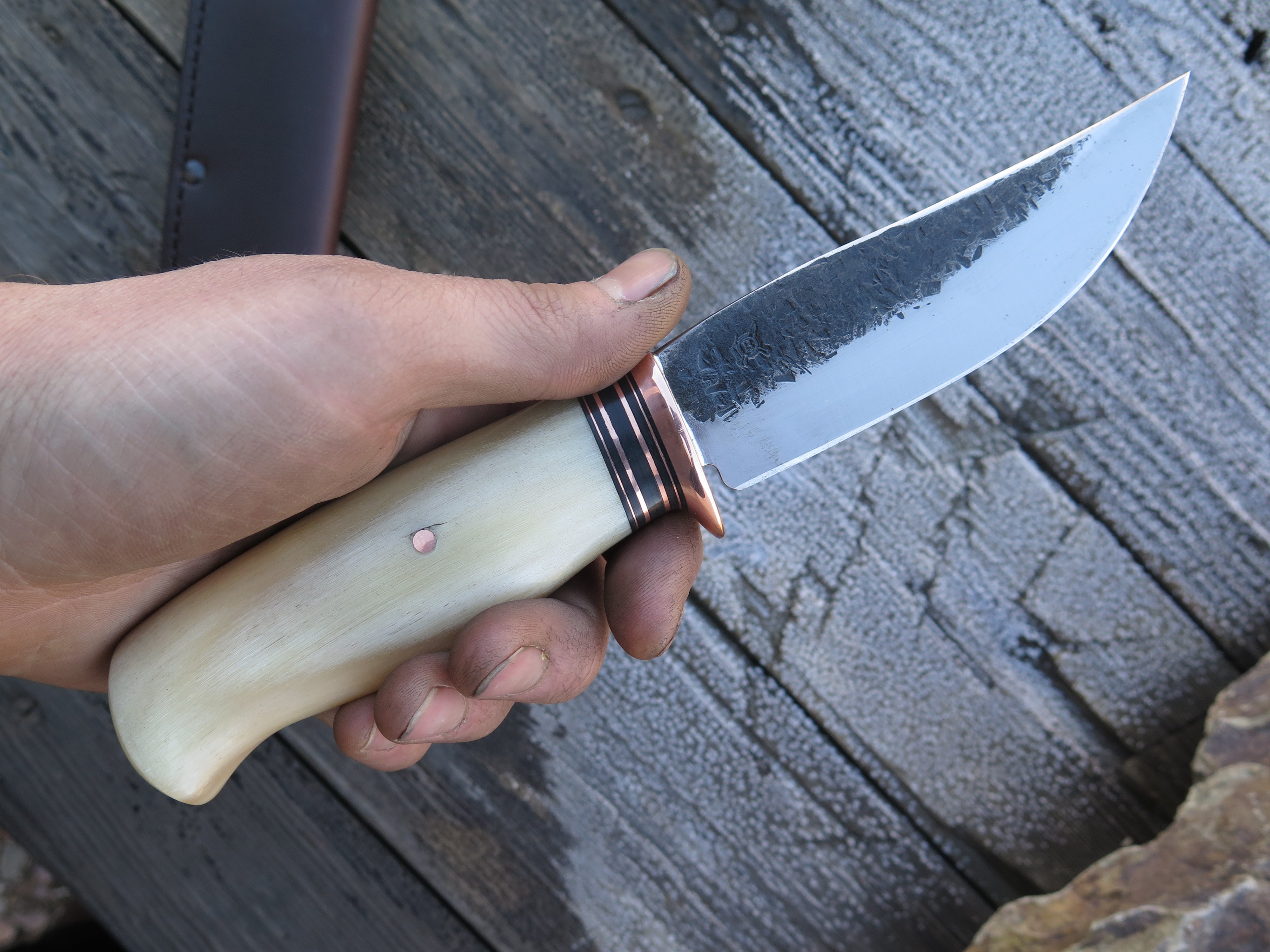 This beautiful new Hunter from Behring Made© is hand forged from 1/8" thick high carbon 01 tool steel and it measures 4 3/4" from tip to guard with a razor sharp hollow grind and our hammermark finish. The copper guard is soldered in place above black fiber and copper spacers with an incredible Dall sheep horn handle that's pinned through the tang with copper. The overall length measures 9 1/4" and it comes in a classic leather belt pouch sheath from Warlander. *Material figure will vary