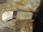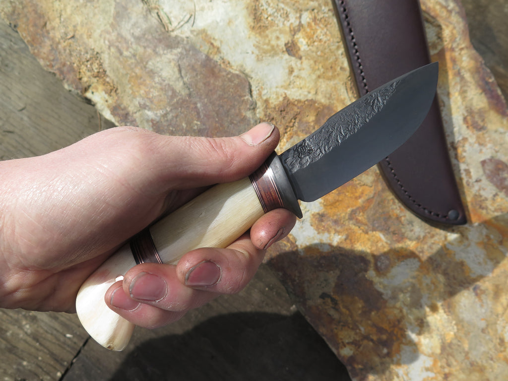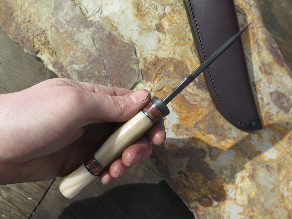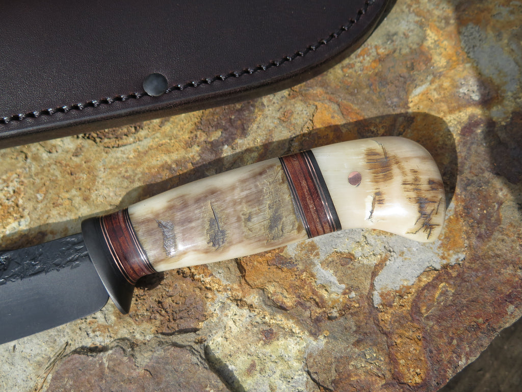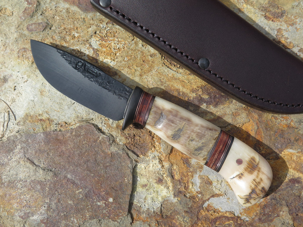 This fancy new Canoe knife from Behring Made© is hand forged from 1/8" thick high carbon 01 tool steel and it measures 3 1/2" from tip to guard with a razor sharp hollow grind, hammermarks and our forced patina blued finish. The blued steel guard is soldered in place above black fiber, copper, horsehide and a two-piece construction premium Dall's sheep horn, with a copper pin through the butt. The overall length measures 7 7/8" and it comes in a classic leather belt pouch sheath.