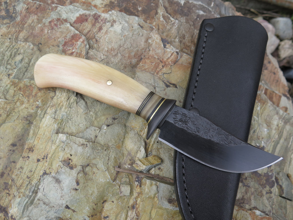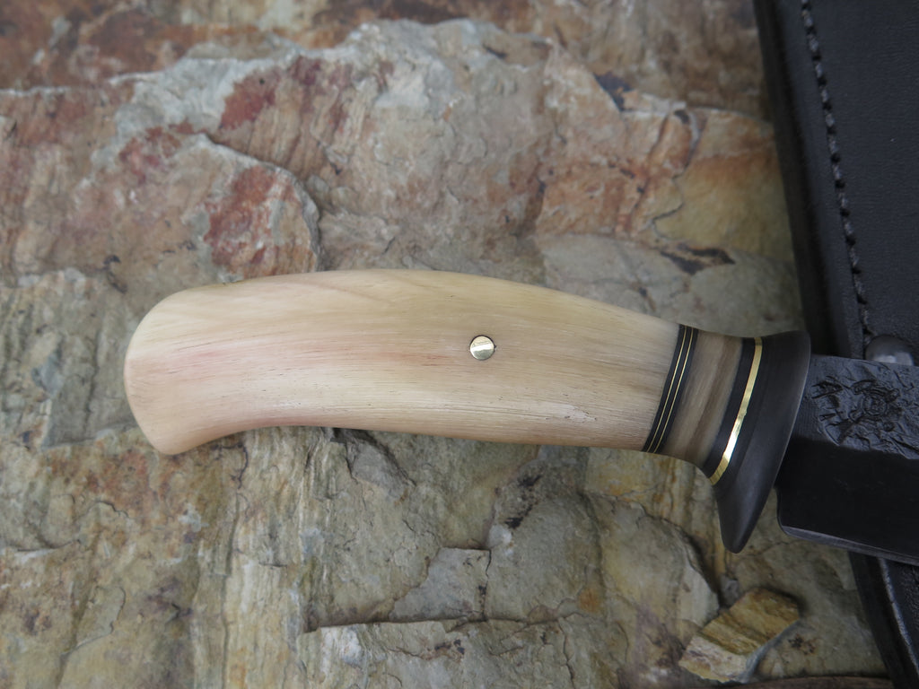 This bad ass new Sharptail from team Behring Made© is hand forged from 3/16" thick high carbon 01 tool steel and it measures 3 1/2" from tip to guard with a razor sharp hollow grind, hammermarks and our forced patina blued finish. The blued steel guard is soldered in place above black fiber, brass and Dall's sheep horn spacers as well as a remarkable Dall's sheep horn handle that we've pinned through the tang with copper as well. Overall length measures just shy of 7 1/2" and it comes in a classic Warlander Leather pouch sheath.