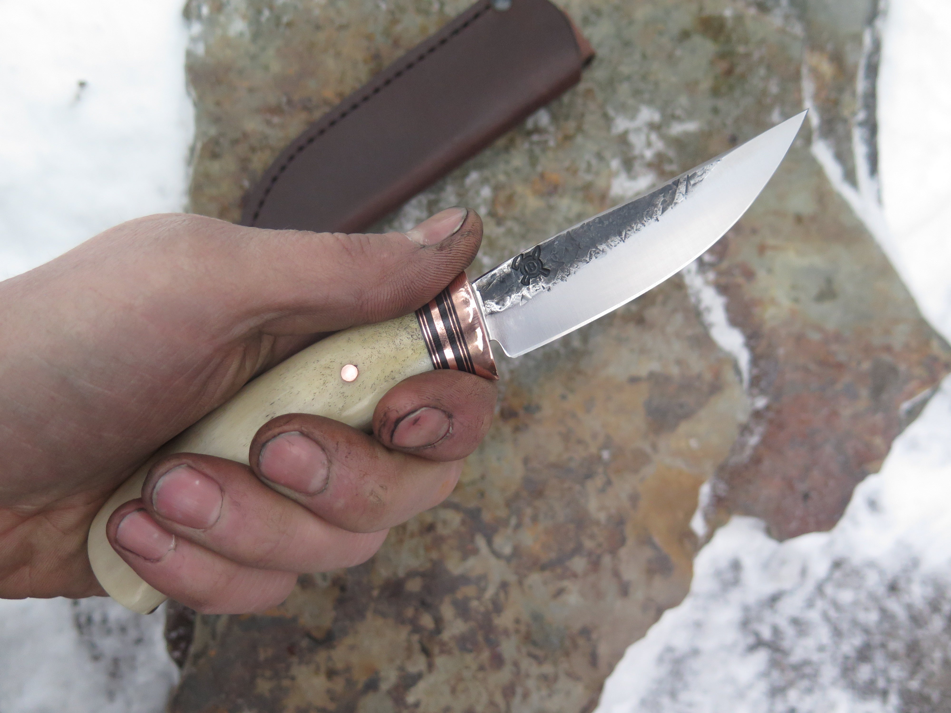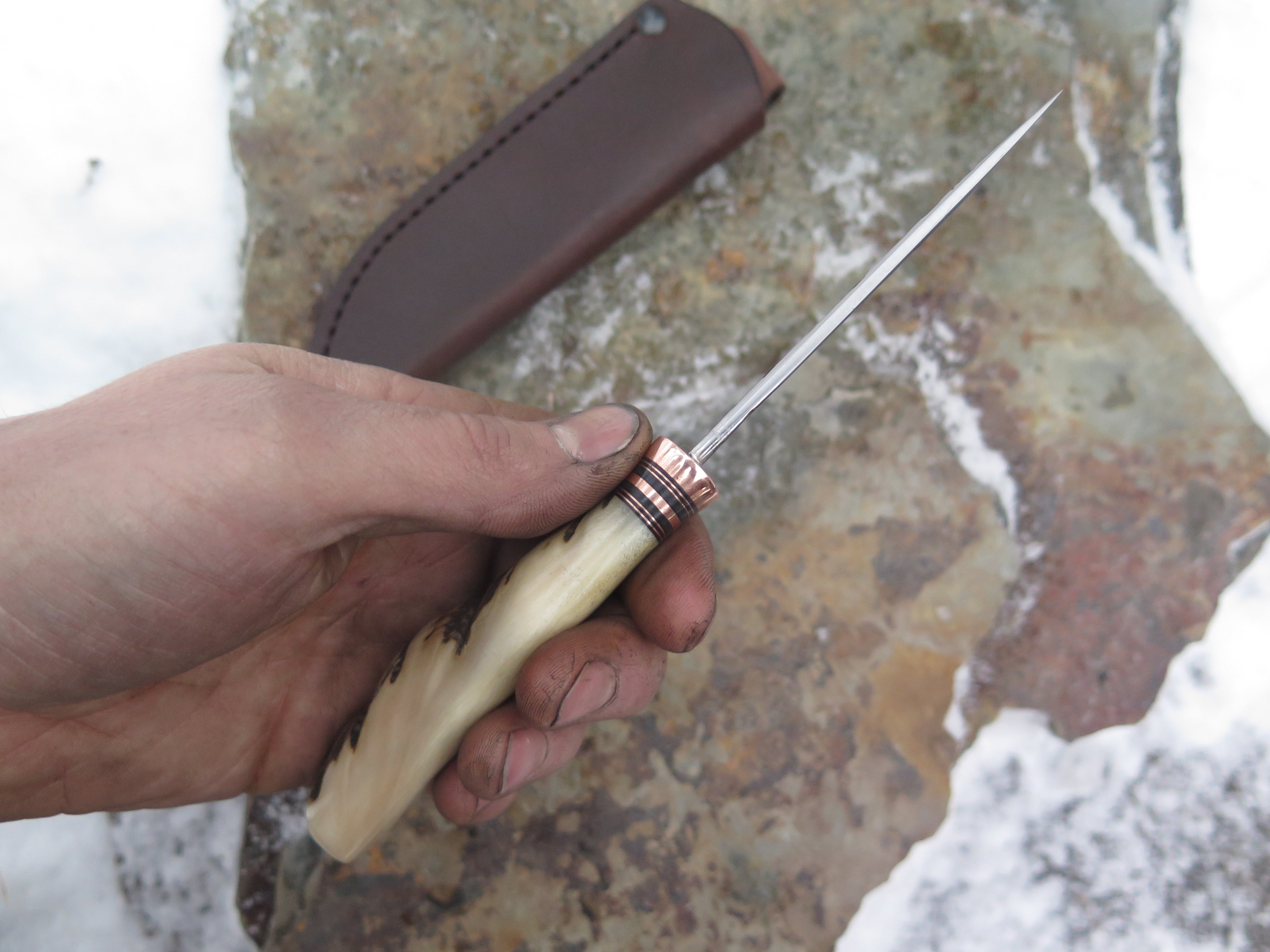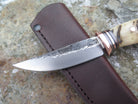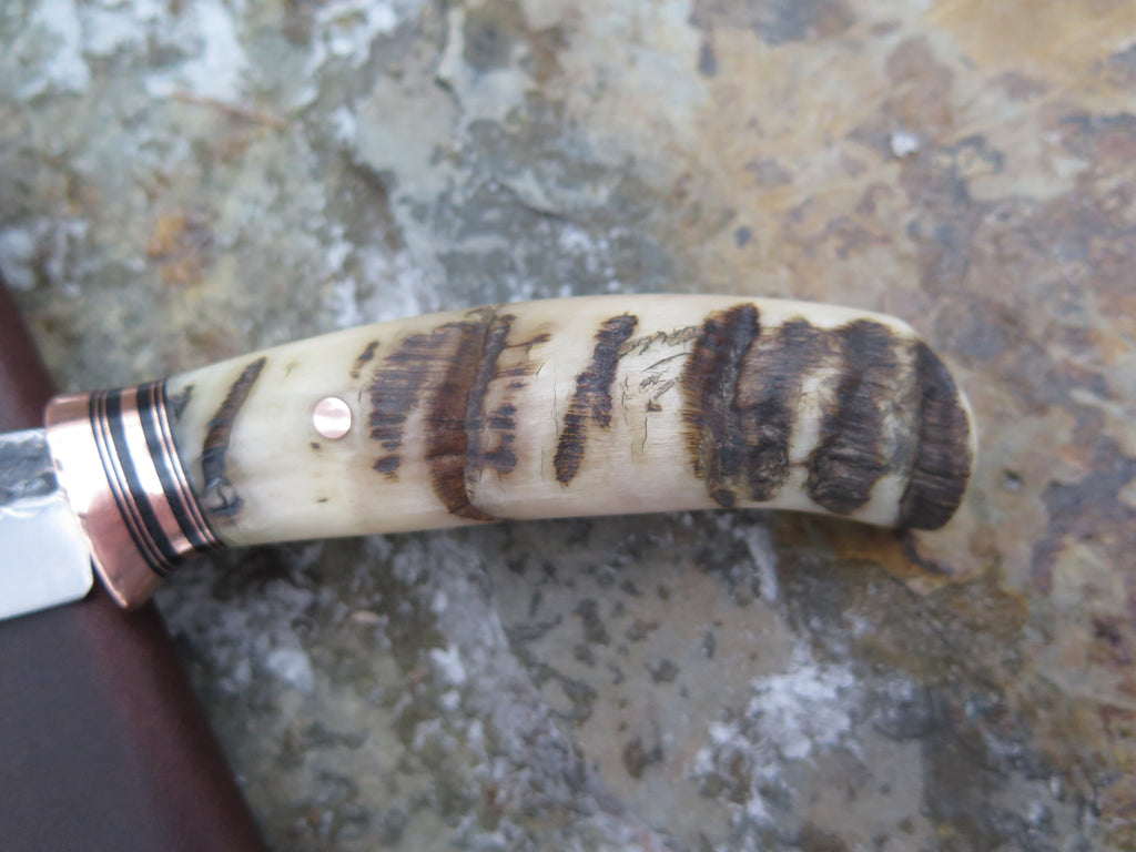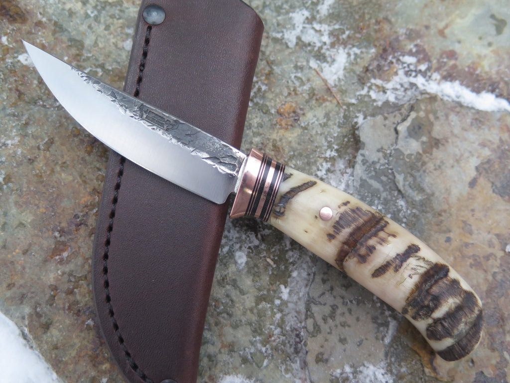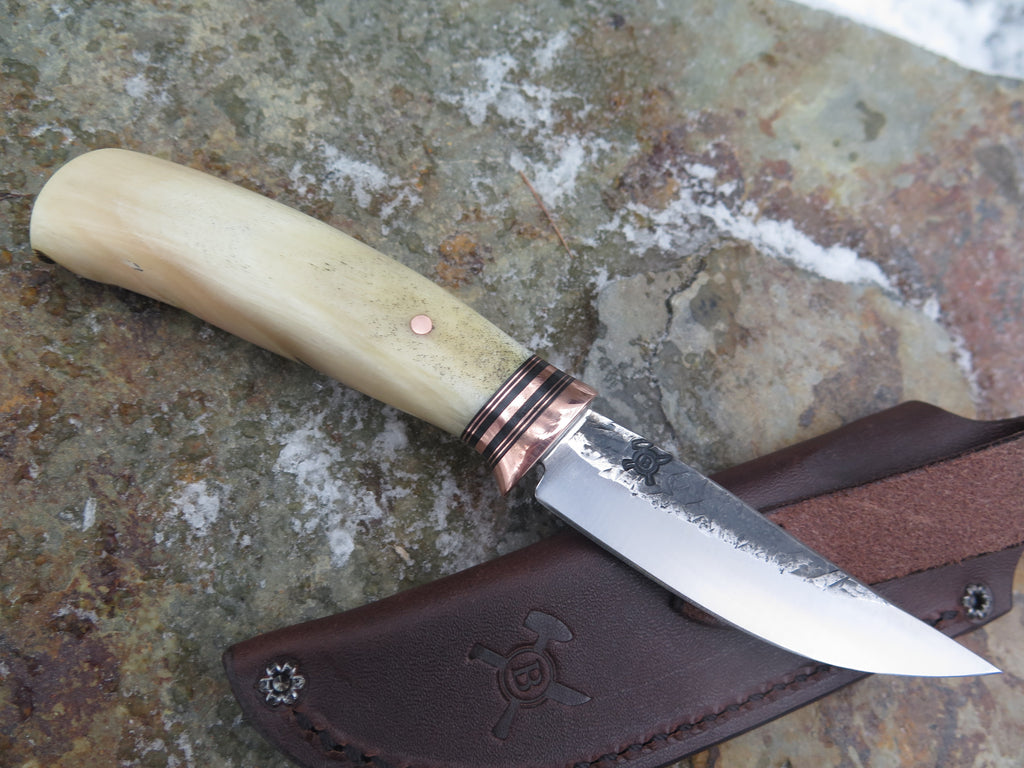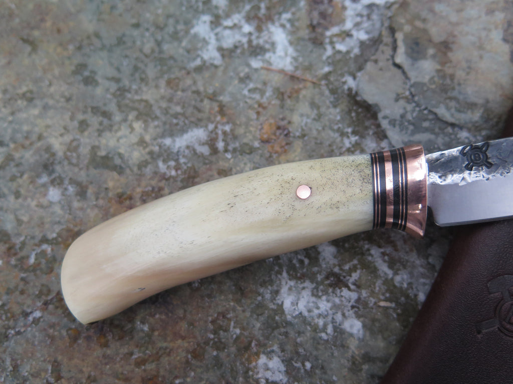 This incredible new Pintail from Behring Made© is hand forged from 1/8" thick high carbon tool steel and it measures 3 1/2" from tip to guard with a razor sharp hollow grind and our hammermark finish. The copper guard is soldered in place above black fiber and brass spacers with an incredible Dall's Sheep horn handle. The overall length measures 7 1/2" and it comes in a classic belt pouch sheath.