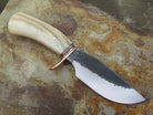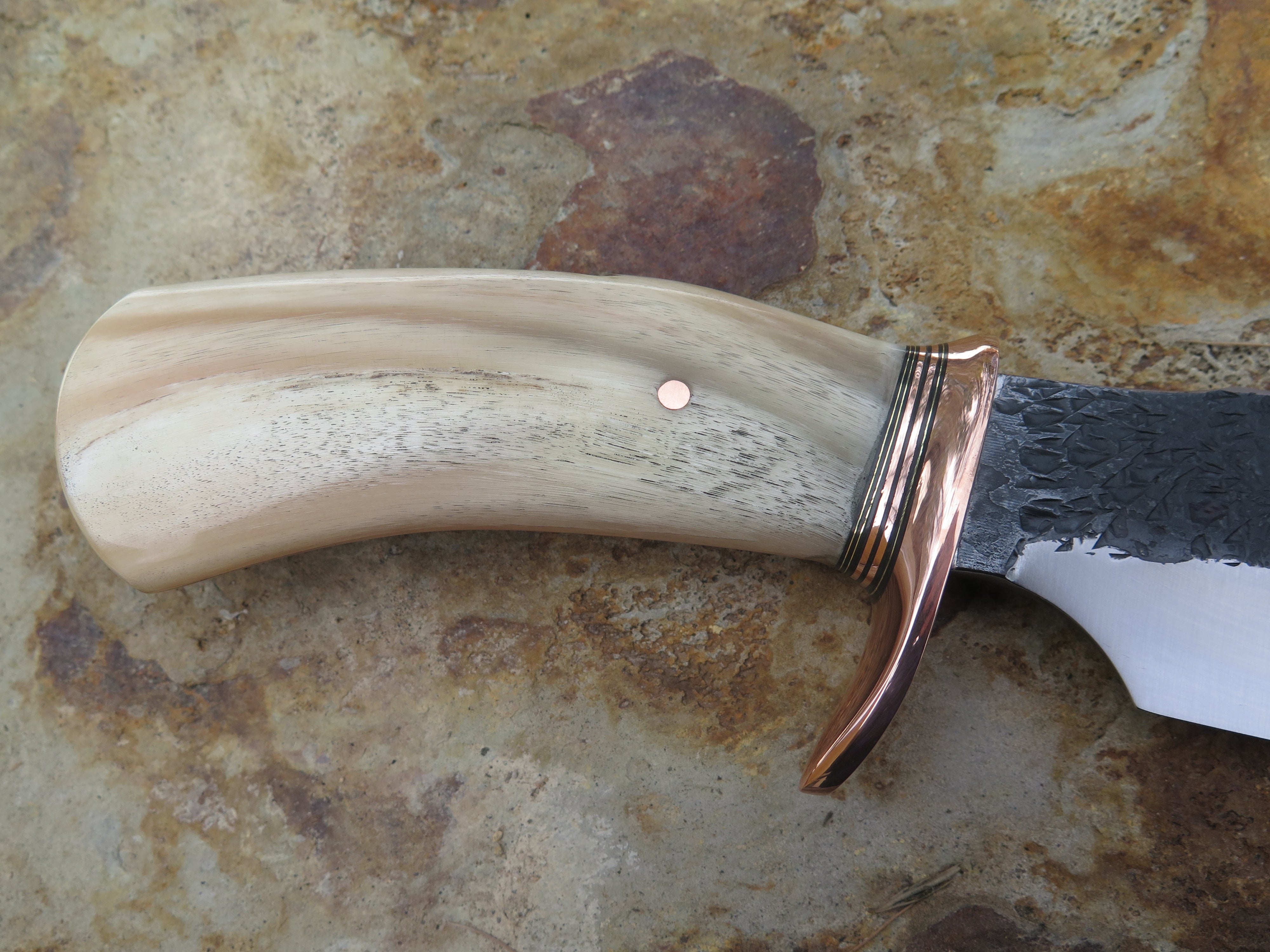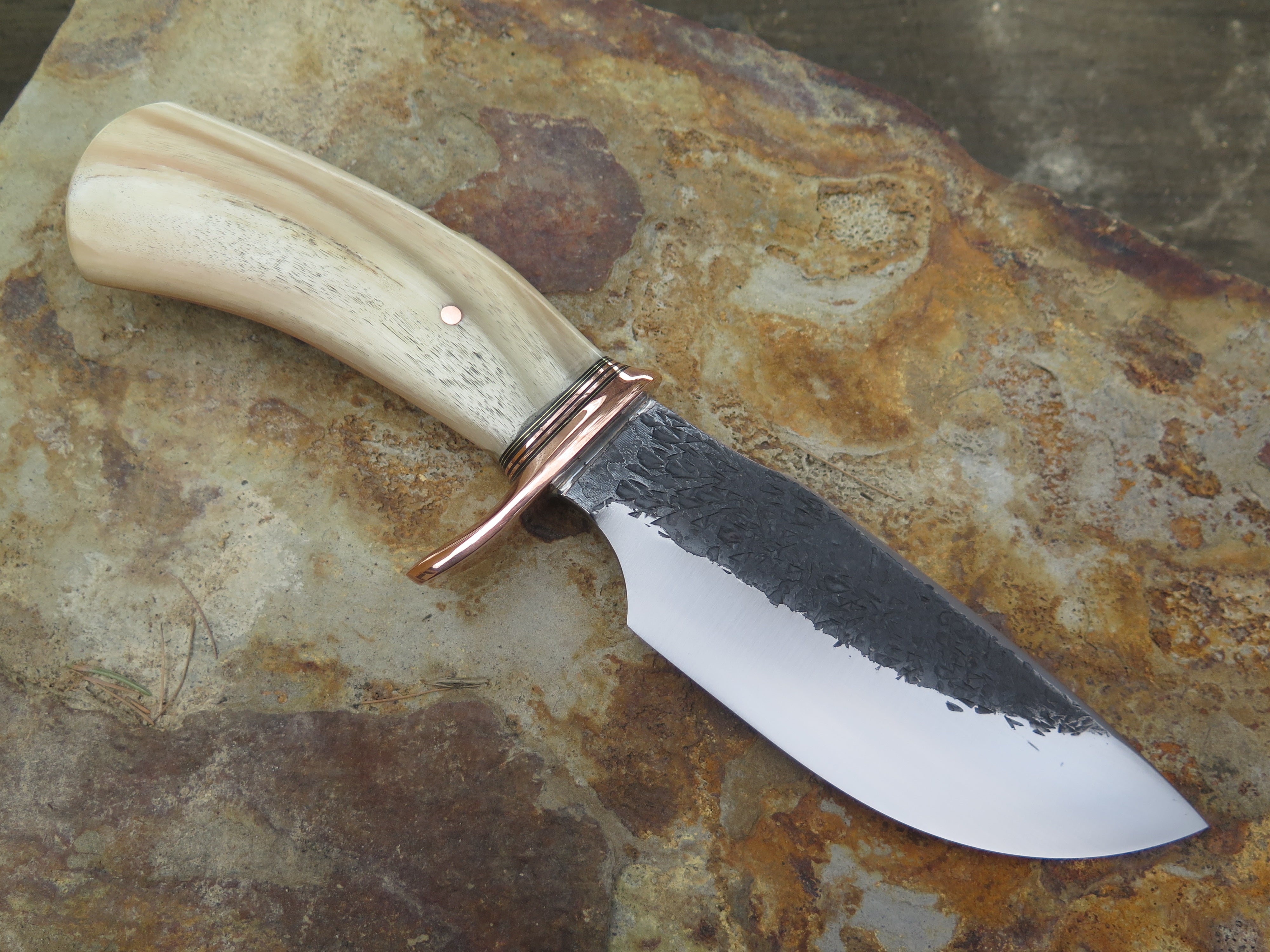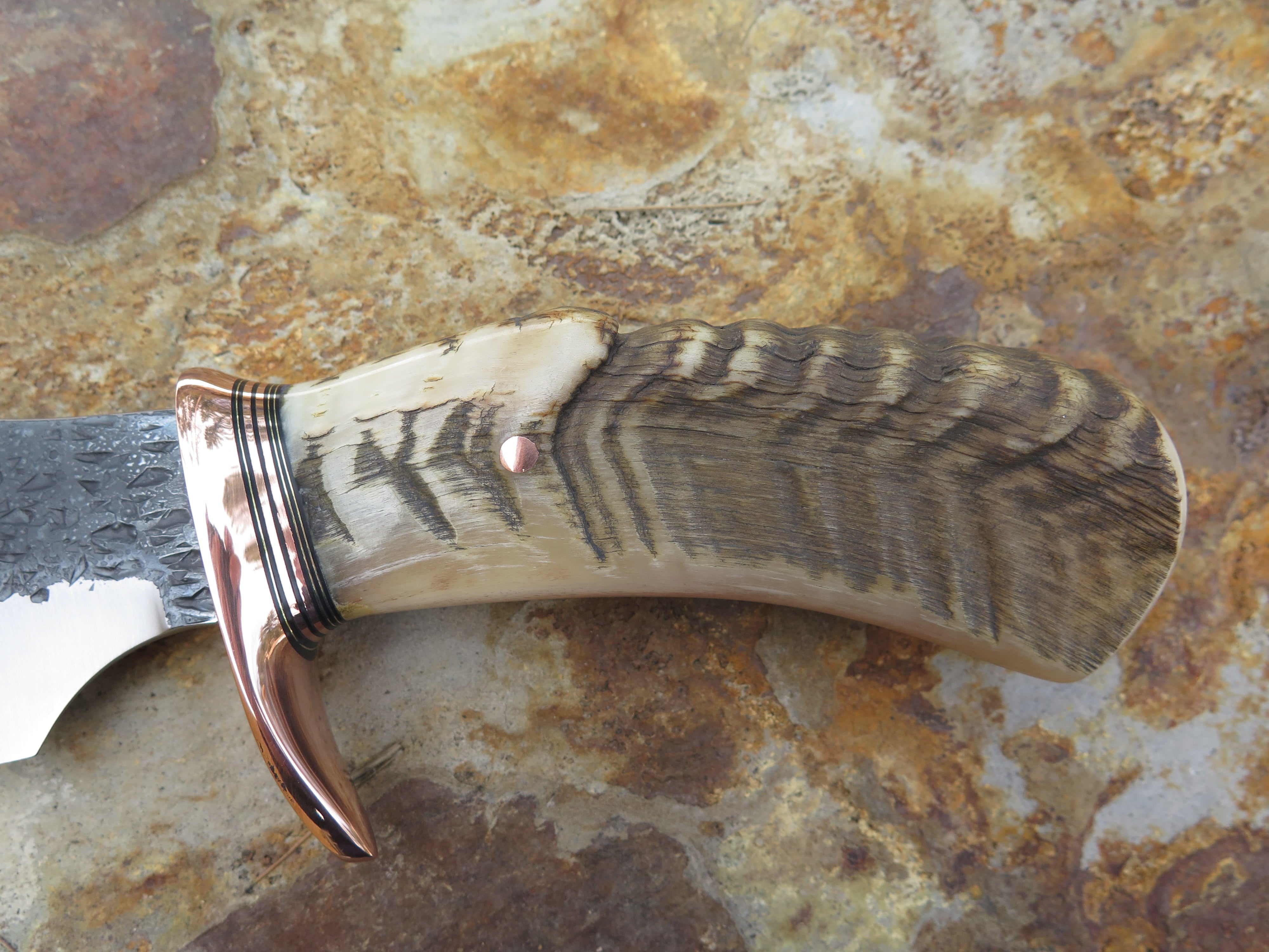 This monster of an Alaskan from Behring Made© is hand forged from 3/16" thick high carbon 01 tool steel measures 6" from tip to guard with a razor sharp hollow grind and our hammermark finish. The forged half-s copper guard is soldered in place above black and copper spacers as well as an aggressive textured Dall's sheep horn handle which is also pinned through the tang with copper. The overall length measures just over 10 3/4" and it will come in a sheep-textured custom sheath from Warlander Leather.