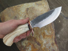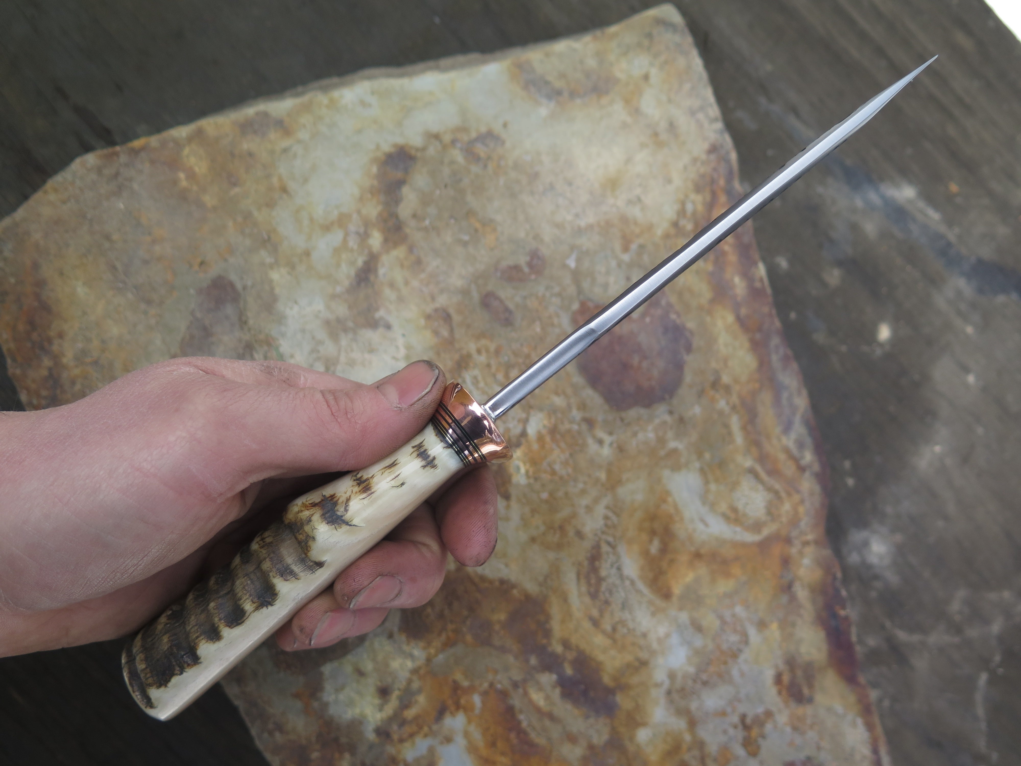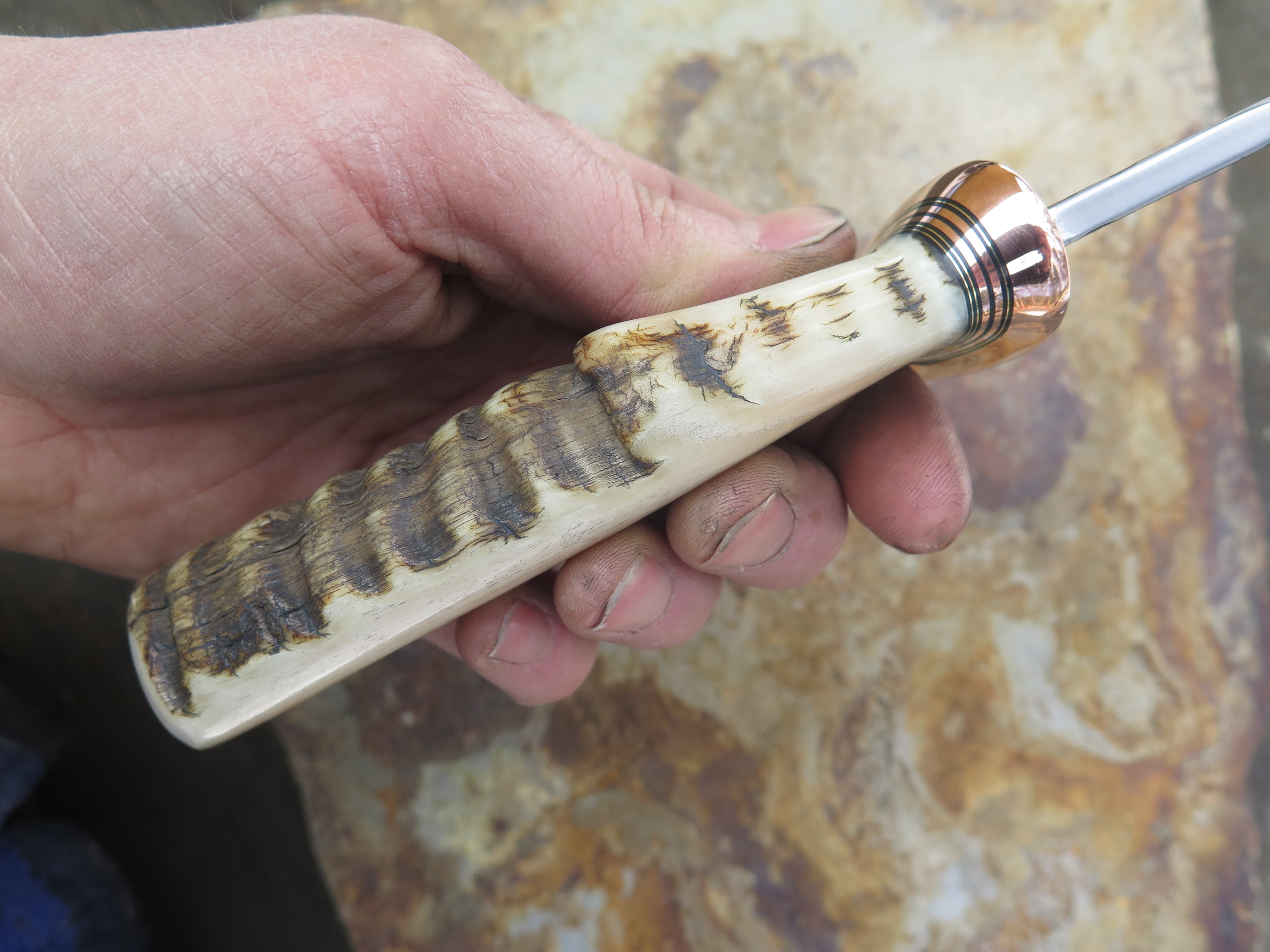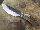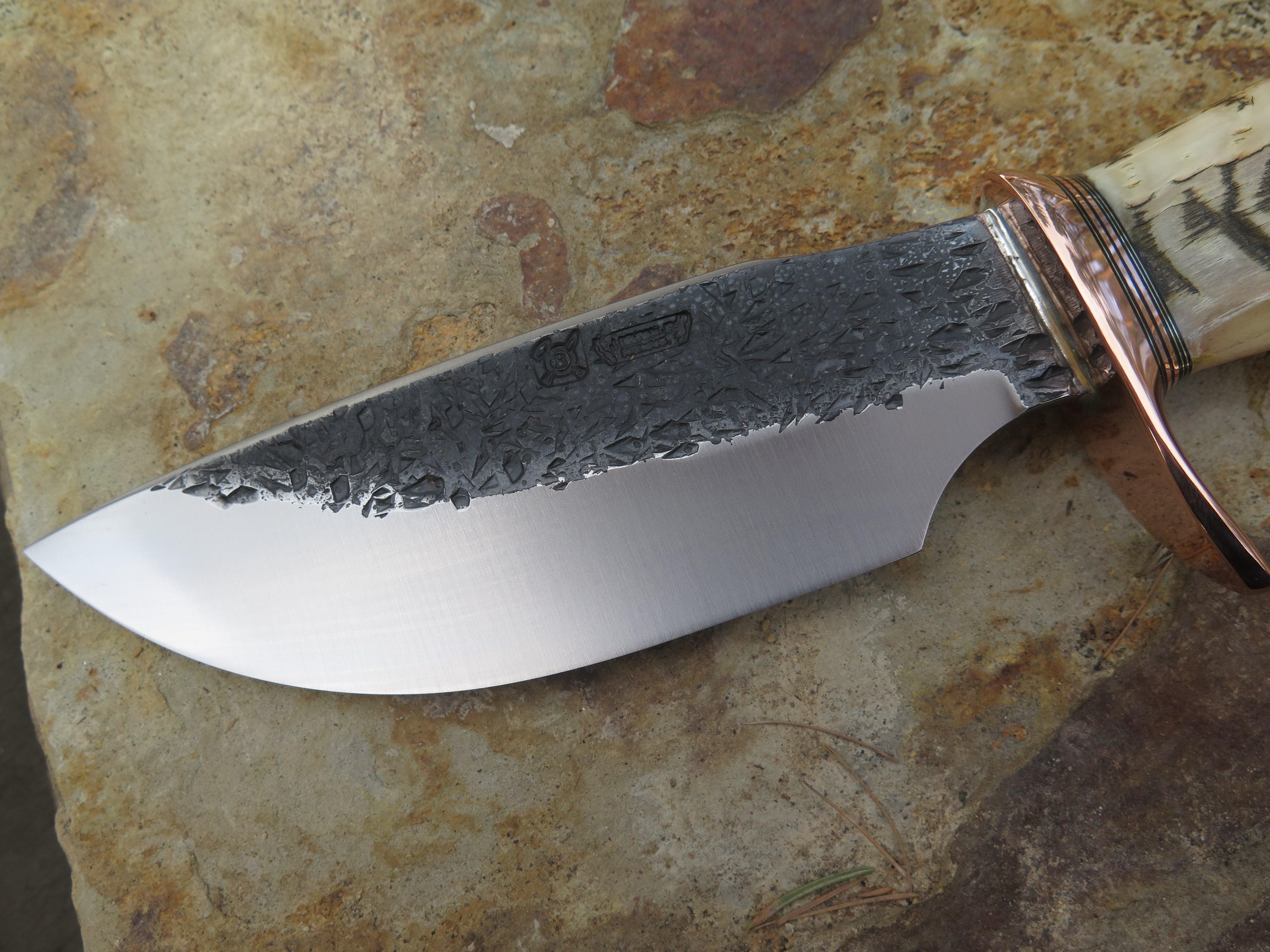This monster of an Alaskan from Behring Made© is hand forged from 3/16" thick high carbon 01 tool steel measures 6" from tip to guard with a razor sharp hollow grind and our hammermark finish. The forged half-s copper guard is soldered in place above black and copper spacers as well as an aggressive textured Dall's sheep horn handle which is also pinned through the tang with copper. The overall length measures just over 10 3/4" and it will come in a sheep-textured custom sheath from Warlander Leather.