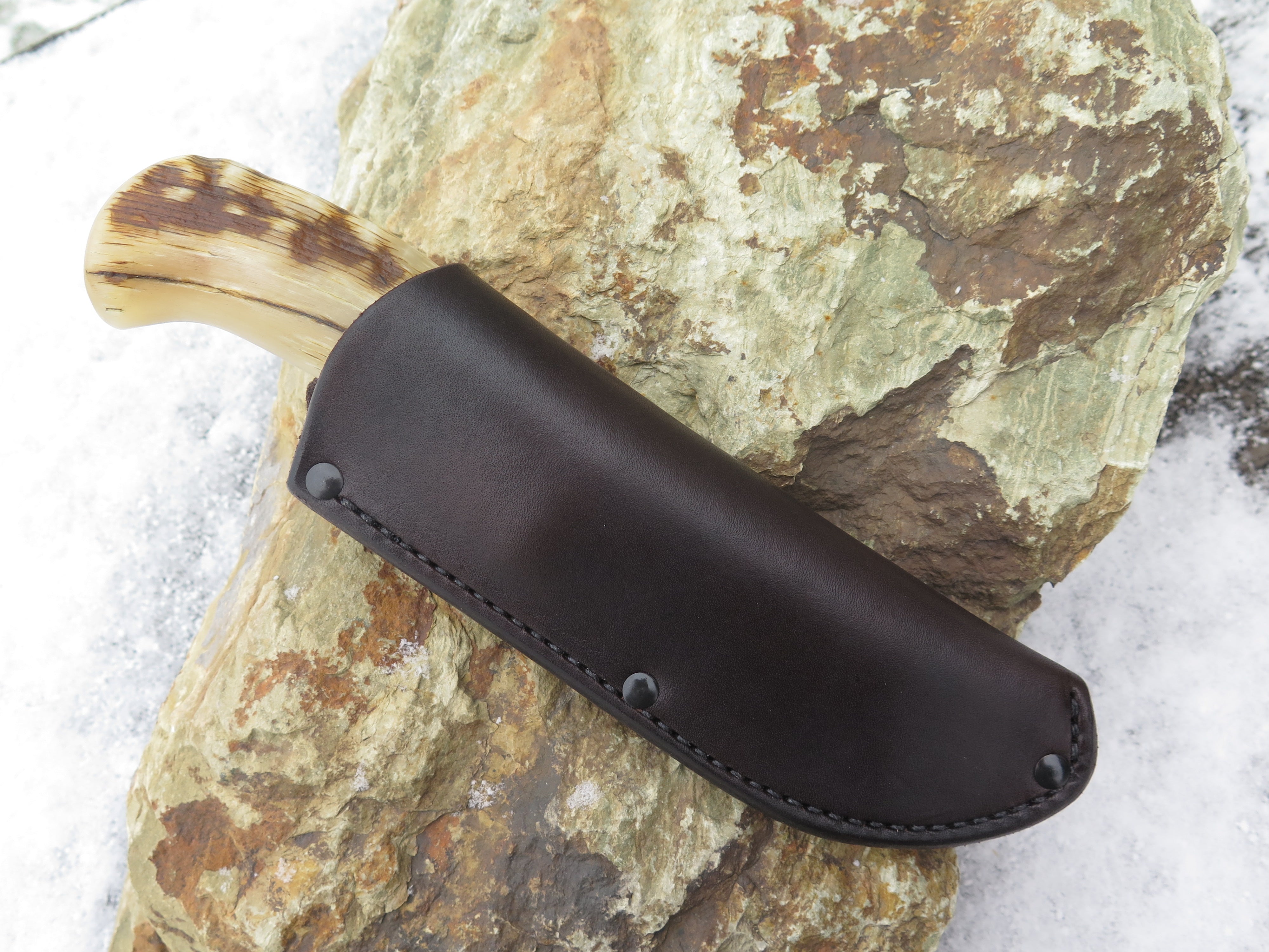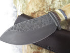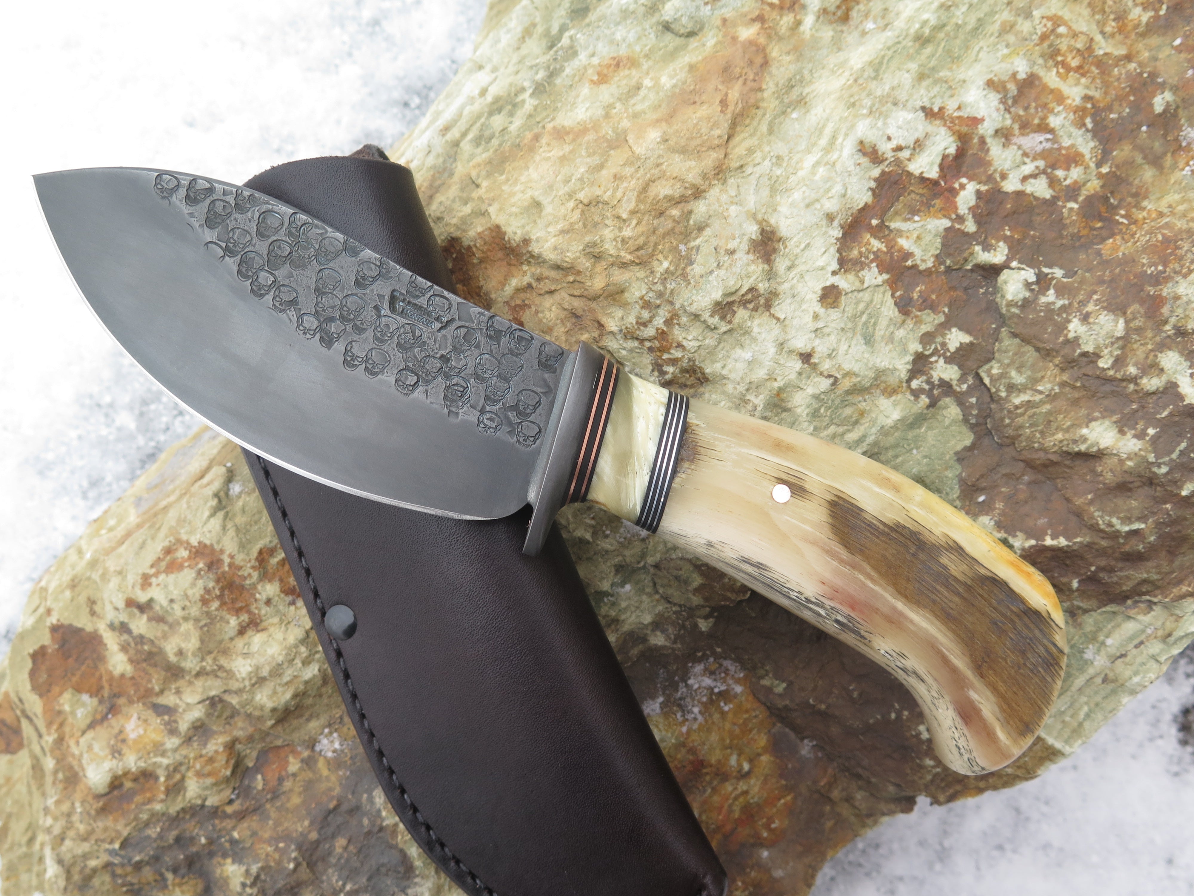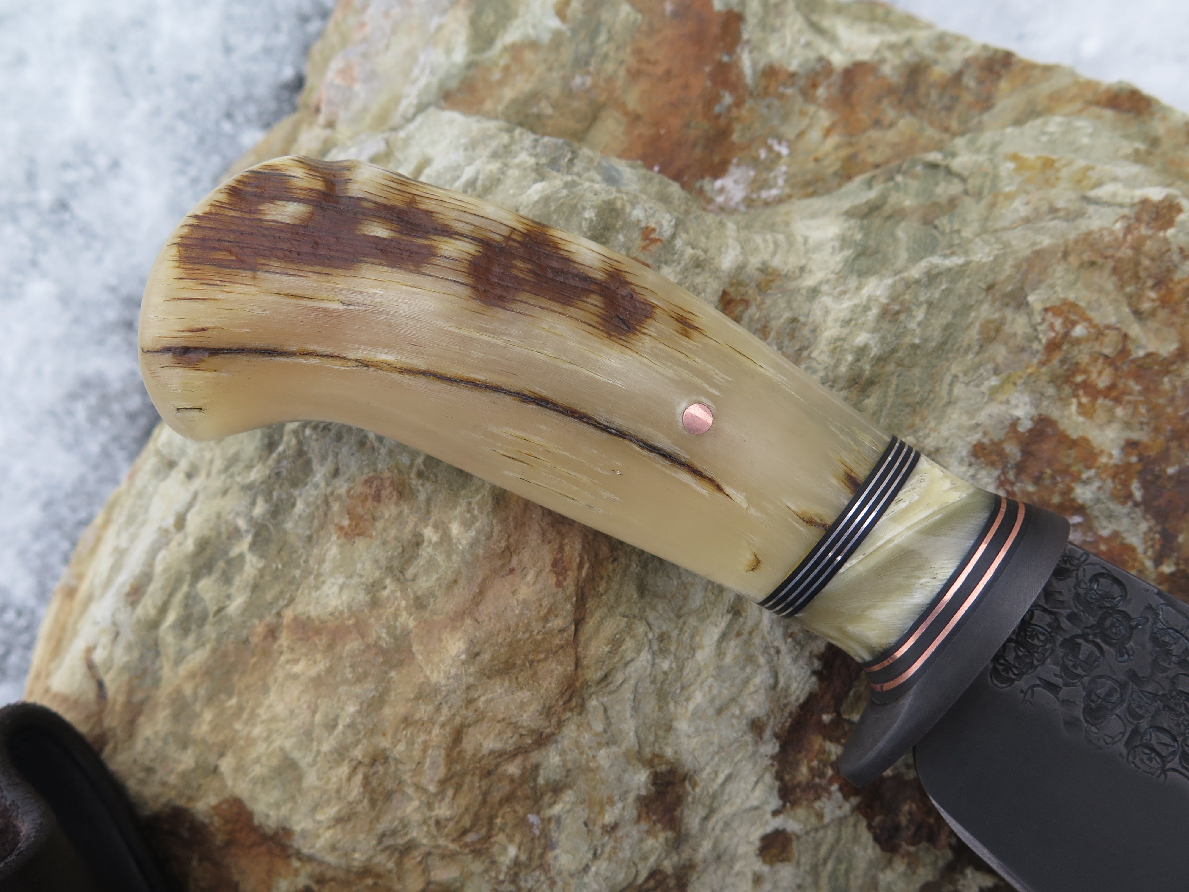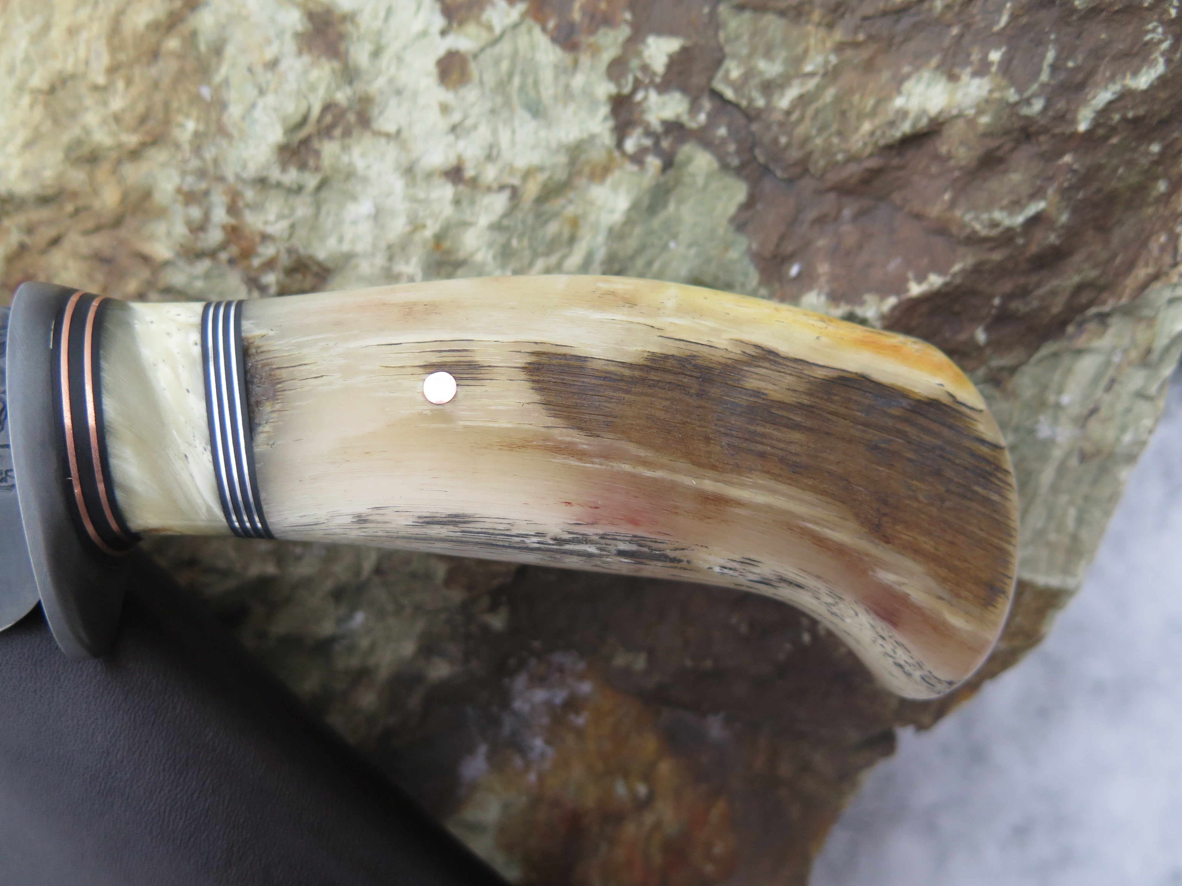 This incredible new Nessmuk from Behring Made™ is LOADED with options! The blade is hand forged from 3/16" thick high carbon 01 tool steel and measures 4 1/2" from tip to guard with a razor sharp hollow grind, our ghost skull hammermarks as well as a forced patina blued finish. The blued steel guard is soldered in place above black fiber, copper, aluminum and premium musk ox boss spacers as well as the Dall's Sheep horn handle that we pinned with copper. Overall length measures 9 1/8" and it comes in a Warlander Leather pouch sheath. *Material figure subject to vary