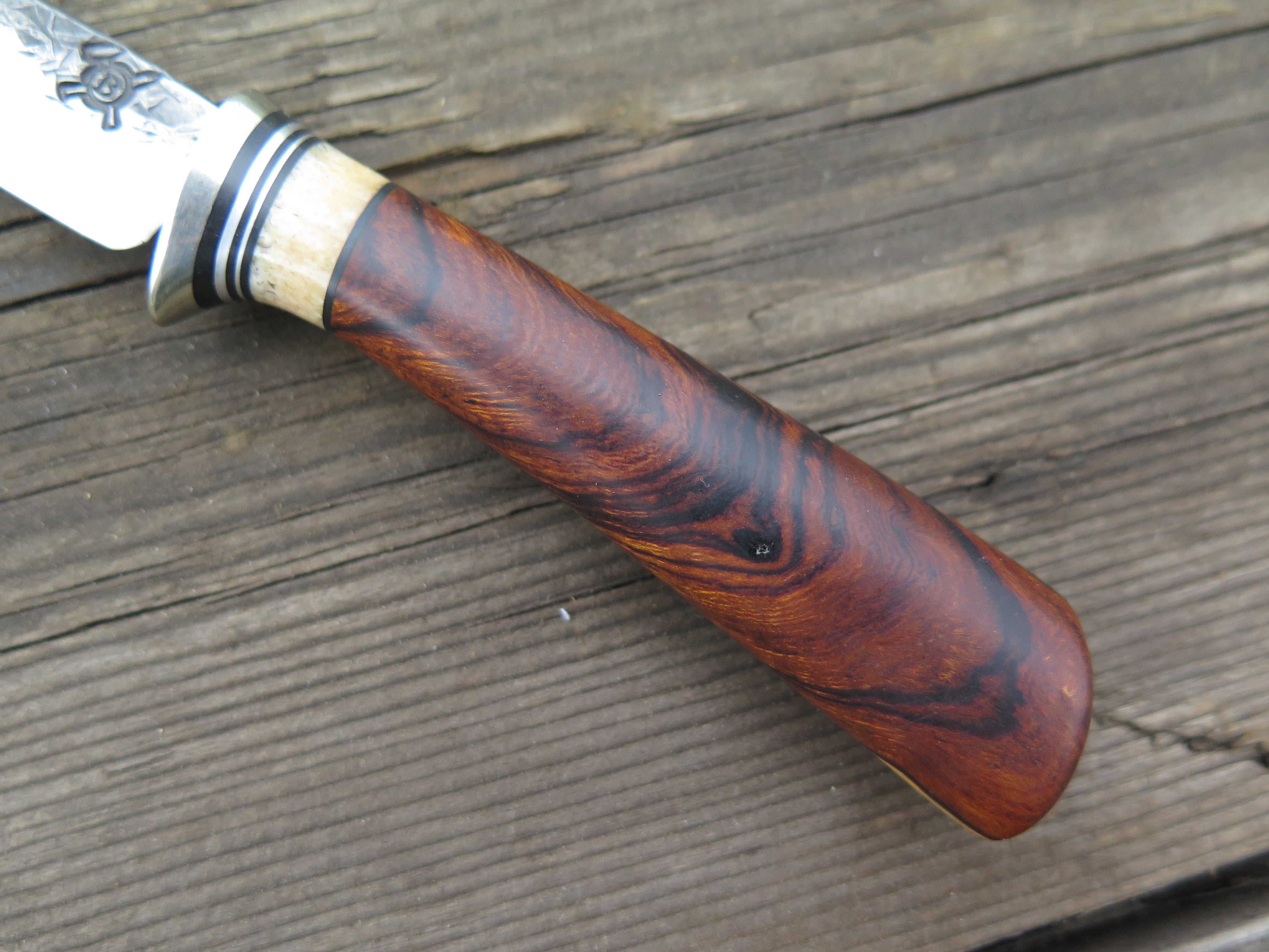 This beautiful new Pocket Knife from your boys at Behring Made™ is hand forged from 1/8" thick high carbon 01 tool steel and it measures 2 1/2" from tip to guard with a razor sharp hollow grind and our hammermark finish. The nickel silver guard is silver soldered in place above black fiber, aluminum and fossil walrus ivory spacers as well as a desert ironwood handle with an astounding blonde patch of sapwood. The overall length measures 5 3/4" and it comes in a custom pocket sheath from Warlander Leather.