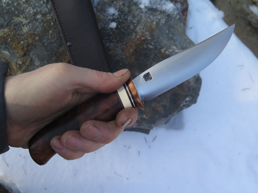 This beautiful Trout and Bird from Behring Made© is entirely handmade starting with the 440c stainless blades that measure just about 4 3/4" from tip to guard with a razor sharp convex grind. The copper guard is soldered in place above black and white fiber, copper and ancient mammoth ivory spacers that yield a wonderful contrast against the premium desert ironwood burl handle. The overall length measures about 9 1/2" and it comes guaranteed for life in a classic leather belt sheath.