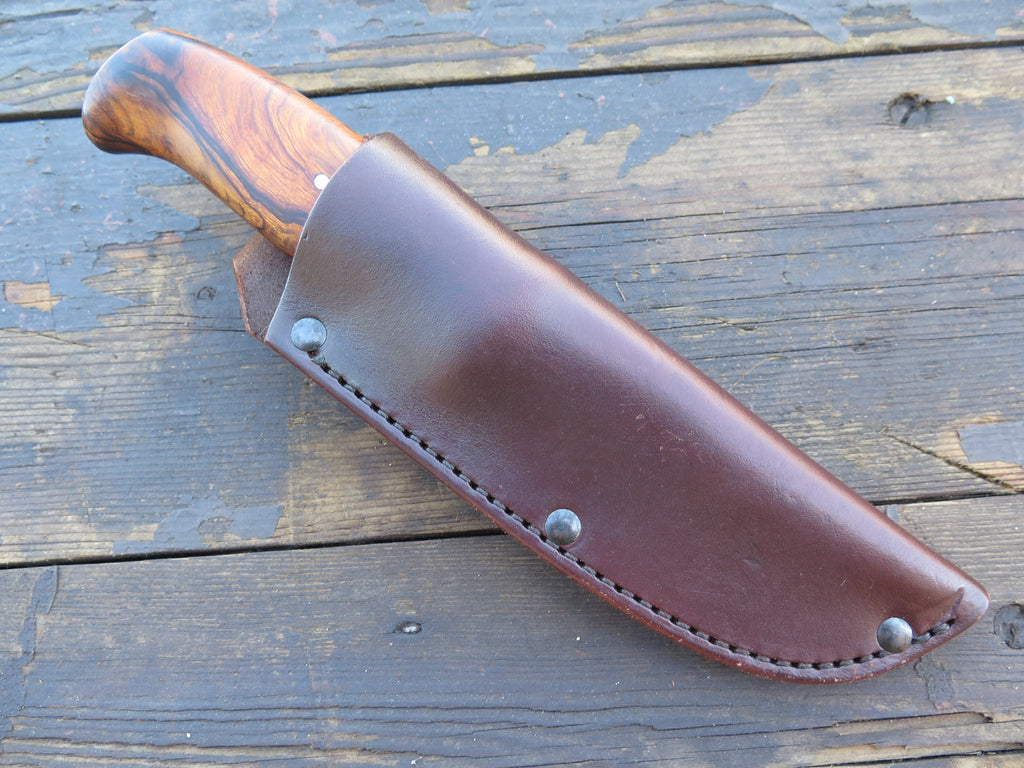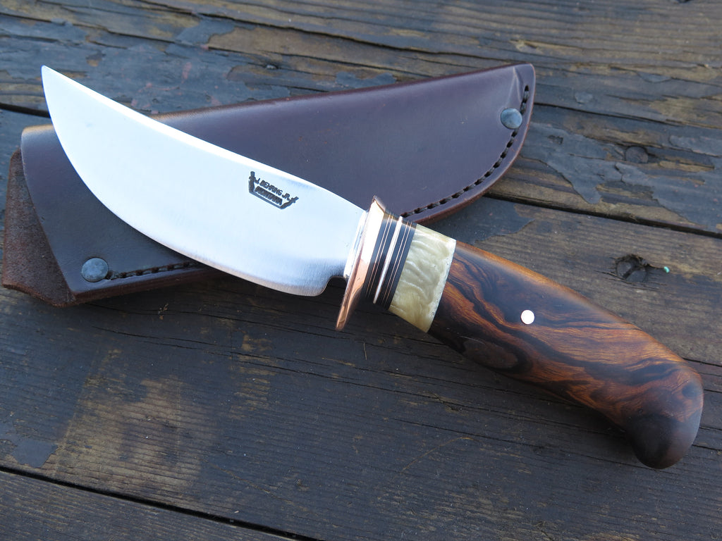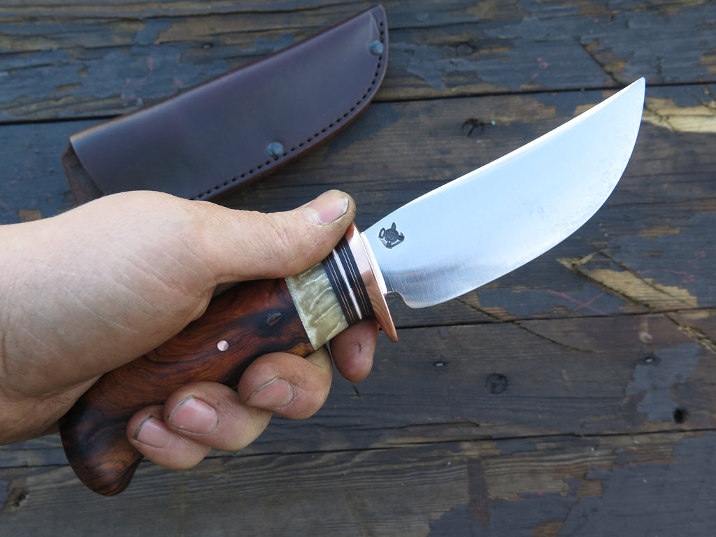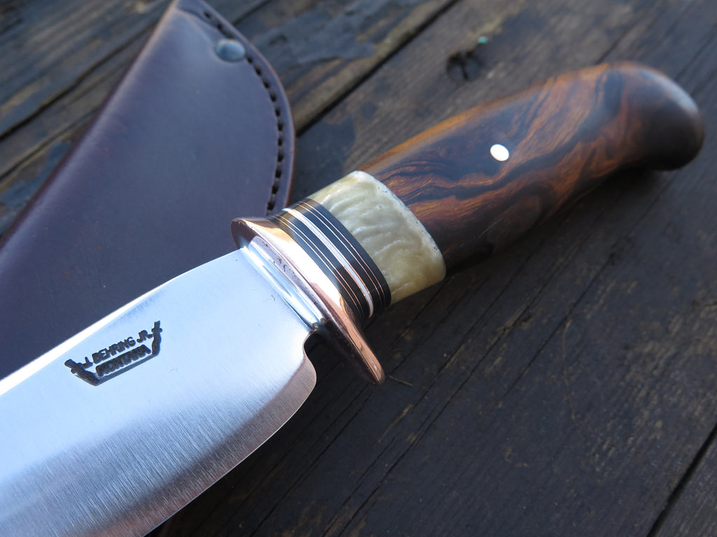 The serious hunter should carry tools that equate the passion and care that goes into each hunt. Enter the Desert Ironwood and Ox Boss Hunter. This Behring Made is hand forged from high carbon 01 tool steel and measures 4 5/8" from tip to guard with a razor sharp convex grind. The copper guard is soldered in place above black, white, copper and musk ox boss spacers as well as a premium desert ironwood burl handle. The overall length measures 9 1/4" and it will ship in our Behring Made pouch style sheath.