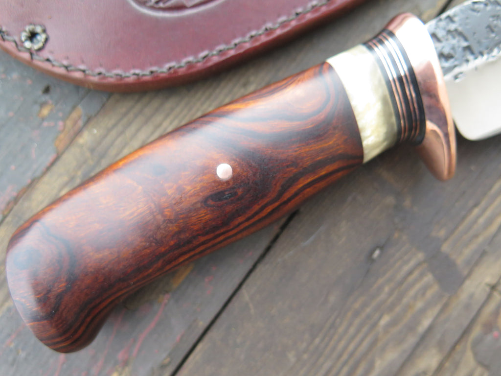 This gorgeous Behring Made hunter is hand forged from high carbon 01 tool steel and measures 4 1/2" from tip to guard with a razor sharp hollow grind and a hammermark finish. The copper guard is soldered in place above black, copper and musk ox boss spacers as well as a premium desert ironwood handle that's pinned with copper. The overall length measures 9 3/8" and it comes in our Behring Made pouch style sheath.